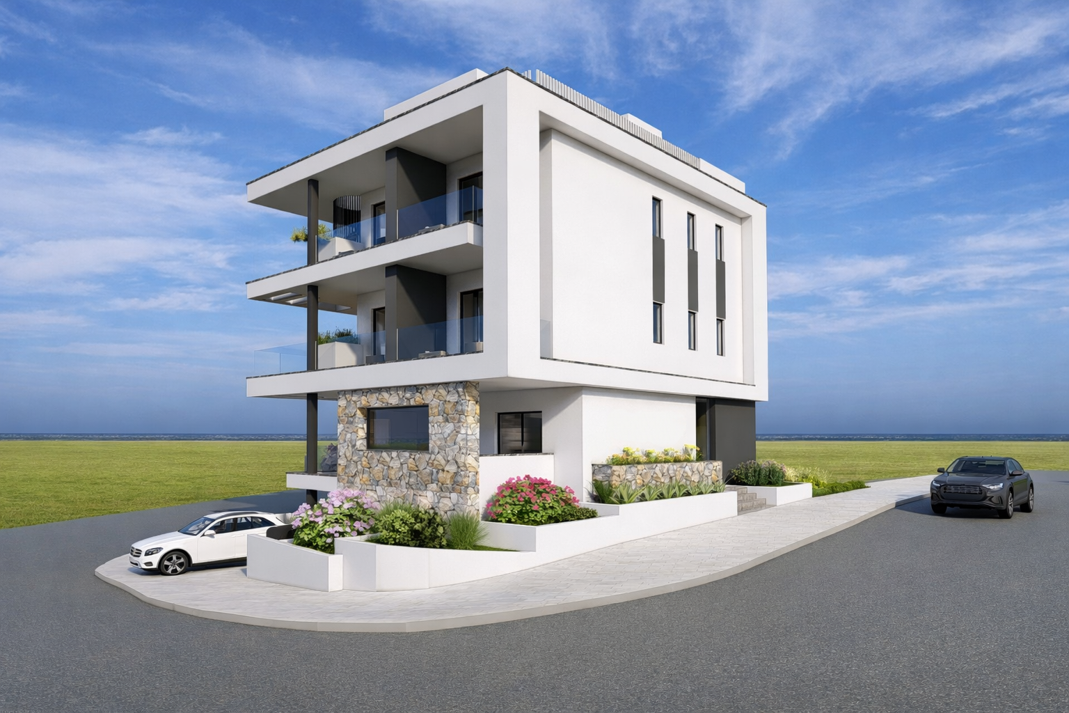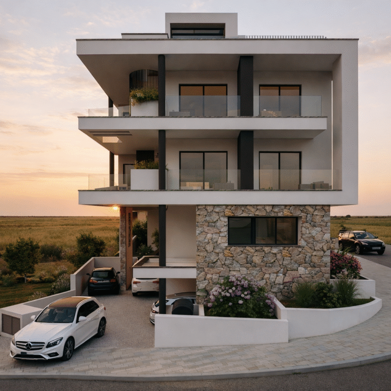 This stylish 2-bedroom apartment is located in Ayia Napa city center, close to all amenities. The building features a modern and contemporary design. Each apartment occupies the entire floor.