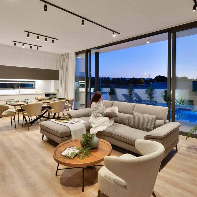 Inside, the villa features a thoughtfully designed open-plan kitchen, dining area, and living room, creating a spacious and comfortable atmosphere. An optional basement can be added for even more living space.