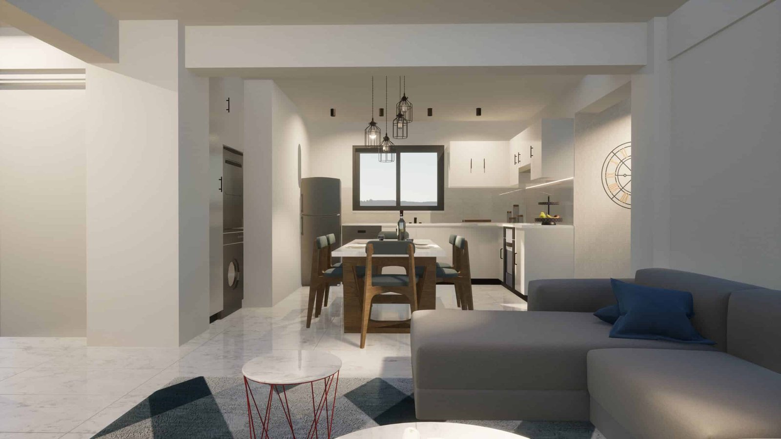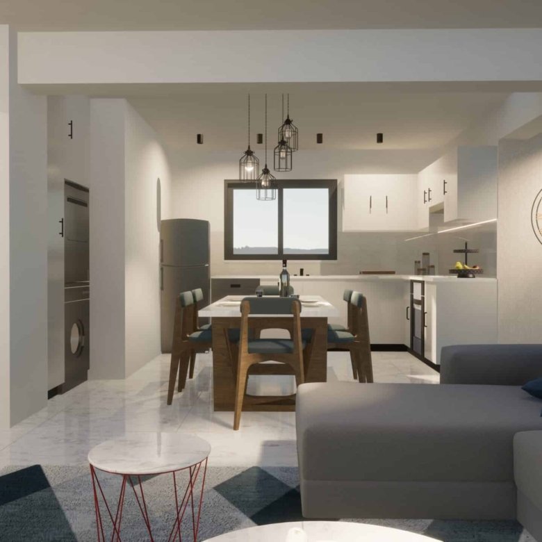 The apartment boasts tastefully designed interior. The open-plan layout allows for seamless interaction between the living room, dinning area and kitchen.