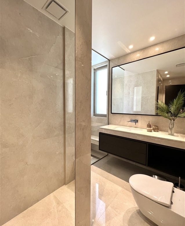 A contemporary kitchen is fitted with porcelain countertops and fully equipped with high-end Miele kitchen appliances, creating a well-lit and spacious workspace. Each bathroom is fitted with marble slabs and equipped with Villeroy & Boch prime class fixtures for a space that is both durable and tasteful.