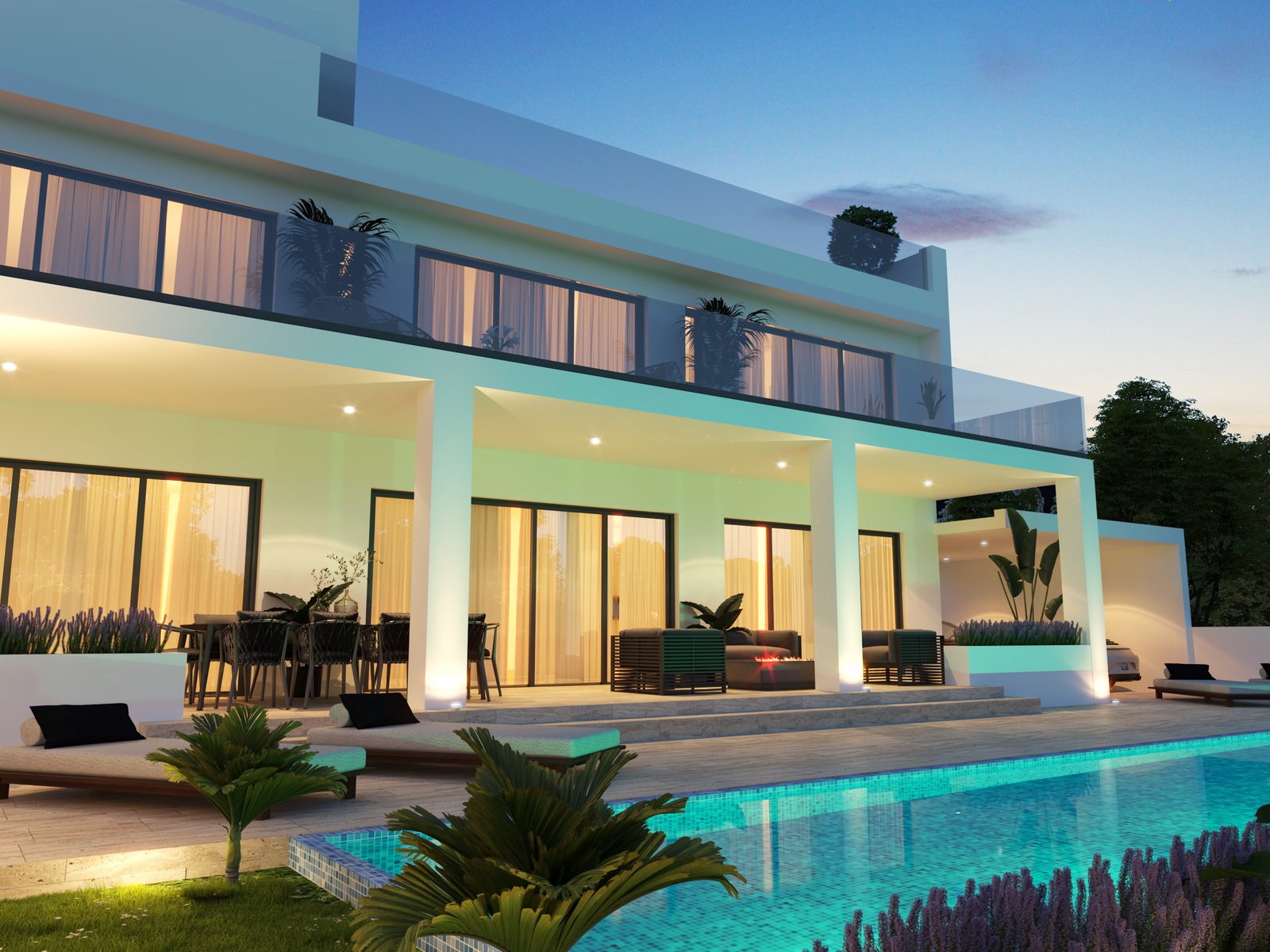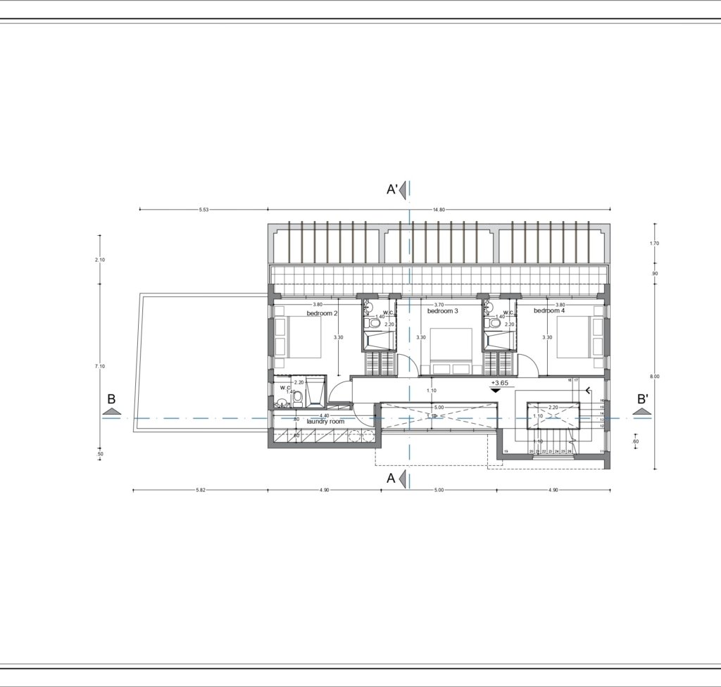 Upstairs, each bedroom is generously sized and includes its own en-suite bathroom with WC and shower. The roof garden provides breathtaking sea views and includes an additional bedroom
