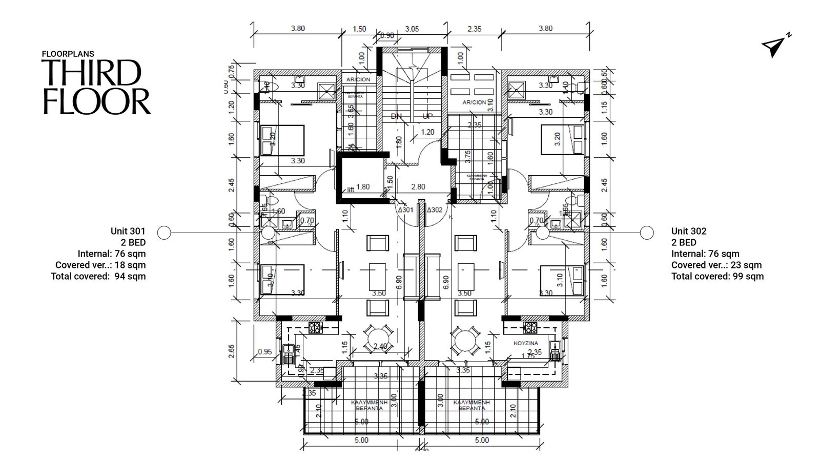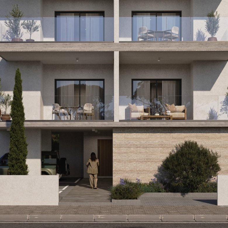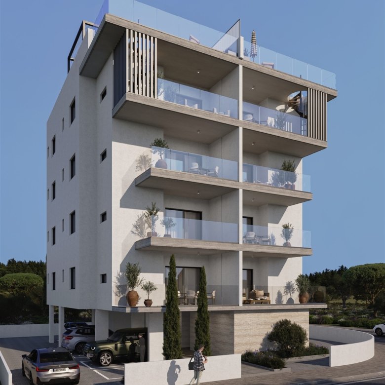 This modern apartment is located in Livadia, Larnaca, near all amenities including hotels, shops, cafes, and schools. The building features contemporary design, and the apartment offers 2 bedrooms, 2 bathrooms, and a covered veranda.