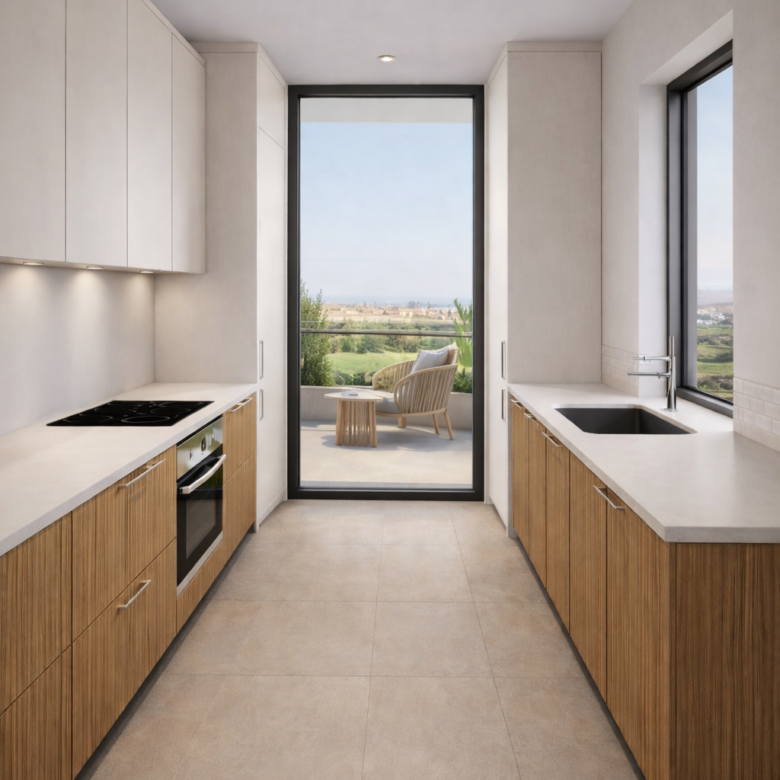 This modern project is located in Livadia, Larnaca, close to all amenities. The apartment consists of 2 bedrooms, 2 bathrooms, and a covered veranda. The gated complex features a communal swimming pool.