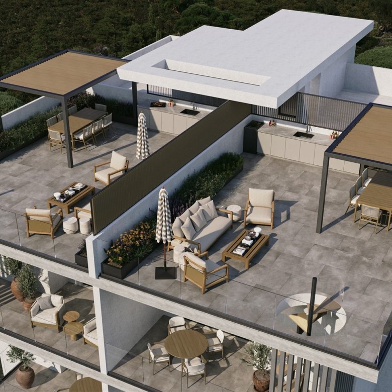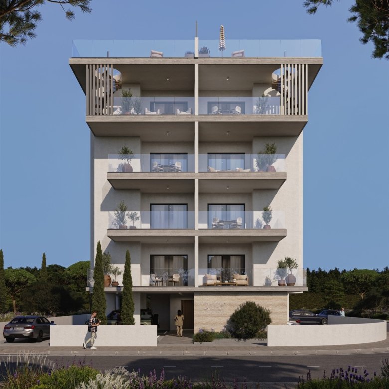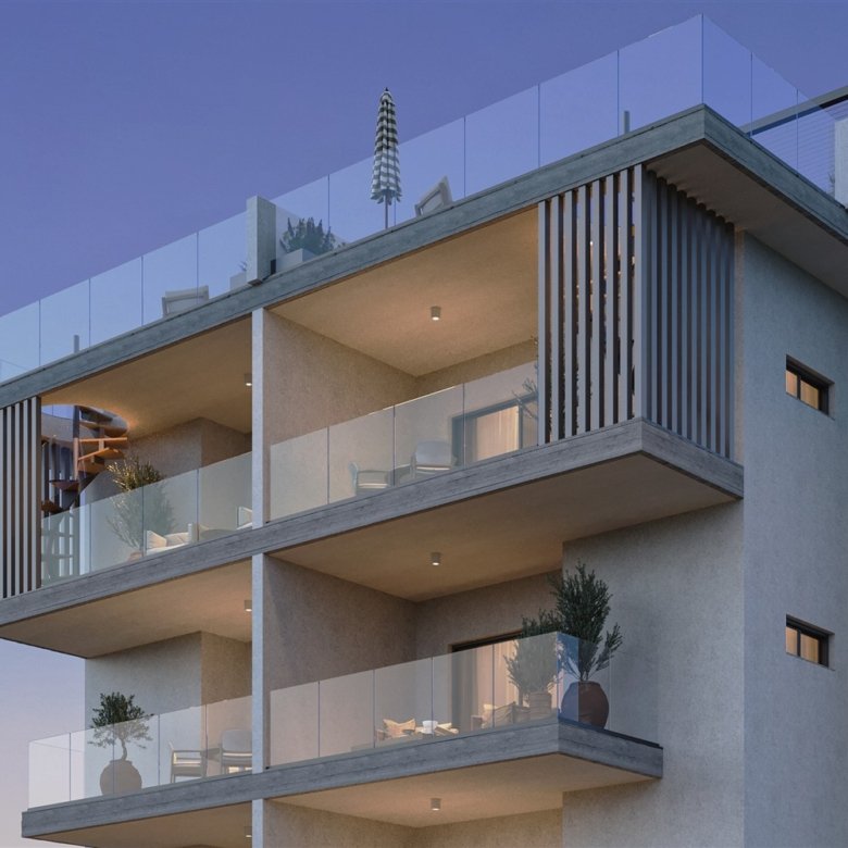 This modern apartment is located in Livadia, Larnaca, near all amenities, including hotels, shops, cafes, and schools. The building features contemporary design, and the apartment offers 2 bedrooms, 2 bathrooms, a covered veranda, and a private roof garden.