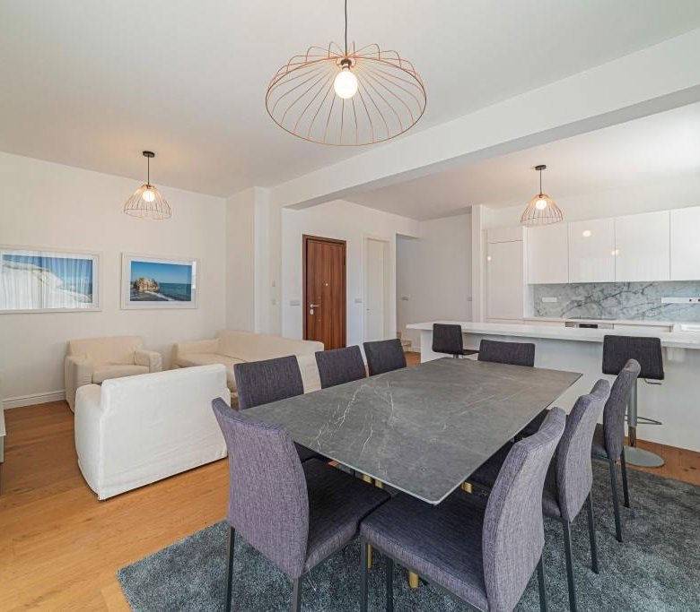 Open-plan living and dining areas flow out through floor-to-ceiling windows onto a large balcony with views of neighboring mountains and the Mediterranean Sea.