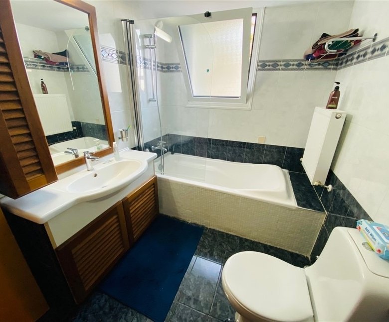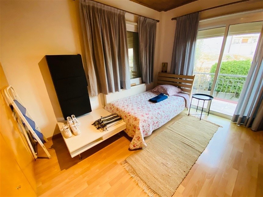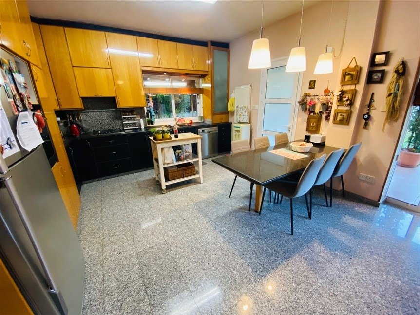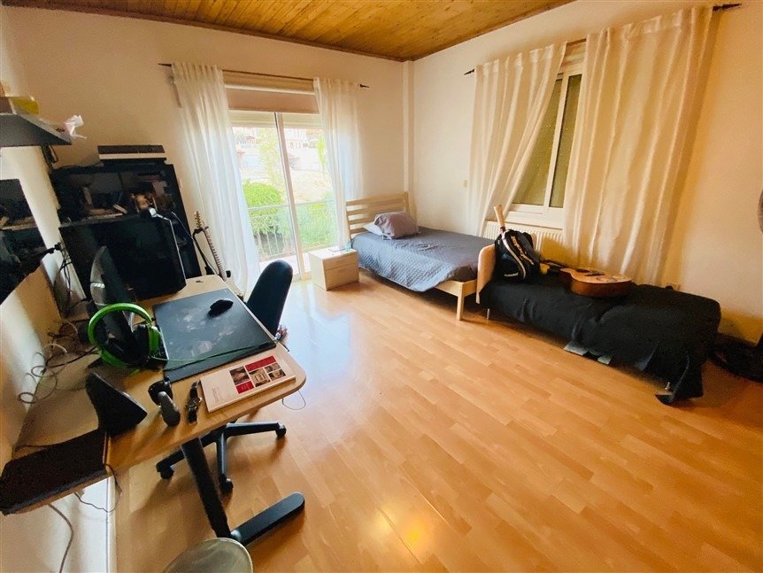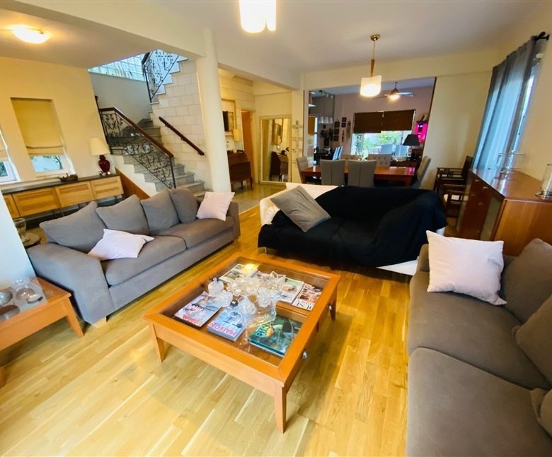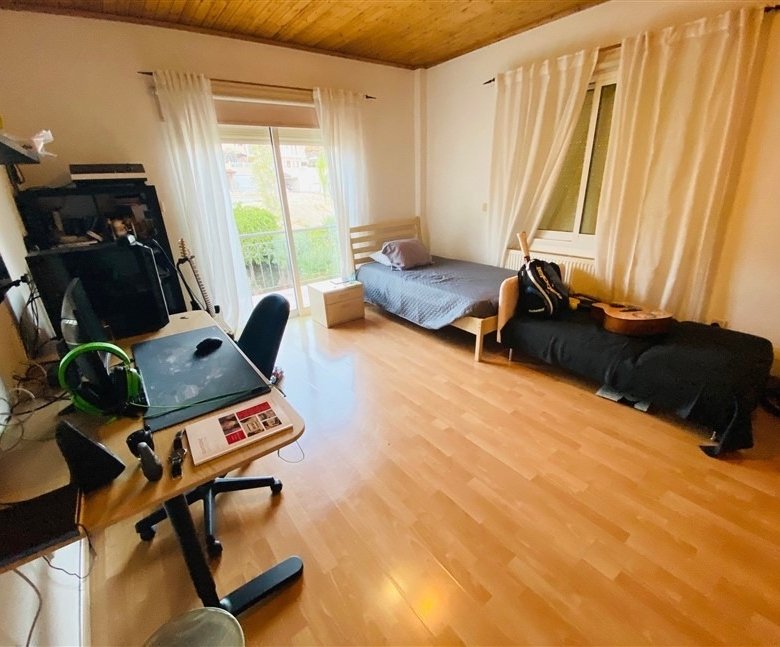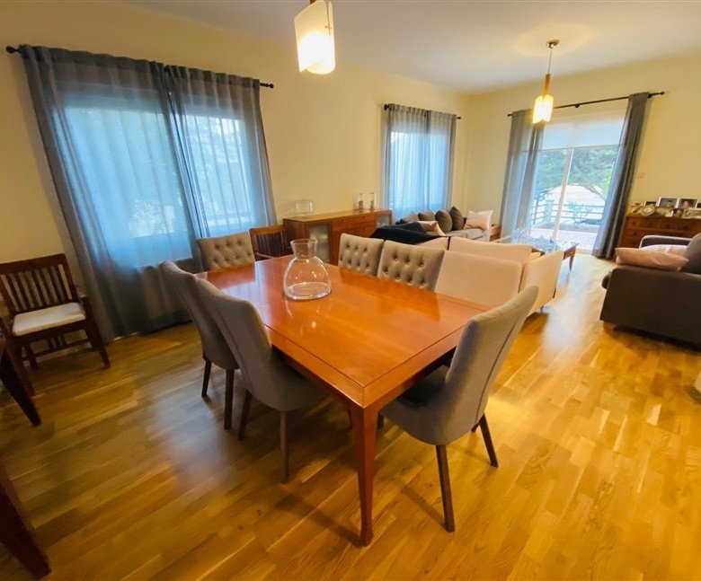 It consists of two floors: on the ground floor there is an entrance area, an open-plan kitchen connected with a sitting and dining area, a guest WC and a covered veranda with a garden view. On the first floor, there are three bedrooms (master bedroom en-suite with shower and walk-in wardrobes), a covered balcony, a family bathroom, small laundry, and uncovered verandas. Upstairs there is a spacious attic of 27 m2 which can be used as an office/playroom.
