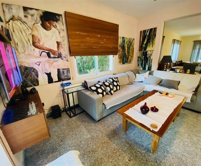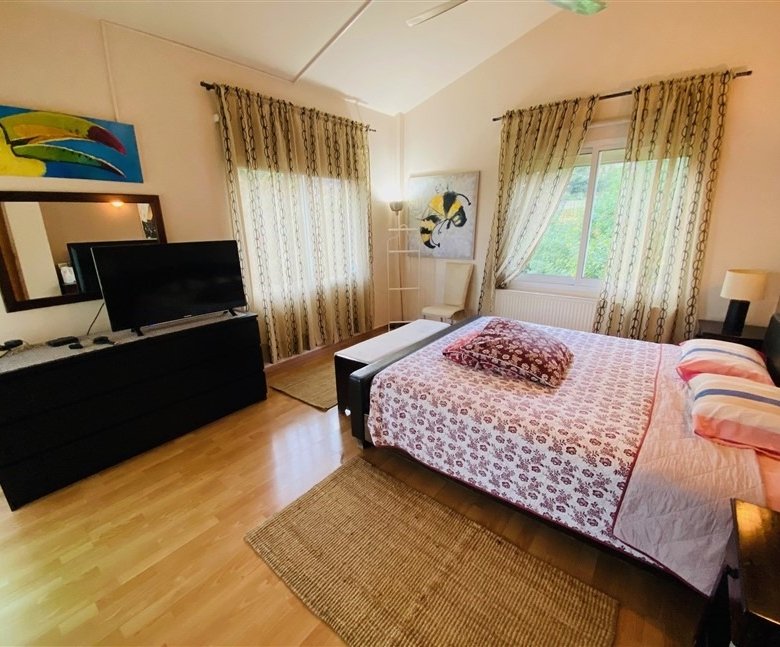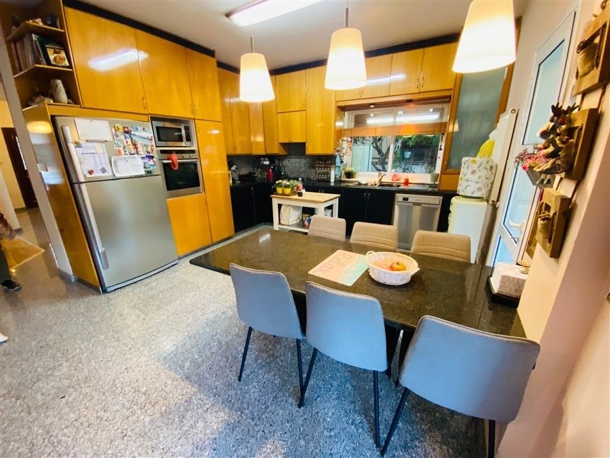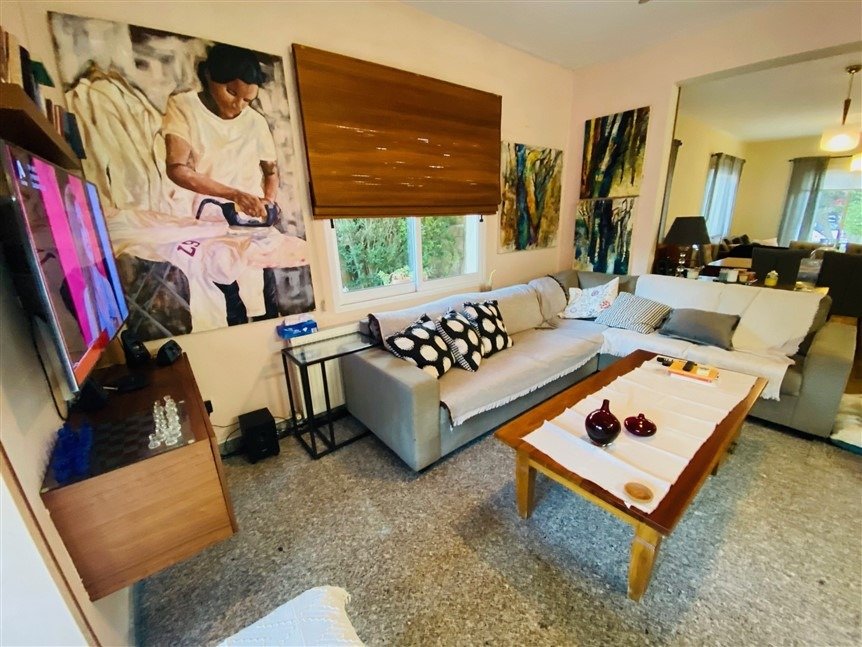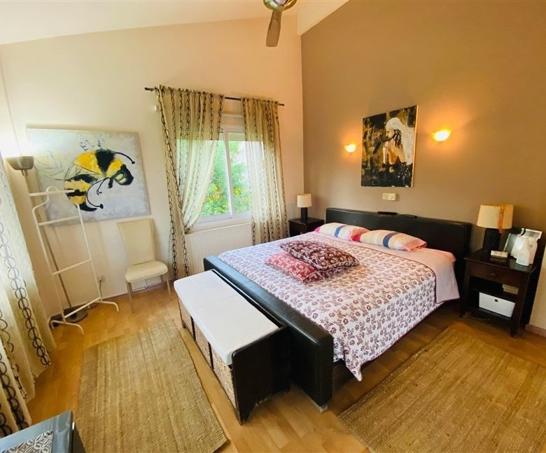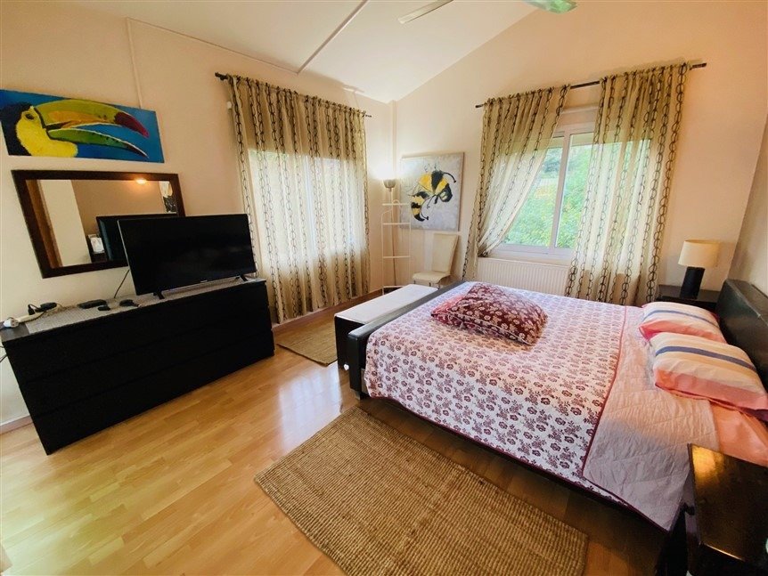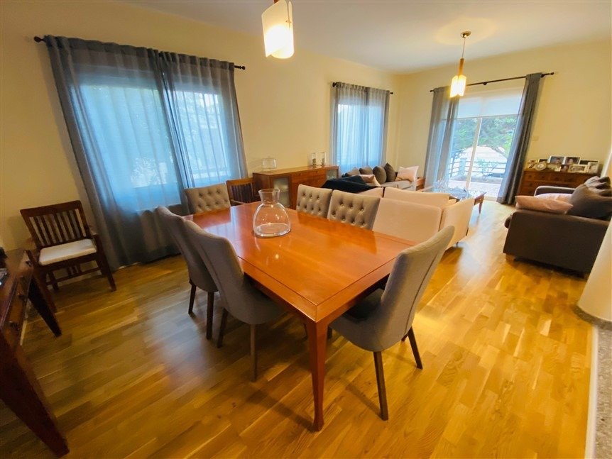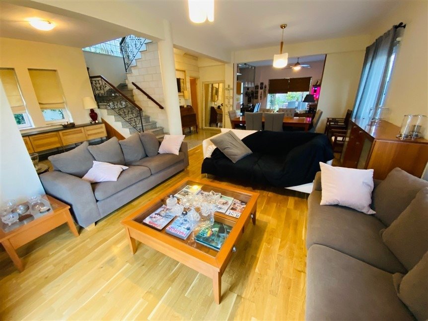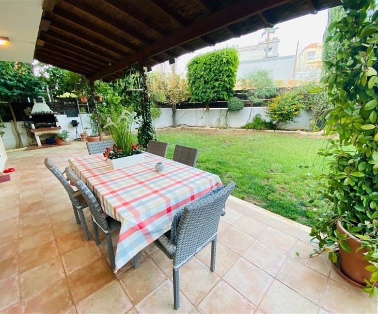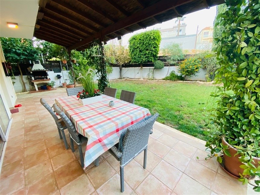 The house is available unfurnished, with air-conditioning, central heating, double-glazed windows with shutters, solar panels for hot water, granite on the ground floor, natural wood floor in the living area, laminate floor in bedrooms, and a water pressure system. Outside there is a sitting area, BBQ, 2 storages, 2 covered parking, and a mature garden with an irrigation system and water well.