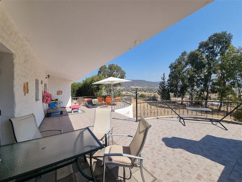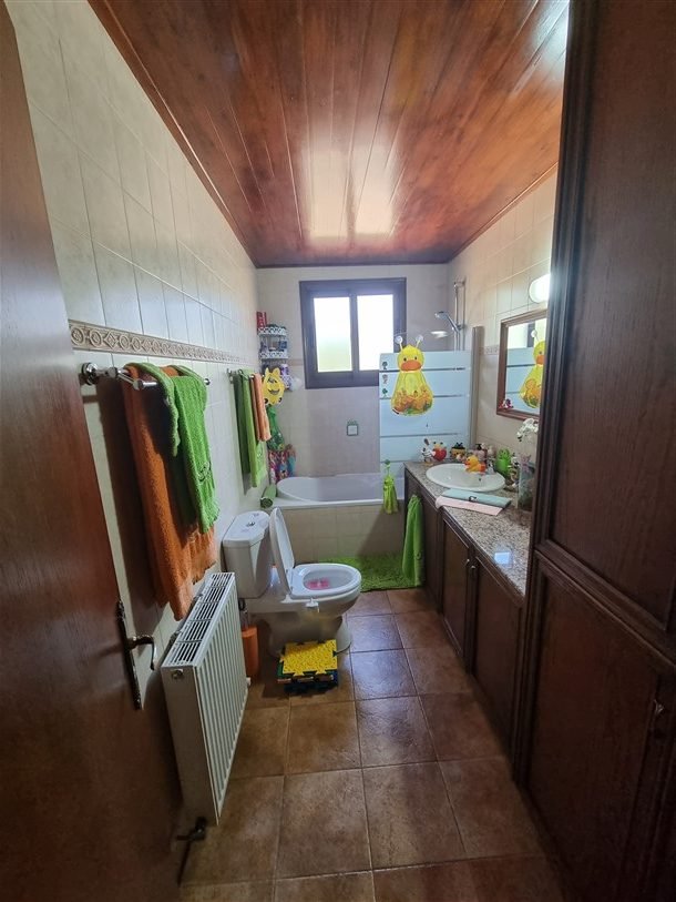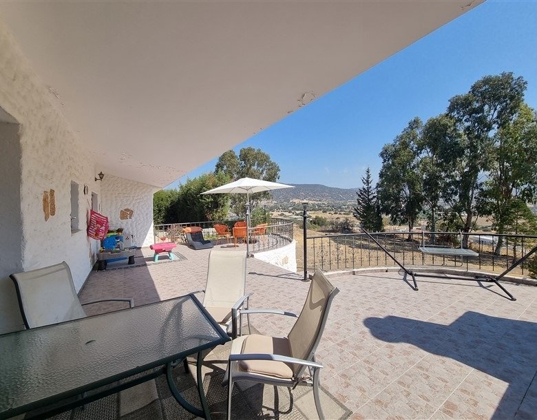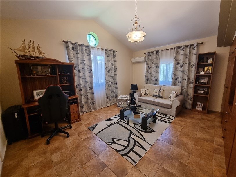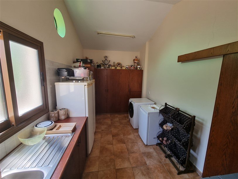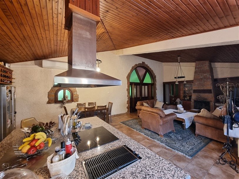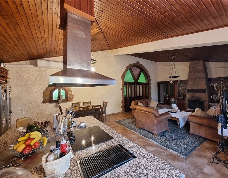 The total covered area of the house is 400 m2 and is surrounded by a large plot planted with mature trees. The garden has a big variety of fruit trees and over 50 olive trees which are watered by an automatic irrigation system from a private borehole on the property.