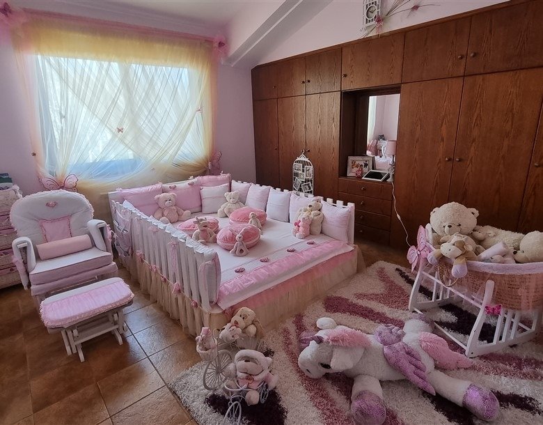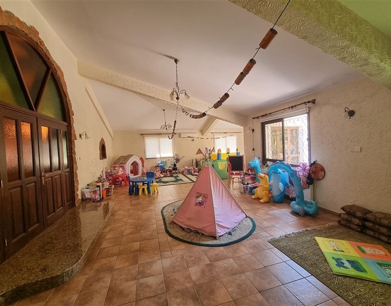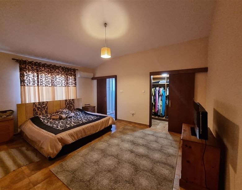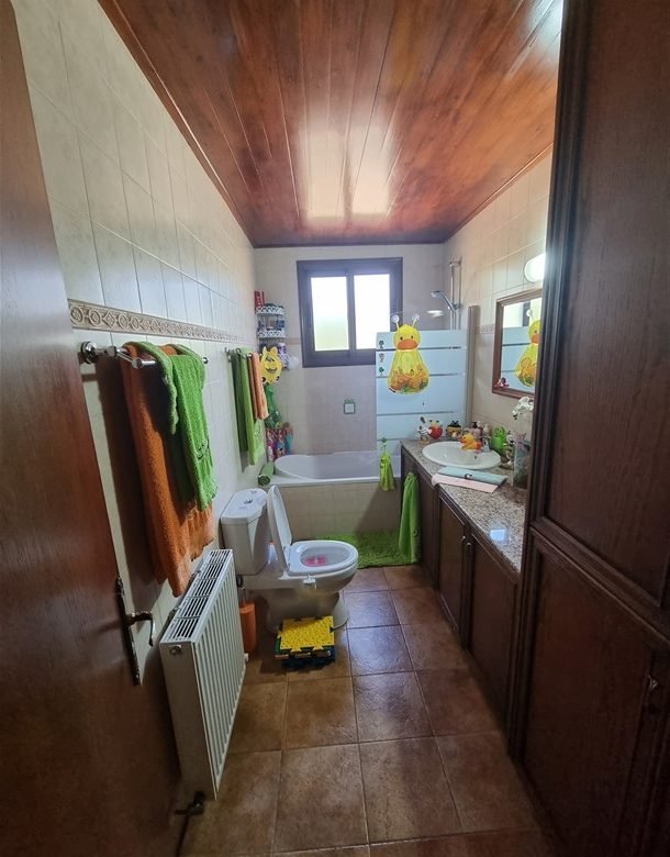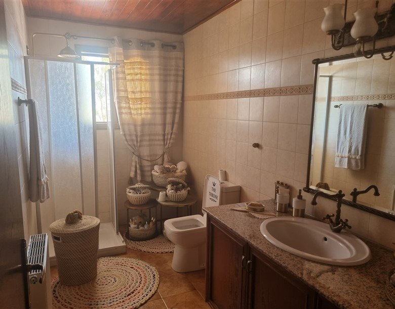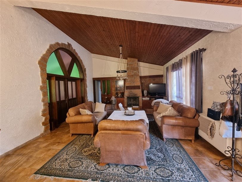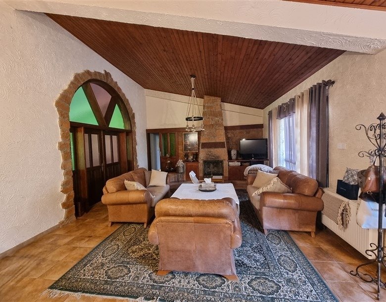 The total covered area of the house is 400 m2 and is surrounded by a large plot planted with mature trees. The garden has a big variety of fruit trees and over 50 olive trees which are watered by an automatic irrigation system from a private borehole on the property.