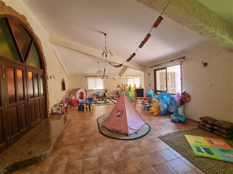The house consists of 5 bedrooms, the master bedroom with an en-suite bathroom and a wardrobe, 2 bathrooms and a large garage. A very large living/dining area currently used as a playroom, there is a big open plan kitchen with a sitting area with a fireplace with an exit to a veranda.