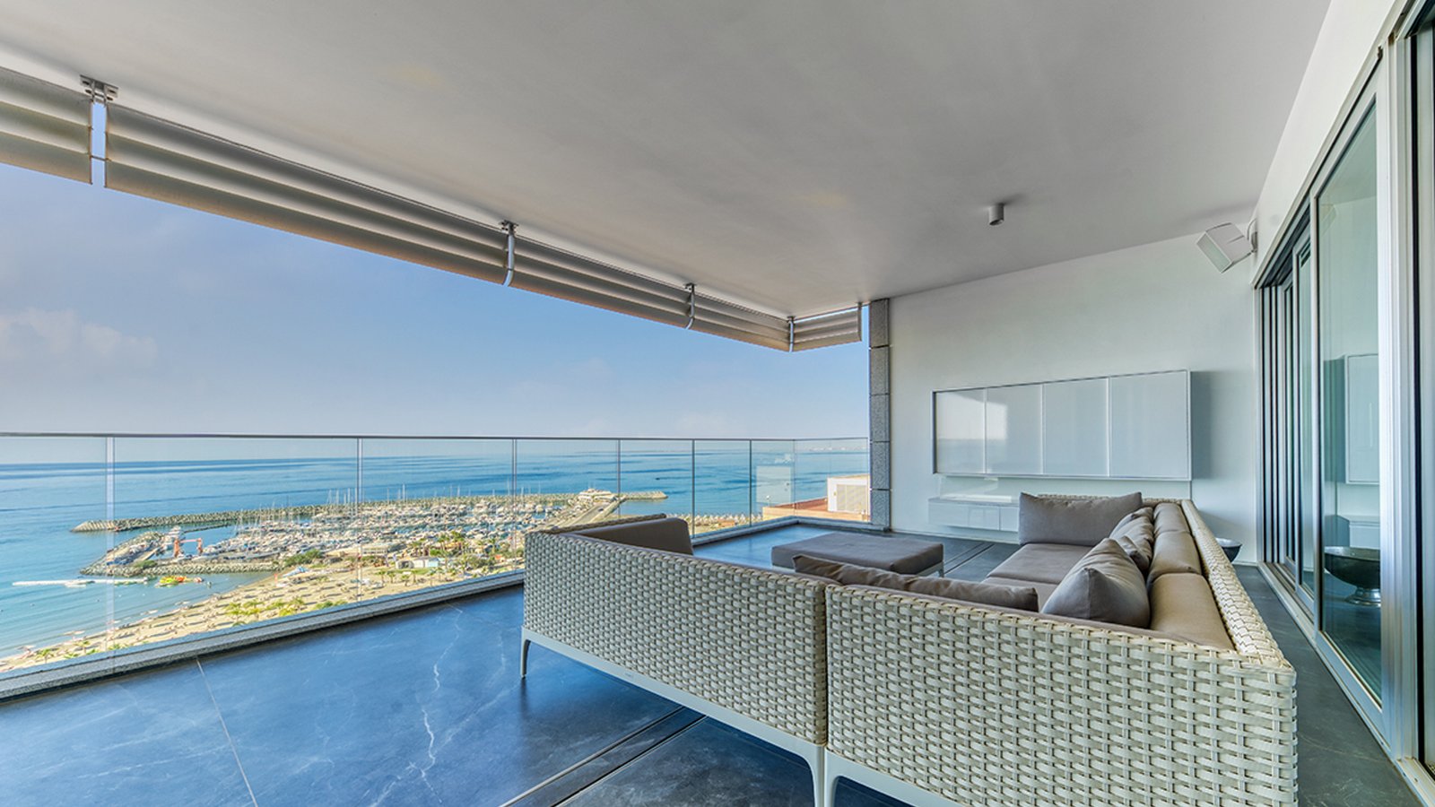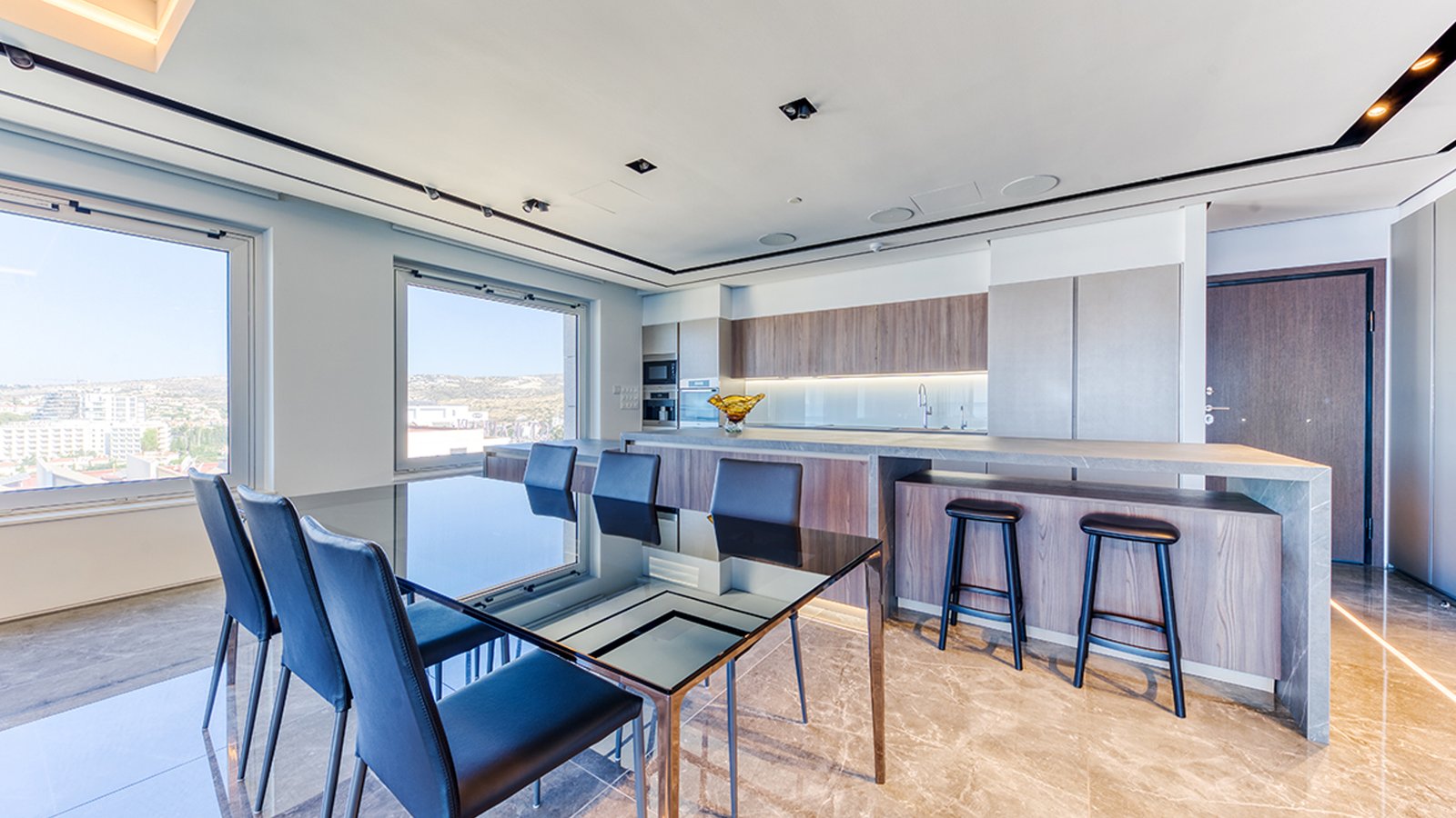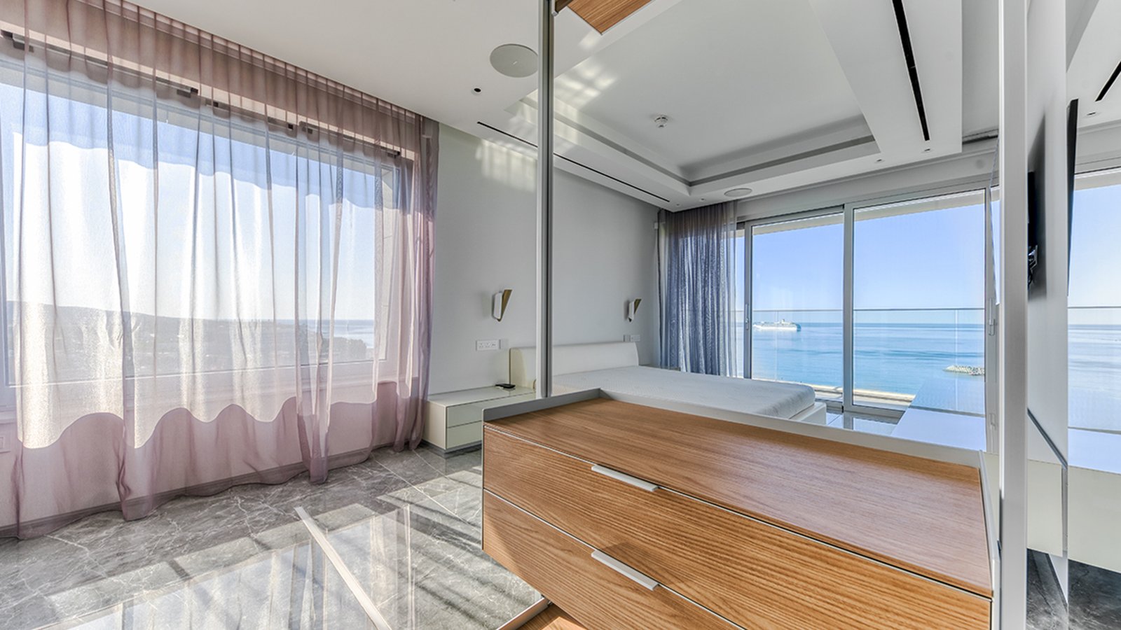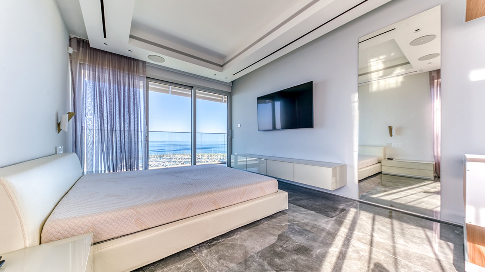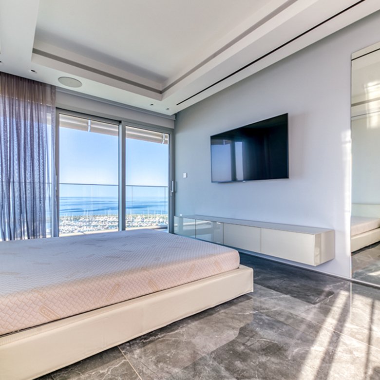 Situated on the 8th floor, the apartment boasts breathtaking panoramic views of the sea and Limassol Bay. Interiors feature a richly styled neutral color palette, creating a warm and inviting atmosphere. Exclusive amenities include a modern eco-gym, tennis court, spa and a communal swimming pool.