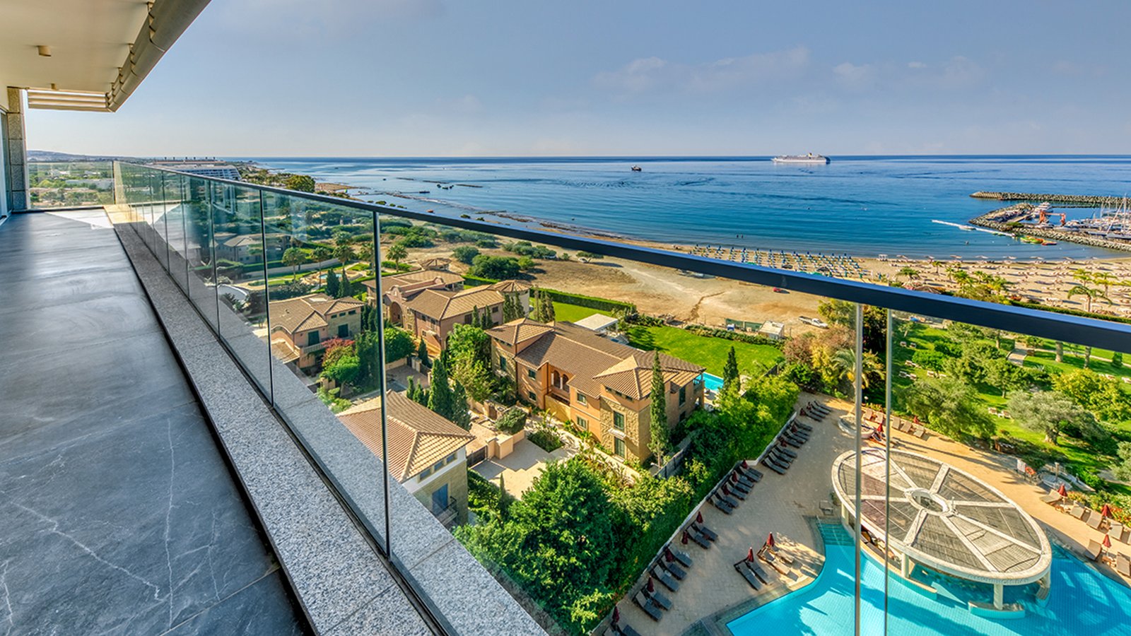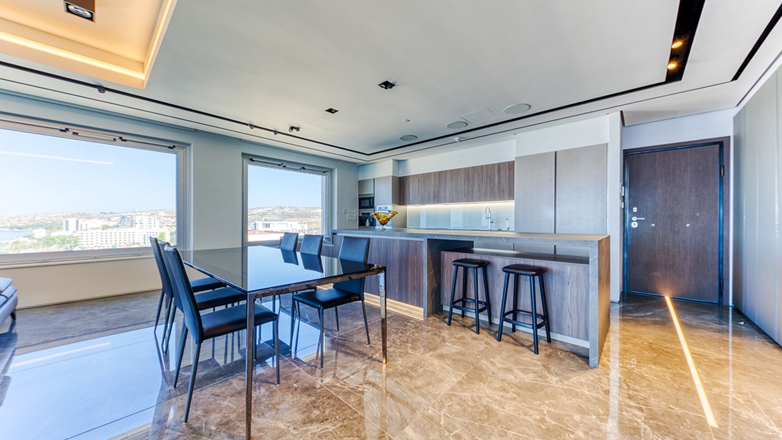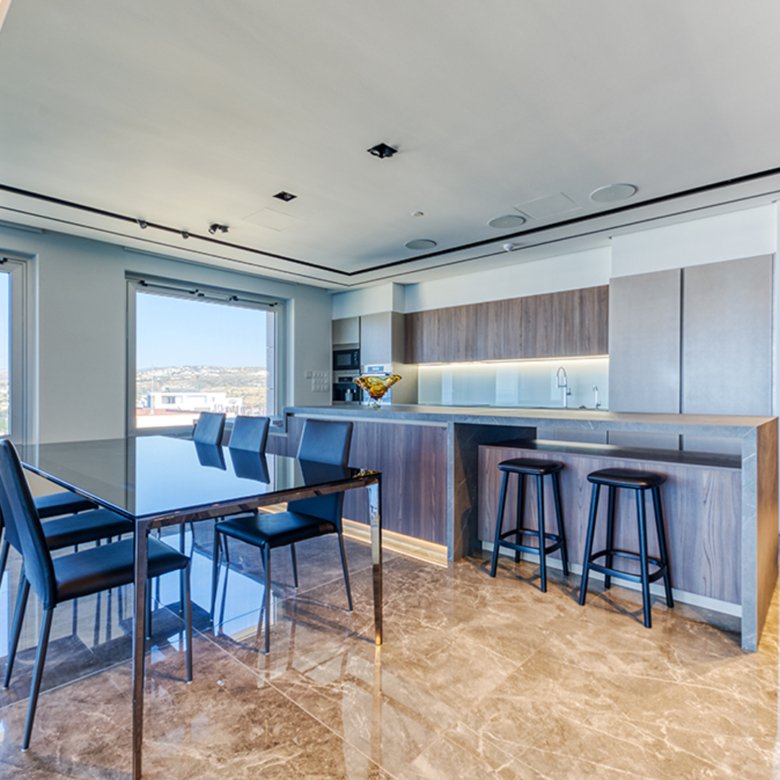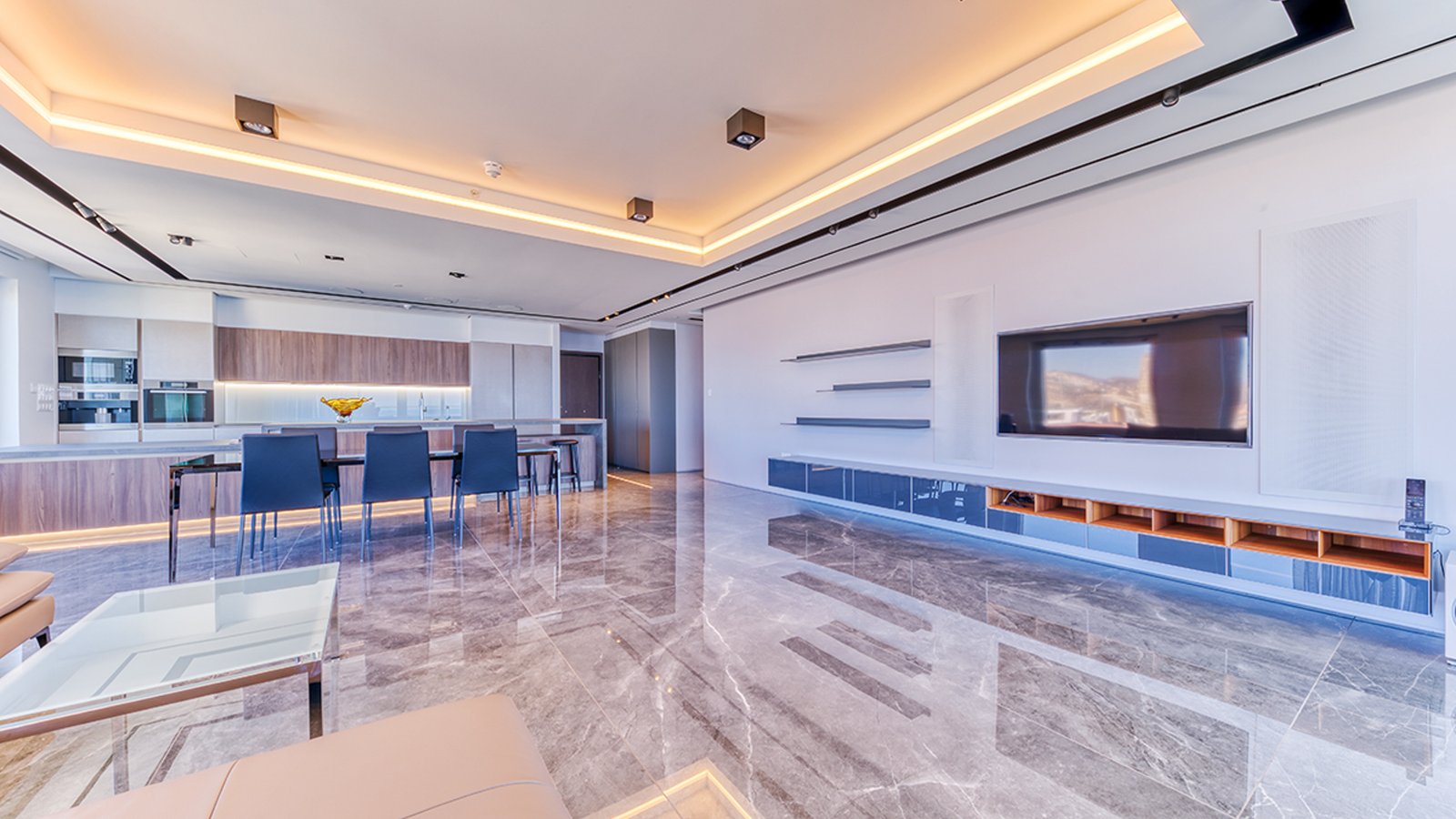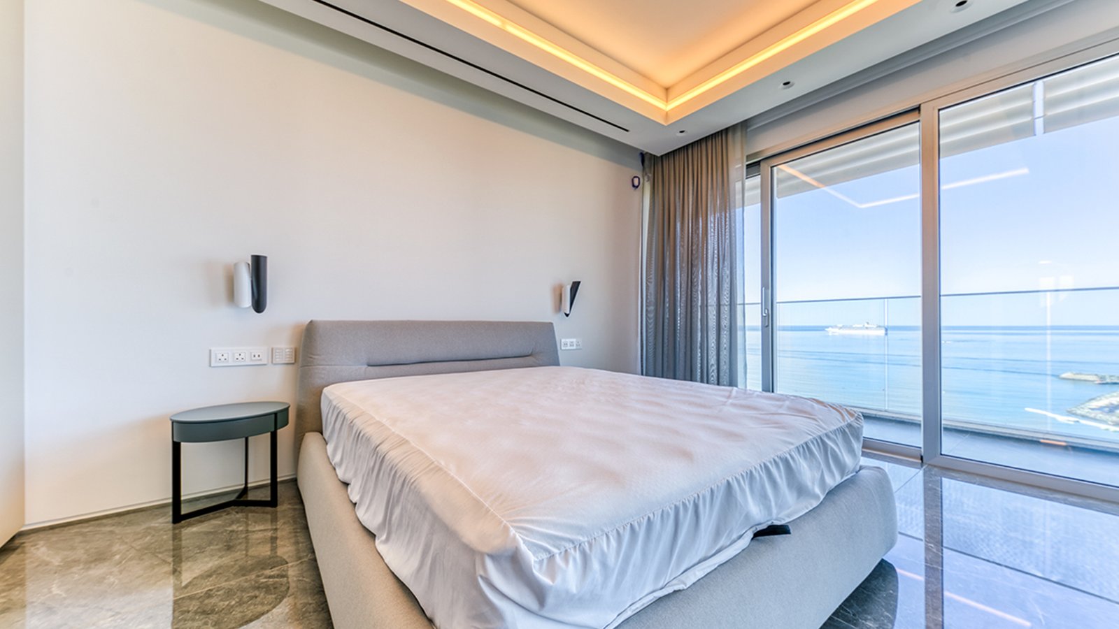 Situated on the 8th floor, the apartment boasts breathtaking panoramic views of the sea and Limassol Bay. Interiors feature a richly styled neutral color palette, creating a warm and inviting atmosphere. Exclusive amenities include a modern eco-gym, tennis court, spa and a communal swimming pool.