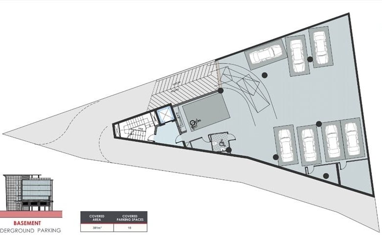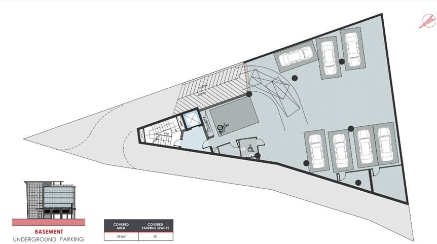 The basement garage area is equipped with a traffic control system including barriers. The entrance control is affected via remote controls.
