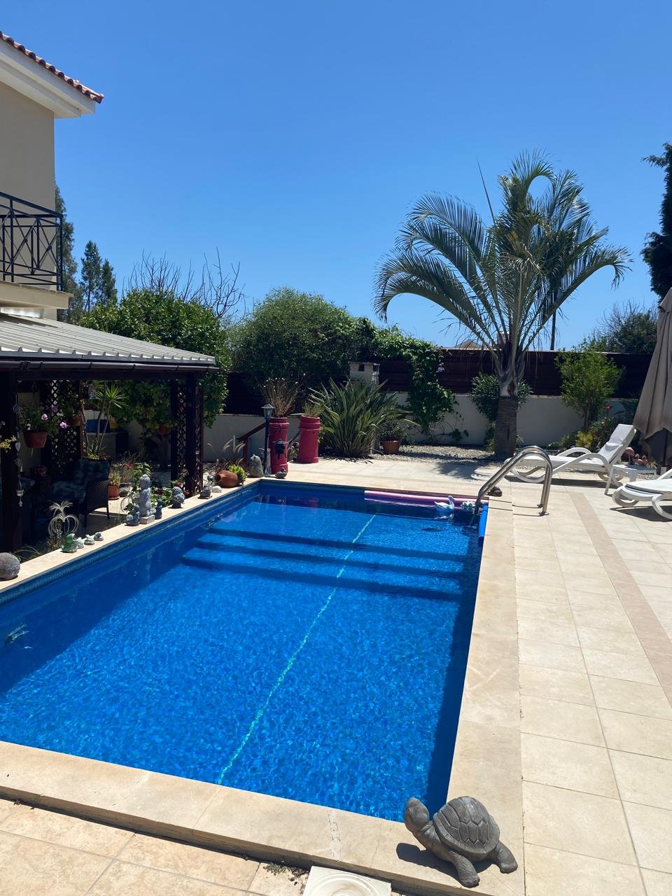 The first floor includes three double bedrooms (one en suite with a walk-in closet), a family bathroom, a large loft, and three balconies with a side sea view from the upstairs balcony. The property features a large veranda, a 3×7 meter swimming pool, covered parking, additional storage rooms, and mature gardens.