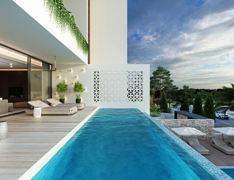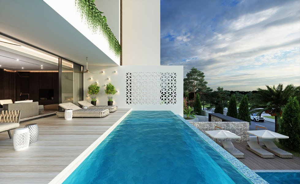 Private use swimming pools are infinity pools, fitted with mosaic tiles