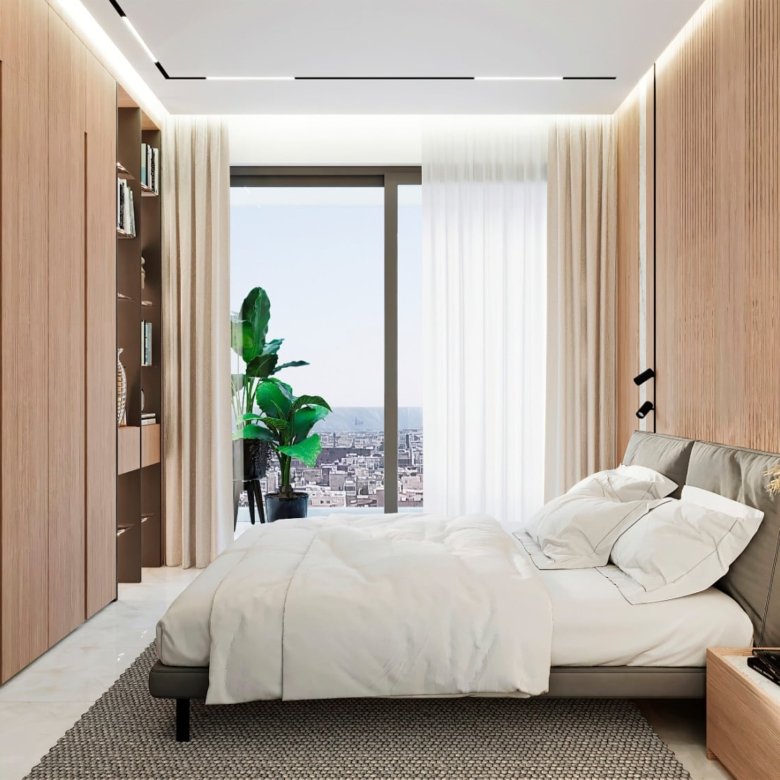 Each apartment features an open-plan kitchen and living area, creating a spacious and airy atmosphere. The bedrooms are designed to offer both comfort and style, with a cozy vibe and ample storage to keep everything organized. The interiors are decorated in neutral tones with tasteful wood accents, contributing to a serene and welcoming ambiance. Large sliding windows provide easy access to the balcony, allowing natural light to flood the rooms and offering a seamless connection to the outdoor space.