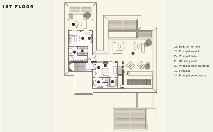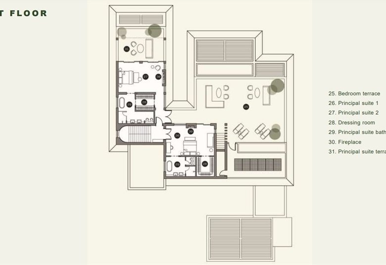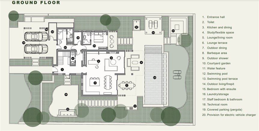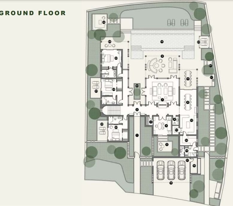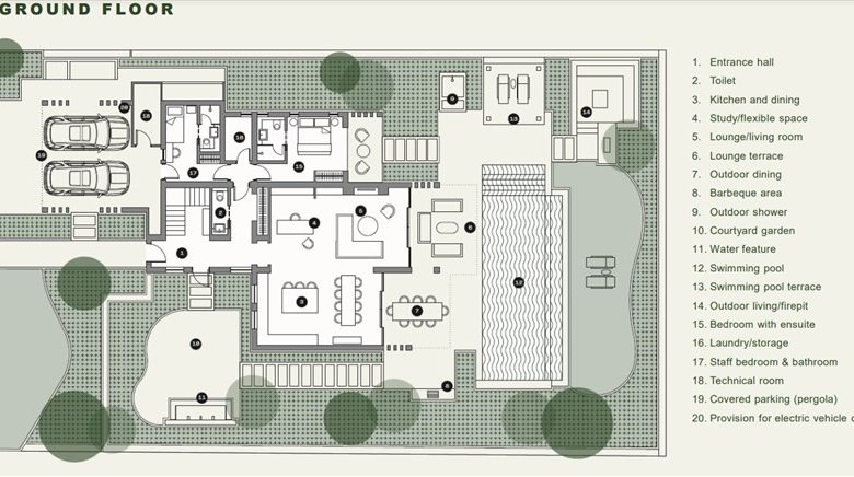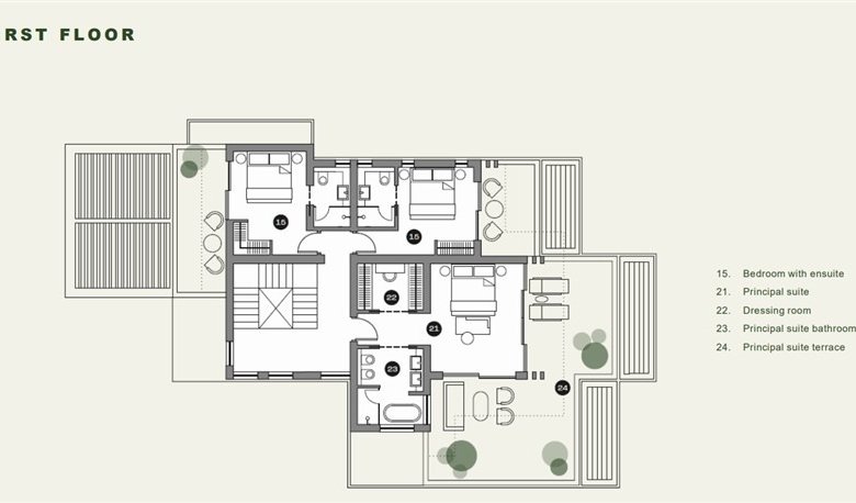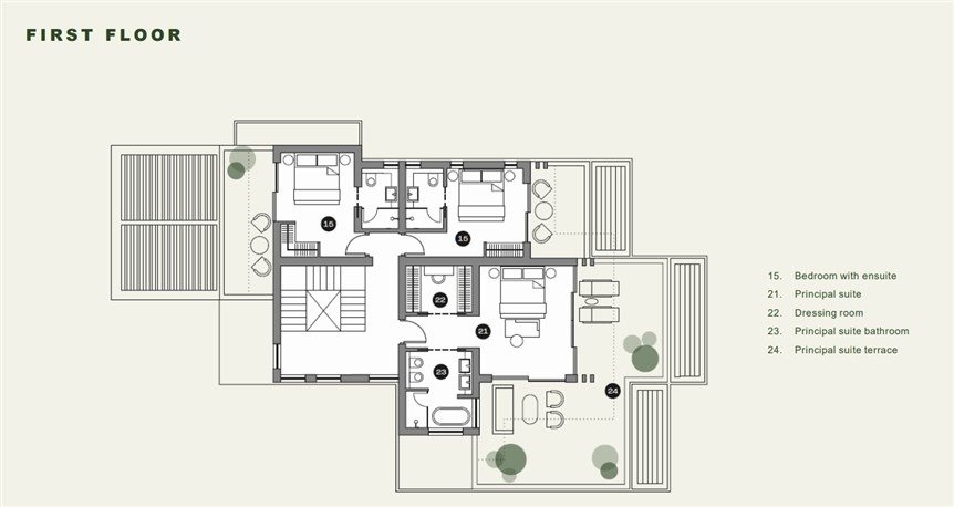 Villas will have two levels with at least one bedroom on the ground level area where the living spaces of the house are to be found with access to the backyard garden area which constitutes an extension of each house’s living space and where the swimming pool is situated. On the top (second floor) there are only bedrooms with terraces. All bedrooms are en suite. There are no roof gardens or basements.