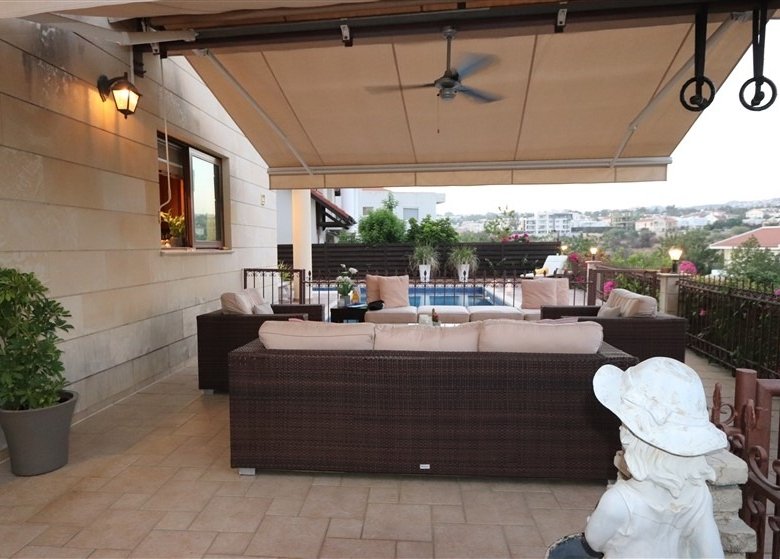 Outdoor seating Area for approx. 14 persons covered through retractable double awnings, views over surrounding area