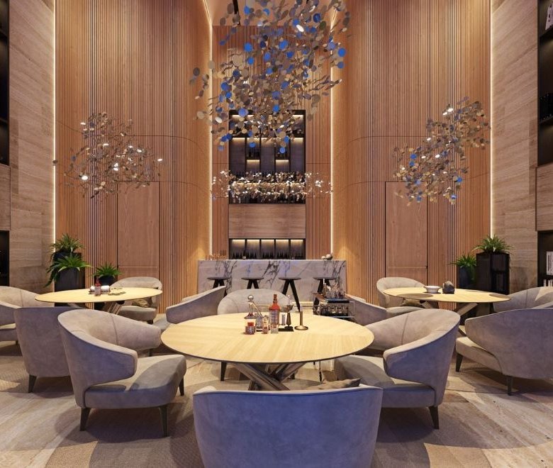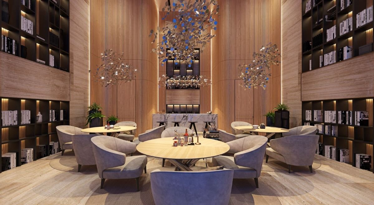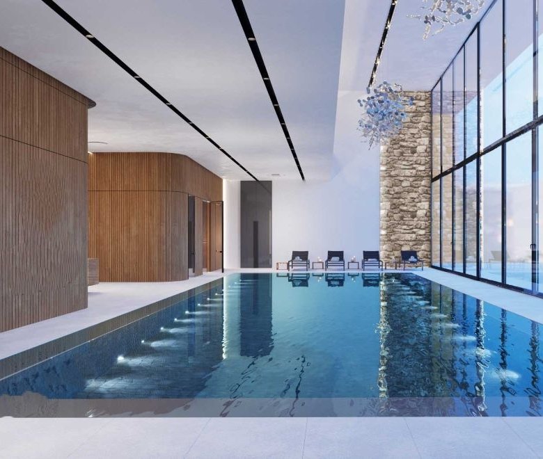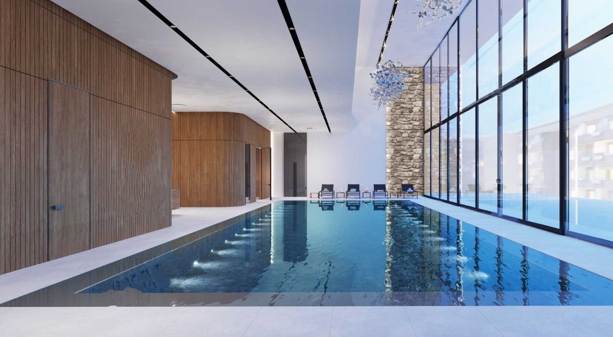Arranged around a central landscaped garden, the architectural design draws inspiration from both natural and man-made elements. Resembling a superyacht, each block gracefully slopes down from its highest point, adorned with balconies on all sides. Continuous balustrades, forming wide horizontal bands, wrap around the blocks at each level, accentuating the development’s expansive and horizontally oriented layout, spanning over 300 linear meters.