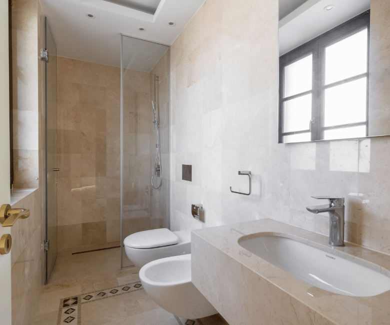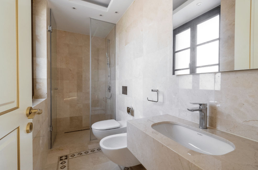 - Bathroom floors and walls are laid with expensive sorts of marble and granites