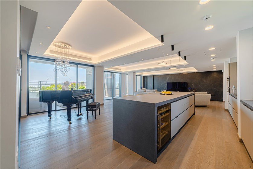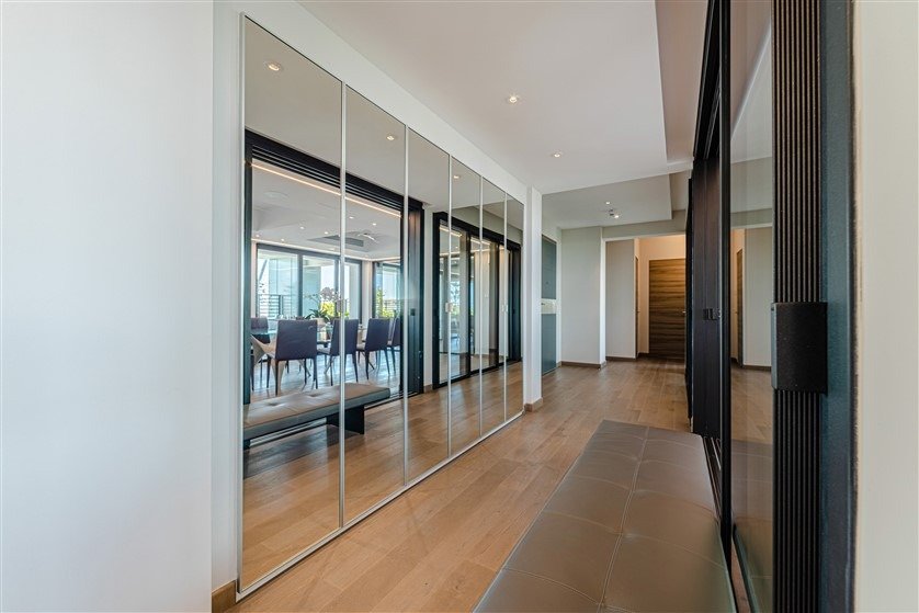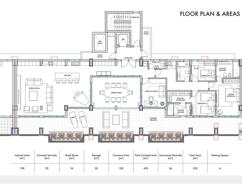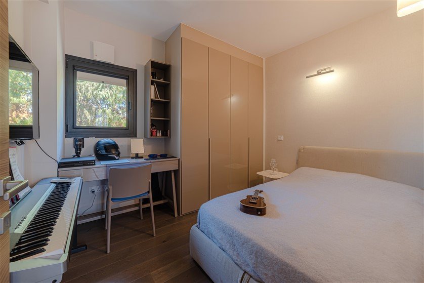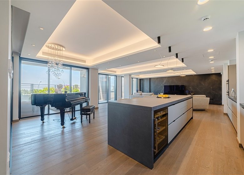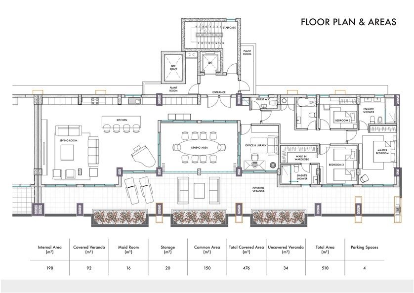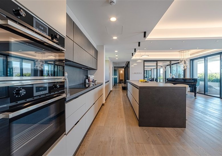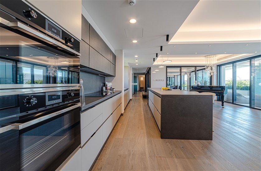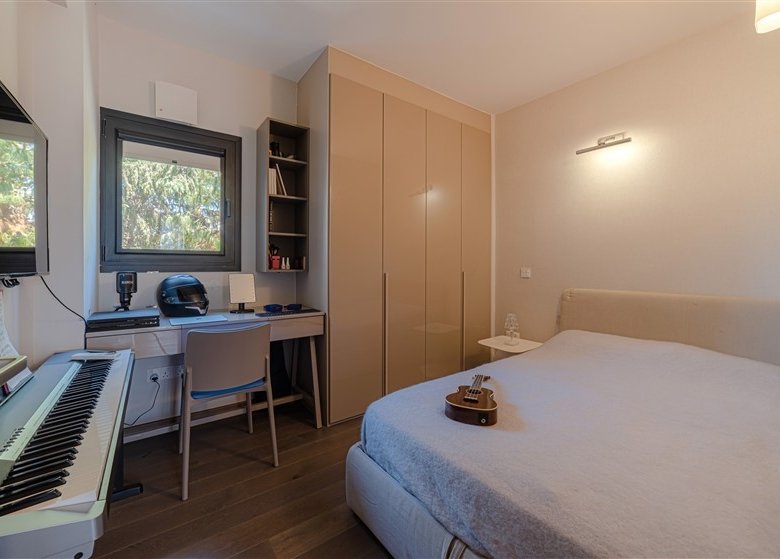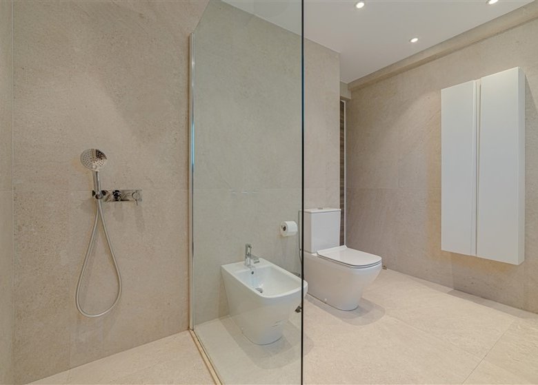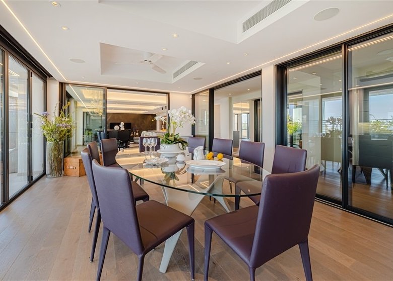 It comprises a spacious living room with a piano corner, an open plan kitchen, a large dining area, an office and library area, 3 bedrooms, the master bedroom having an en-suite shower, the third bathroom having an en-suite shower and a walk-in wardrobe, a family bathroom and a maid’s room with its private shower room.