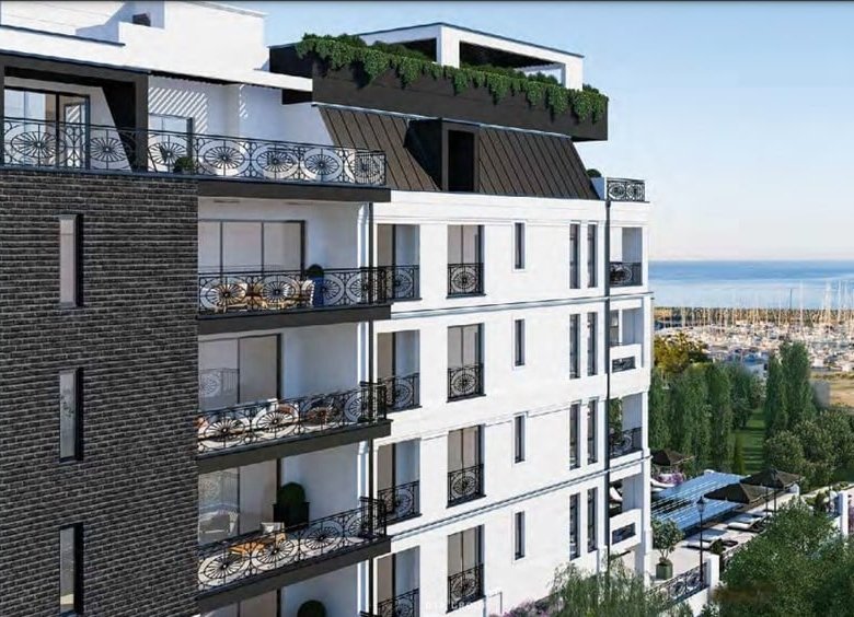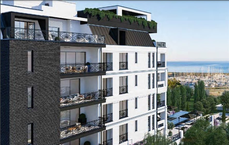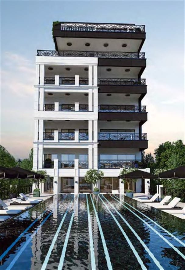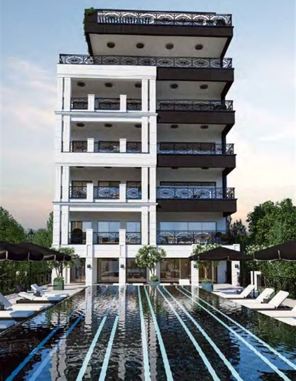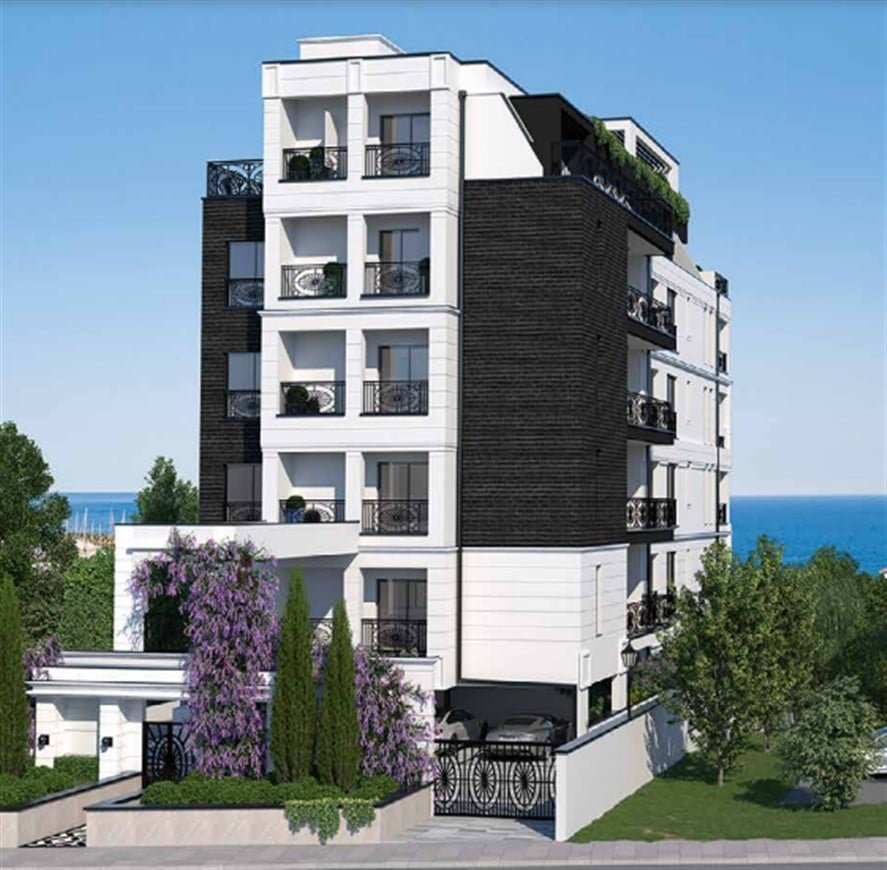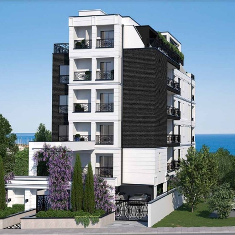 6-floor residential building consists of 13 apartments of 11 two-bedroom apartments, 1 duplex three-bedroom apartment with a roof garden, and 1 three-bedroom penthouse with a roof garden all with spacious verandas facing to the sea. Each apartment has a bedroom with en suite shower cabin on the lower ground floor. Interior spaces are designed with top-quality finishes and materials from well-known brands.