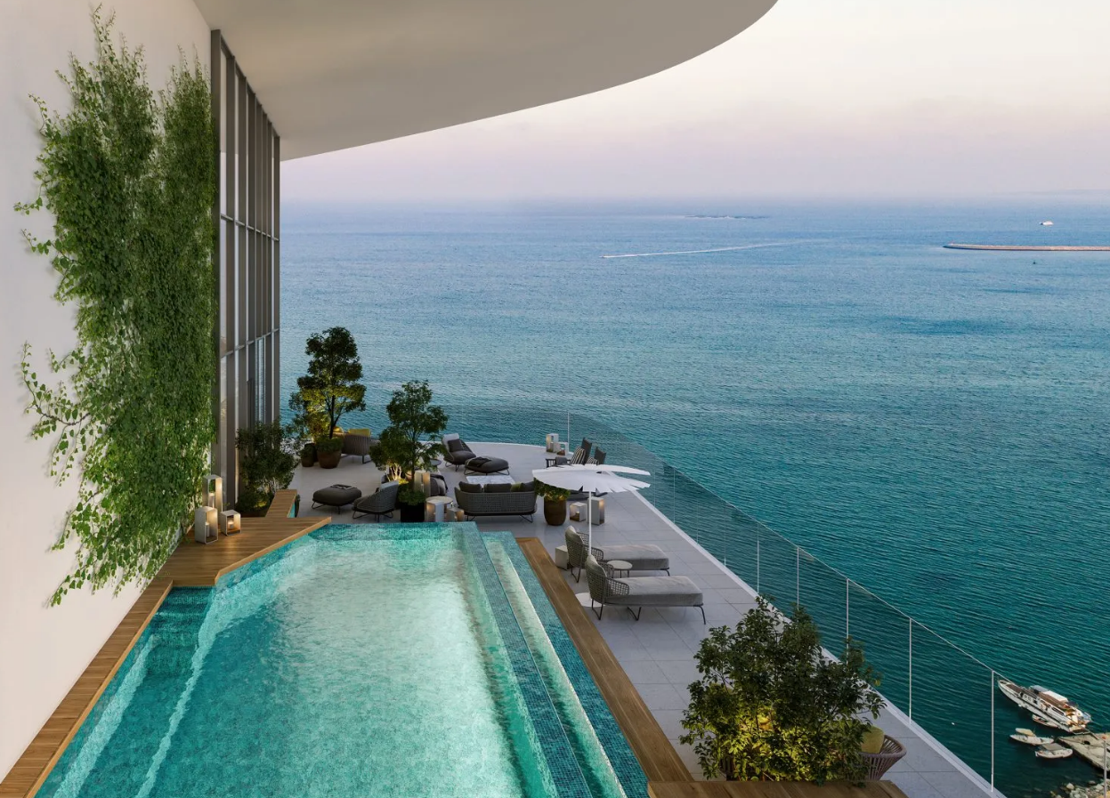 The project features a luxury spa, beautifully landscaped gardens, a children’s playground, underground parking, an impressive 50-meter infinity pool, as well as dedicated kids’ pools. Additional amenities include a sea-facing gym, a resident’s lobby, a bistro, and 24-hour concierge services. The apartment itself is stylishly designed and finished with materials and interiors created by renowned designers.