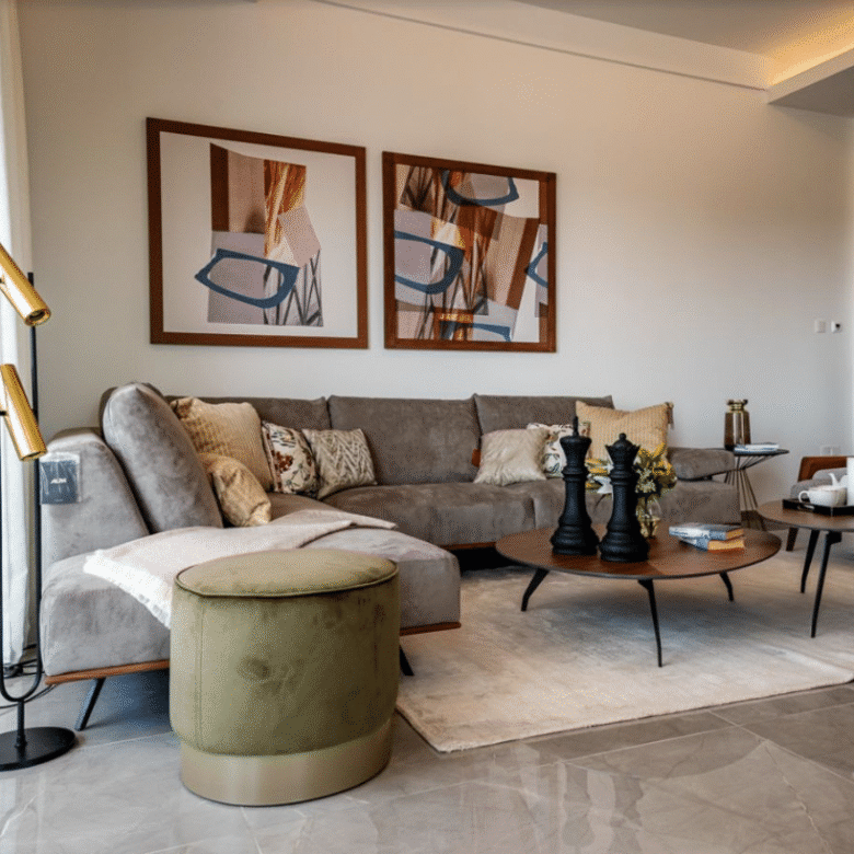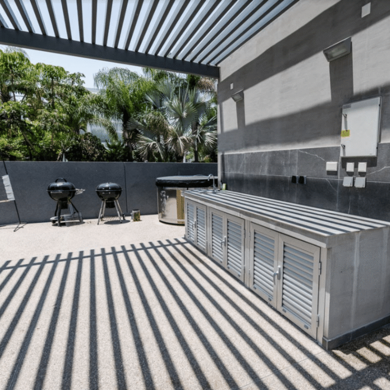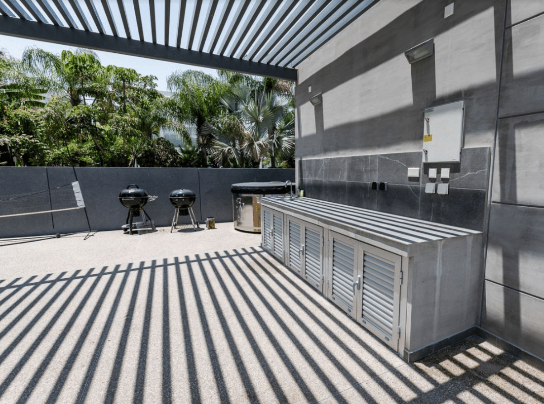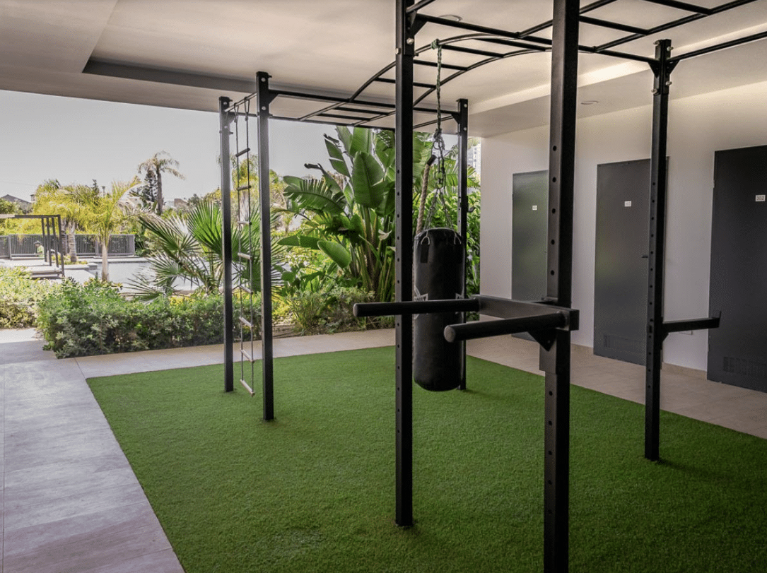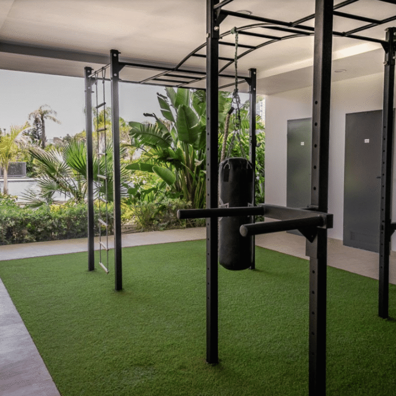 The luscious gardens of the project are carefully designed to create not only tropical vibes but also the space for an outdoor gym, a relaxation area, a BBQ area, a sauna, and a swimming pool.