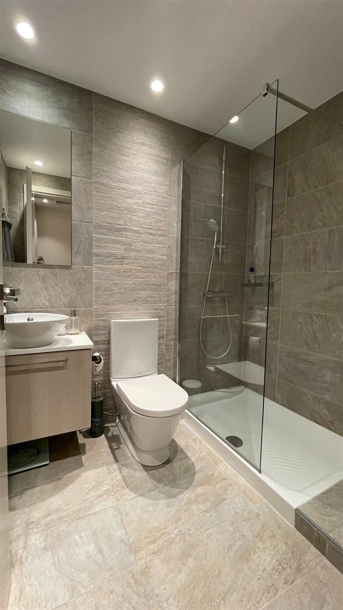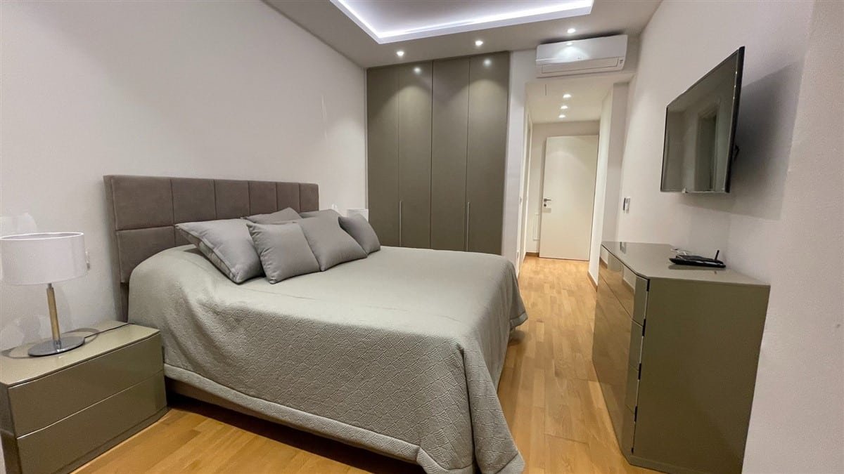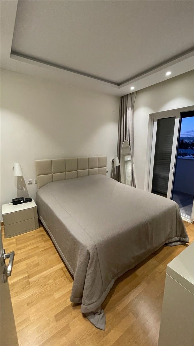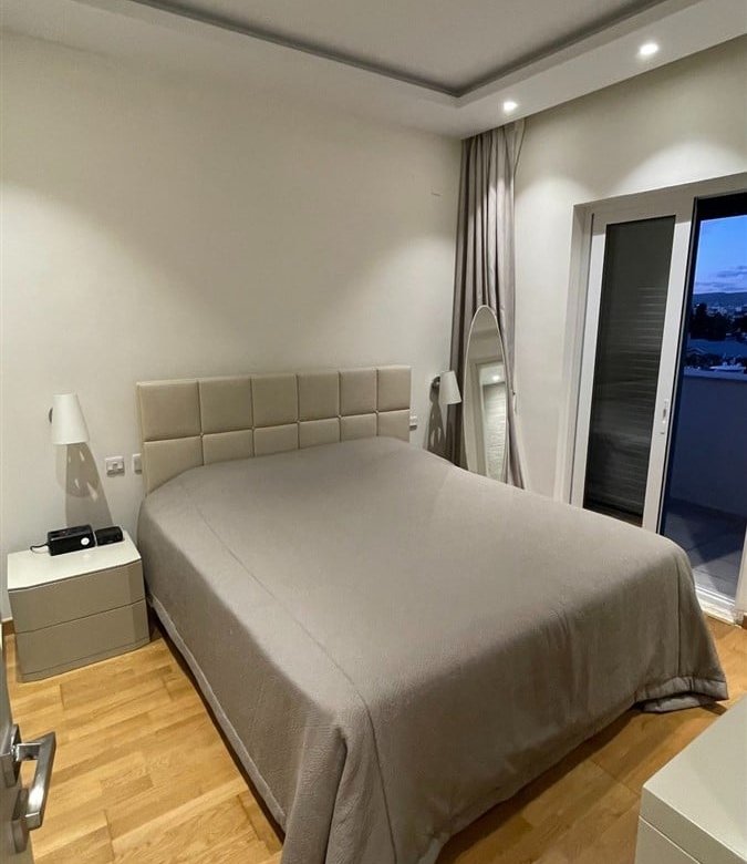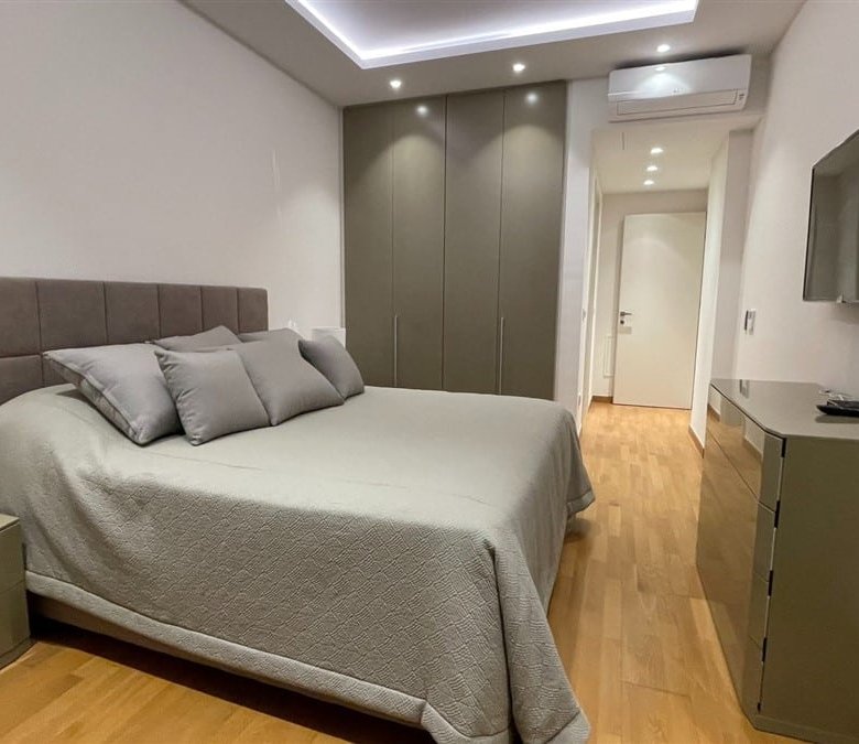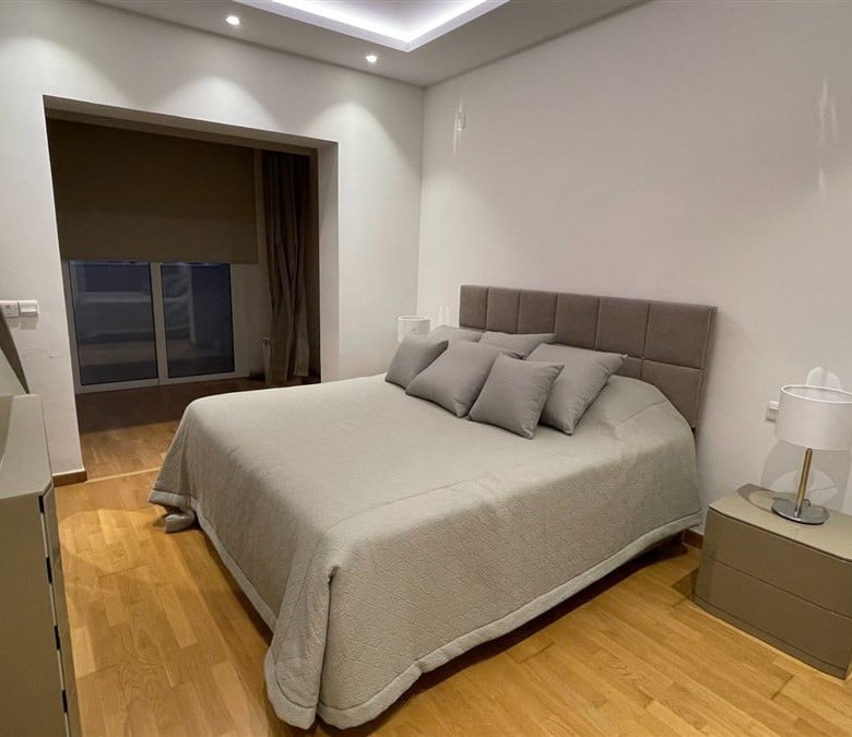 The total covered area is 220 m2. It consists of an open-plan kitchen connected with a living and dining area, a living room that has high ceilings (5 meters), three bedrooms (all bedrooms are en-suite), a guest WC, and covered verandas.