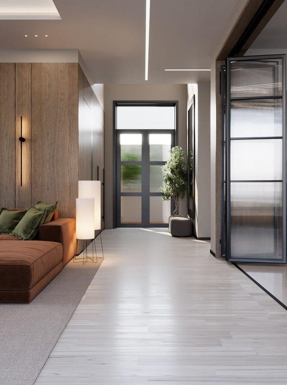 The villa features a dedicated relaxation zone, perfect for unwinding after a long day. Outside, the expansive grounds include a large pool surrounded by lush greenery, providing a serene oasis for relaxation and entertainment.