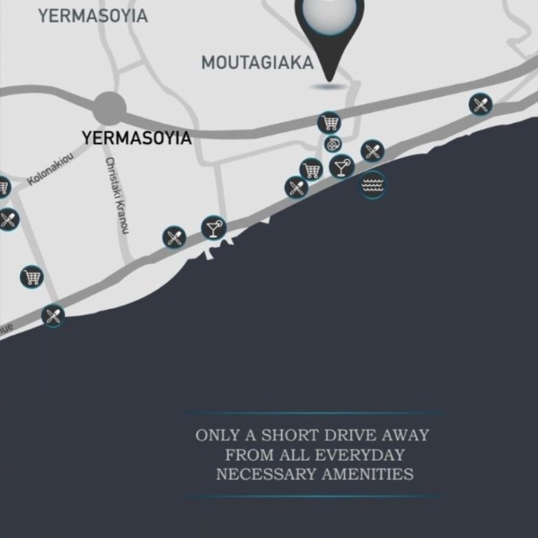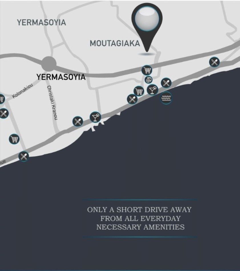 The villas are located in the Mouttagiaka area, a prime residential area of Limassol. This exclusive location offers lovely views of the sea and surrounding countryside and is close to the beach and all amenities. Supermarkets and min-markets, bakery, a cinema, beach cafes and restaurants are all within five-minute drive. On the other hand, Limassol City Center is only a short drive (5-10 minutes), private schools (Grammar School, Heritage and Foley’s) are all within a radius of 10-15-minute drive.