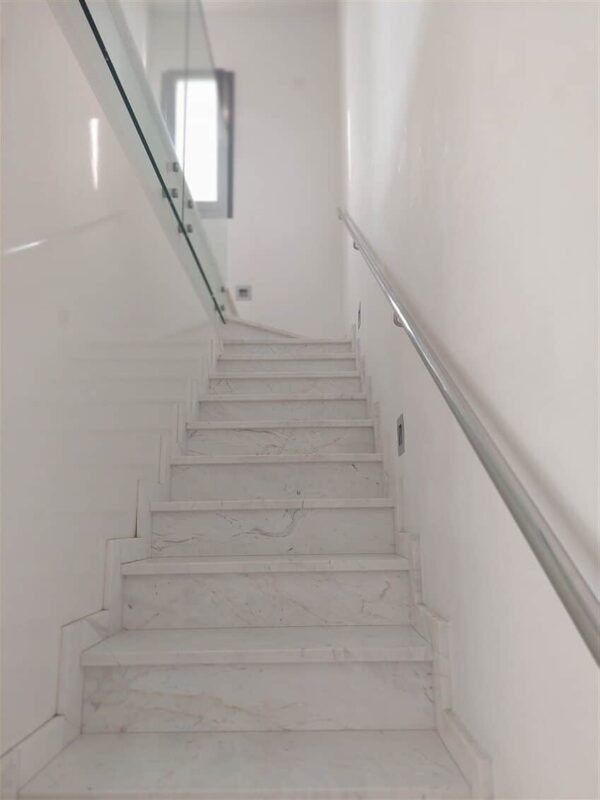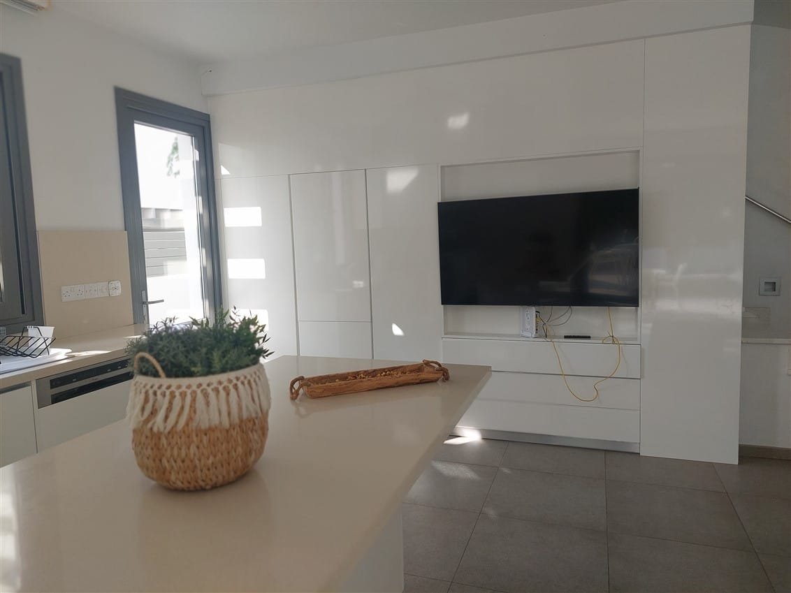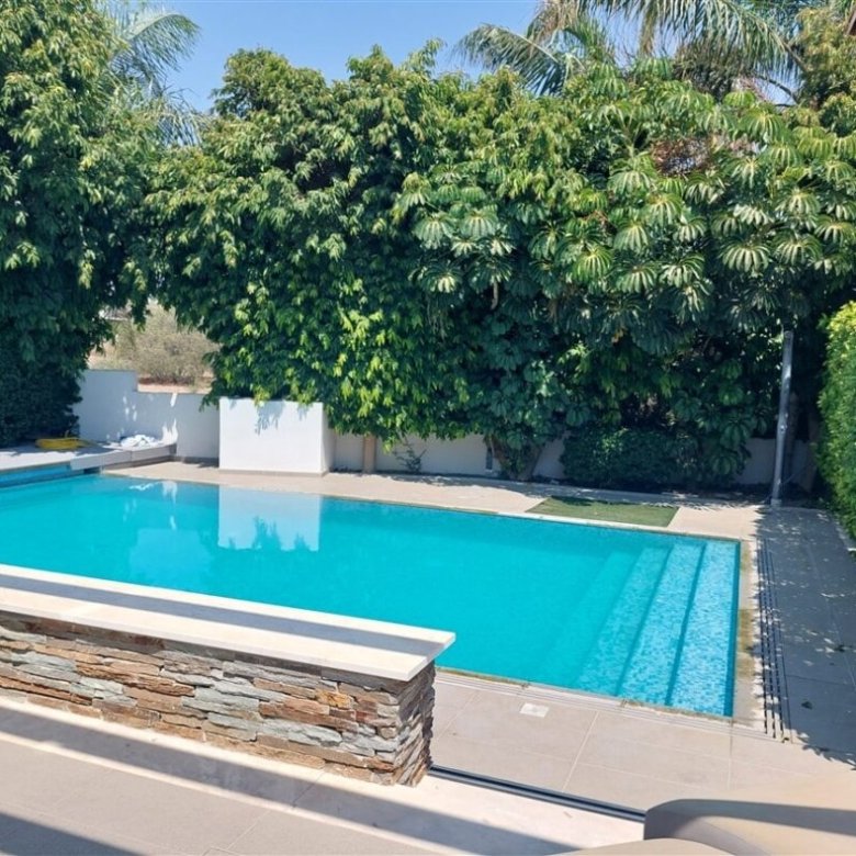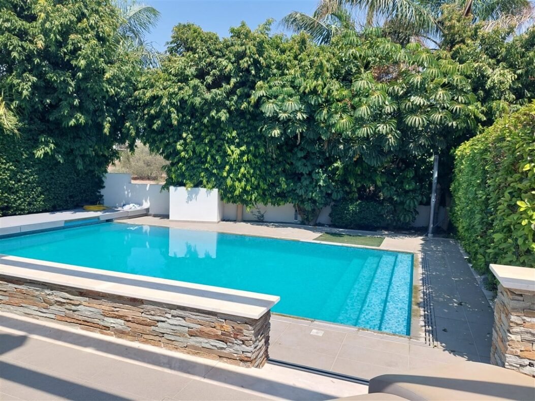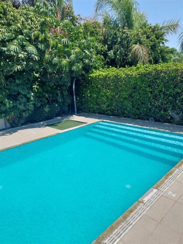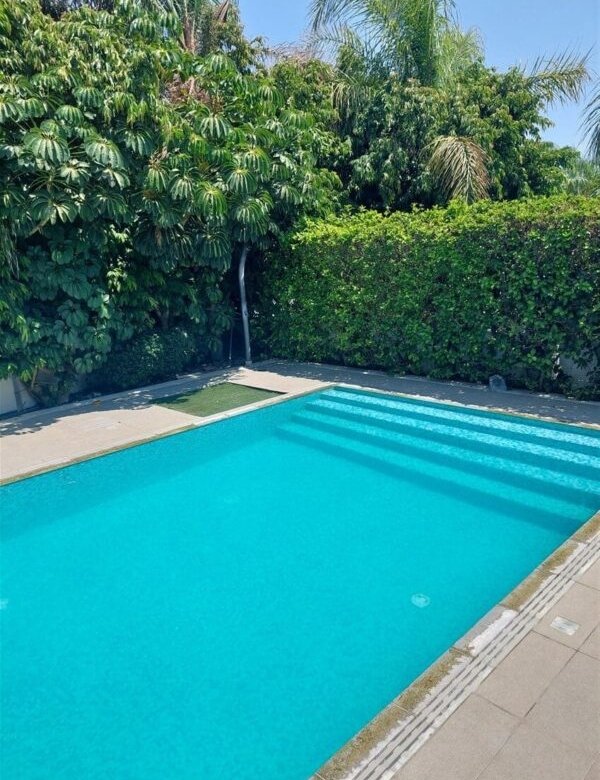 The outdoor space is a true oasis, featuring a well-manicured garden, a private swimming pool, and a spacious patio area. It’s perfect for hosting gatherings, alfresco dining, or simply lounging by the pool under the Mediterranean sun.