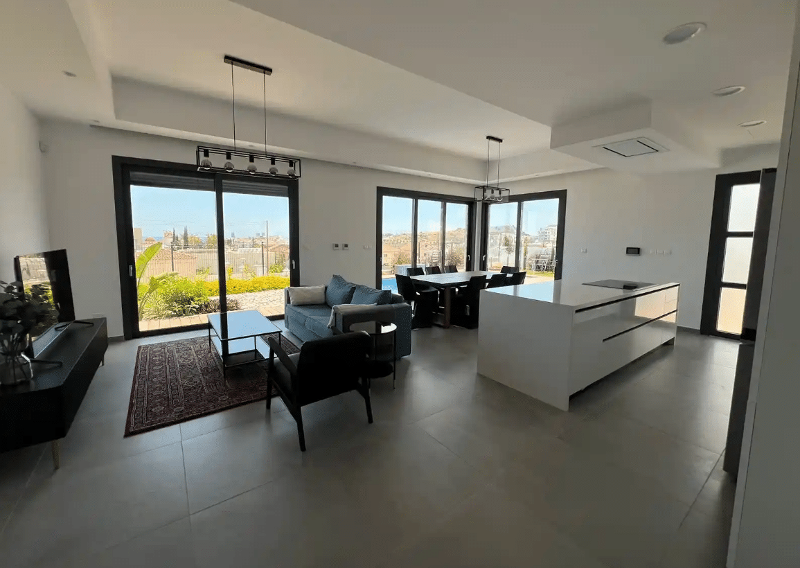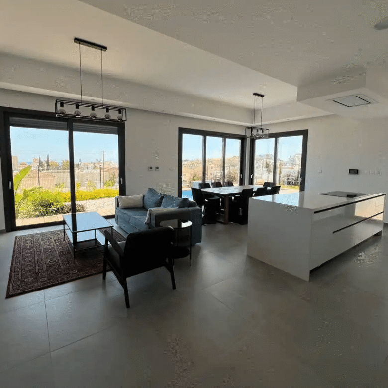 This modern, custom-designed home is located just a 5-minute drive from the Agios Athanasios roundabout, Limassol, 1 minute from Foley’s School, and approximately 10 minutes from the beach, offering stunning sea views. It enjoys a prime location next to a large green area, ensuring that the panoramic sea view remains unobstructed.