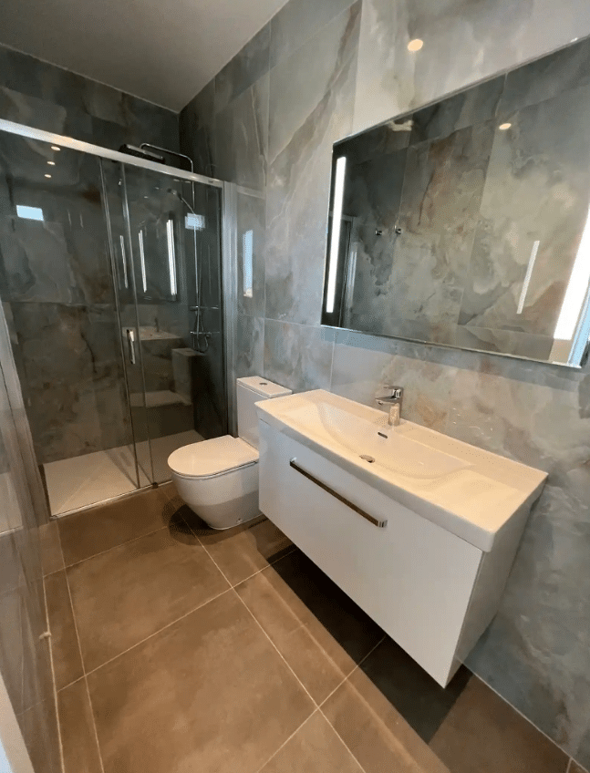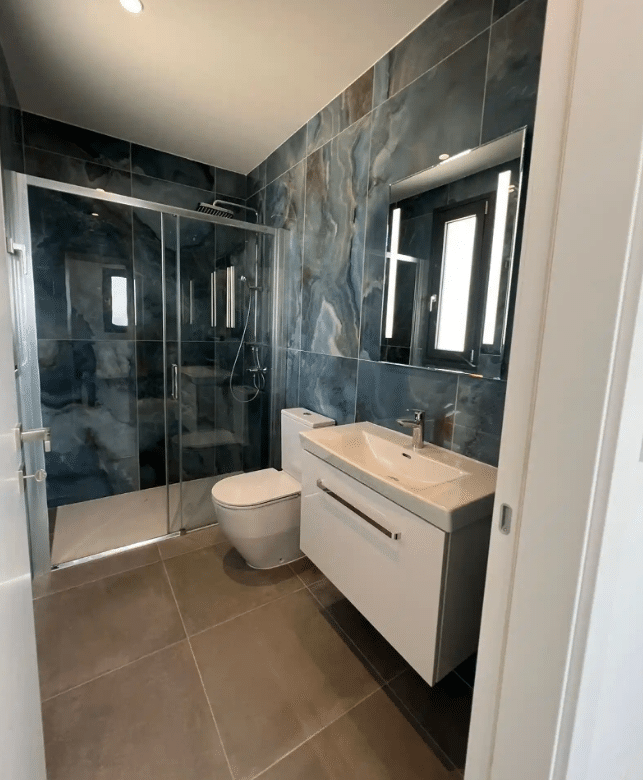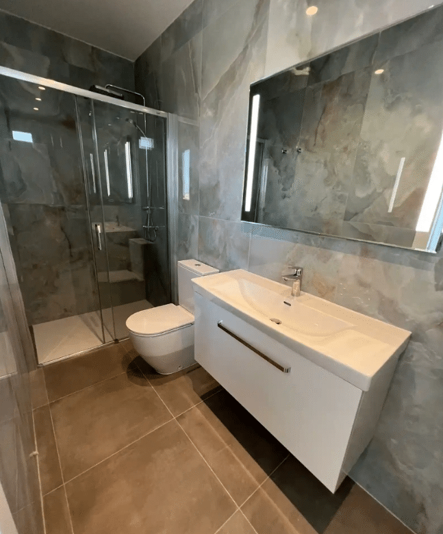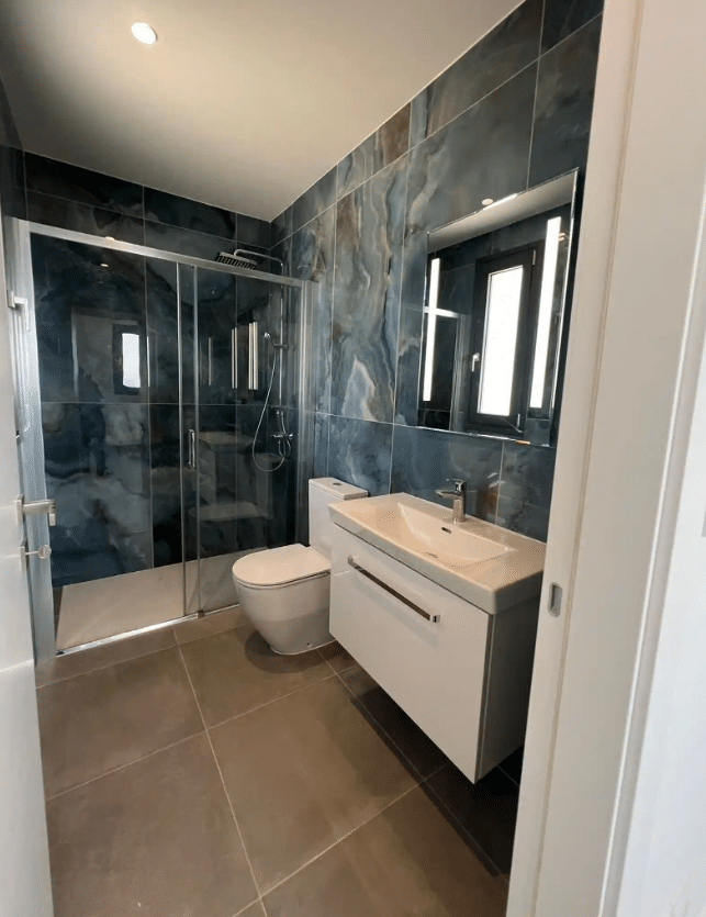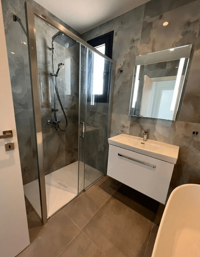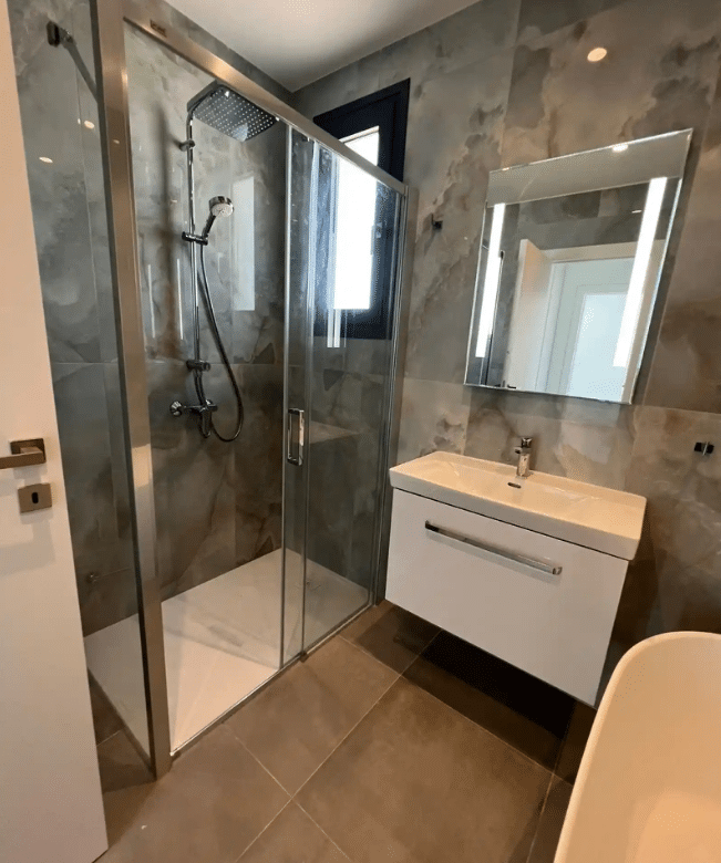 The home features four spacious bedrooms, each with its own en-suite bathroom equipped with top-quality Laufen Sanitary ware and glass shower enclosures from Epiphaniou. The master suite includes a freestanding bath, separate shower, and a walk-in wardrobe.
