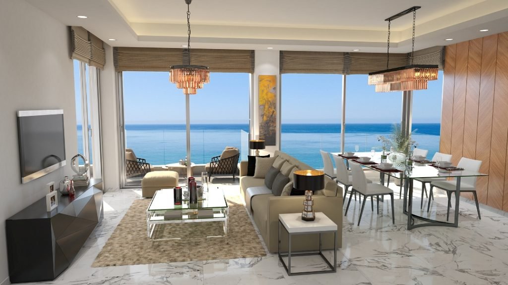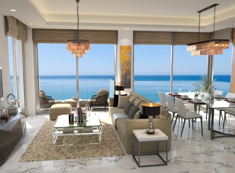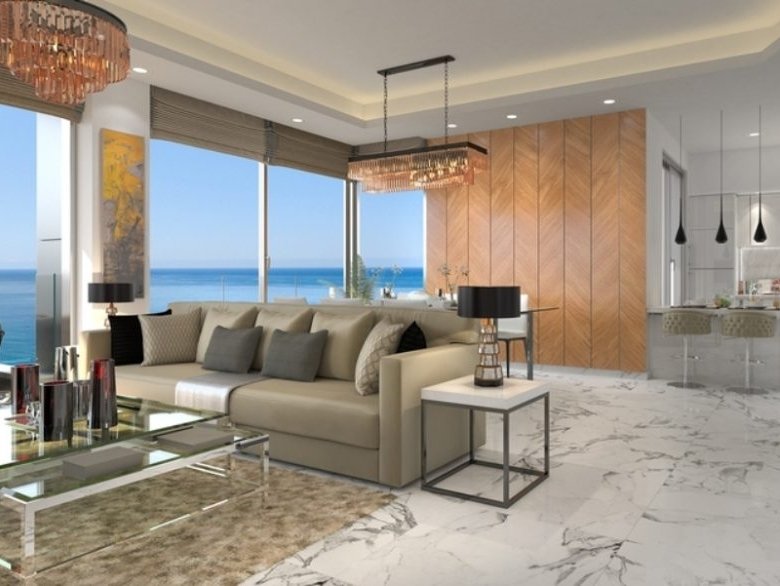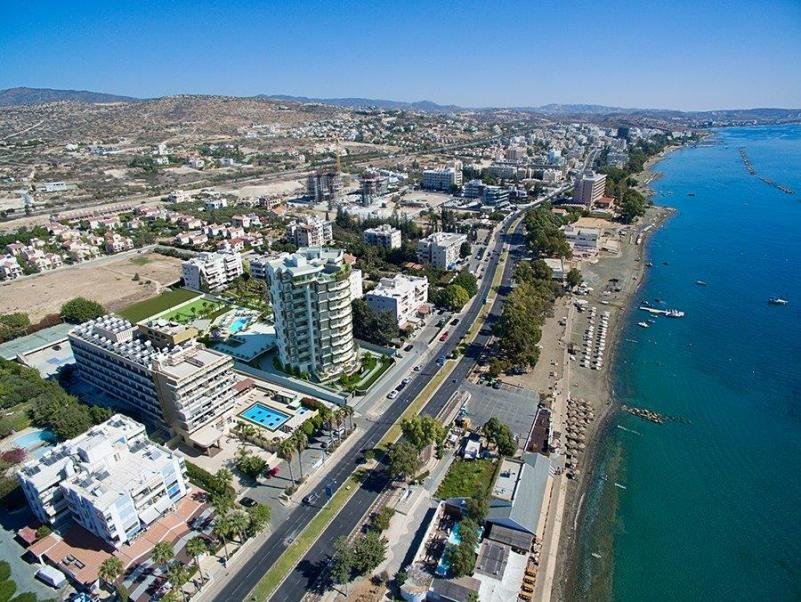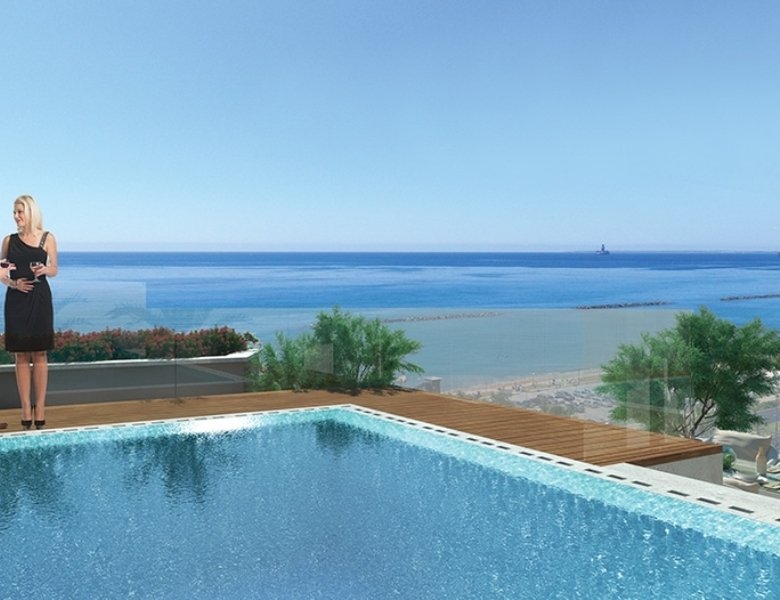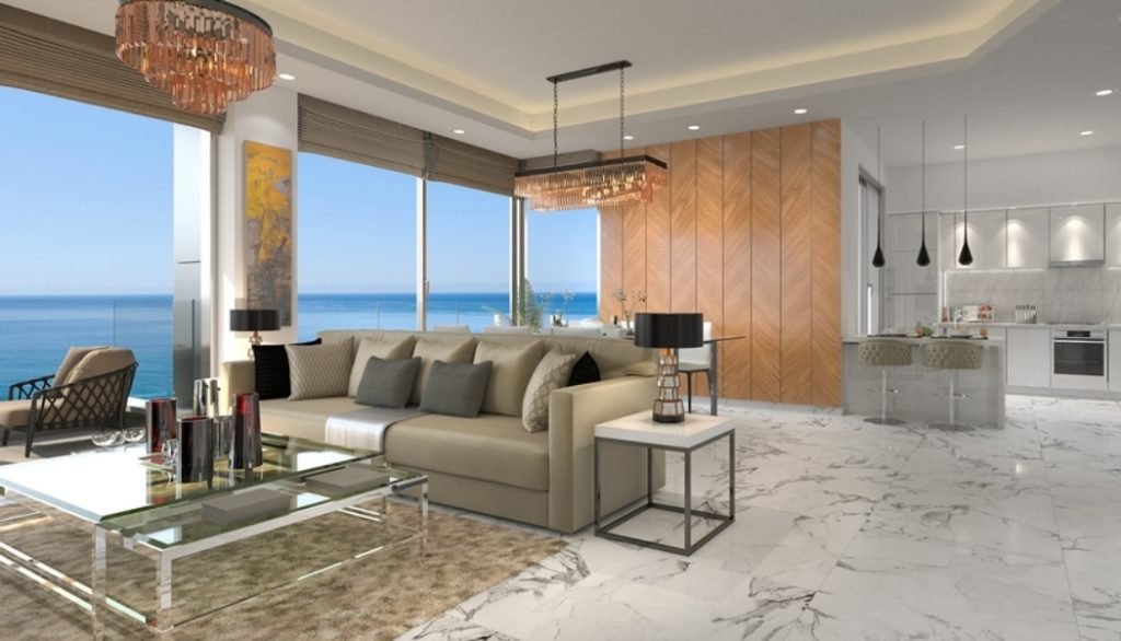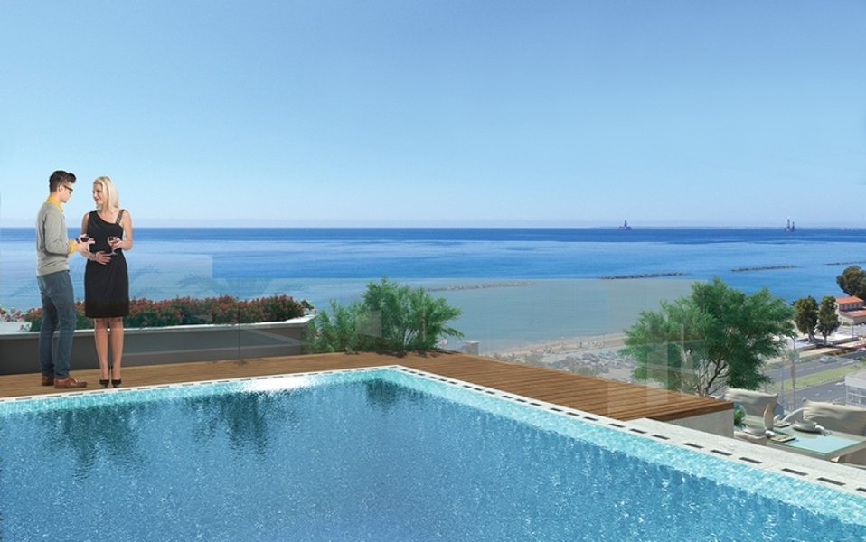 The modern high-rise apartment building is fully covered in marble, sitting opposite Limassol’s highly acclaimed blue flag beach.