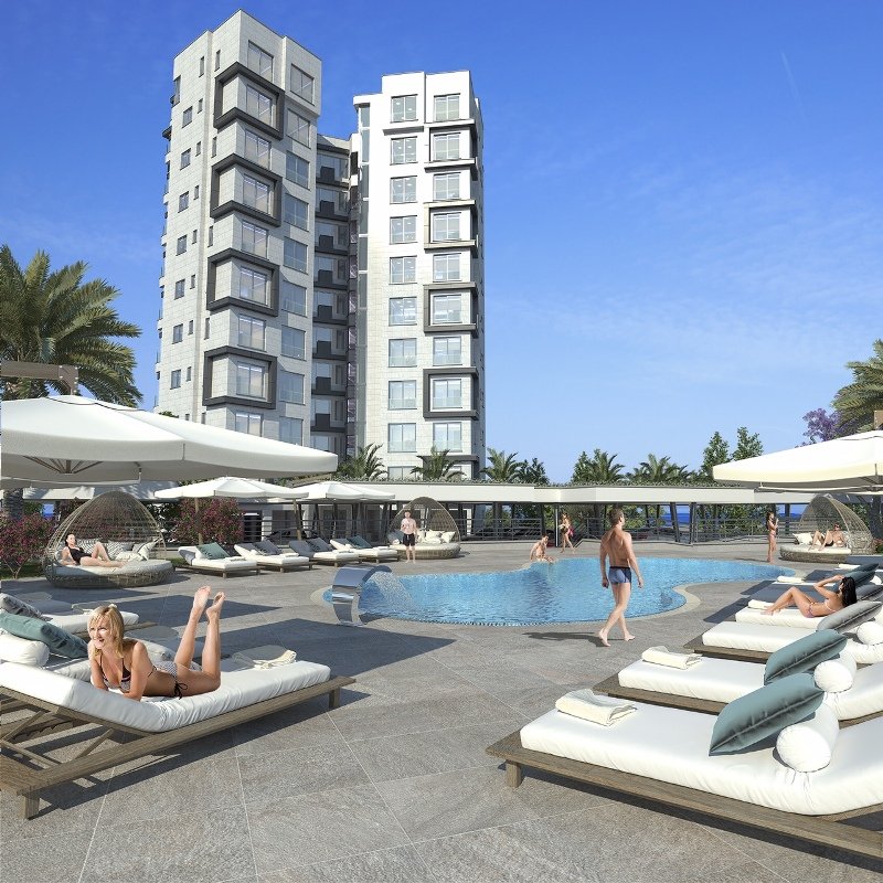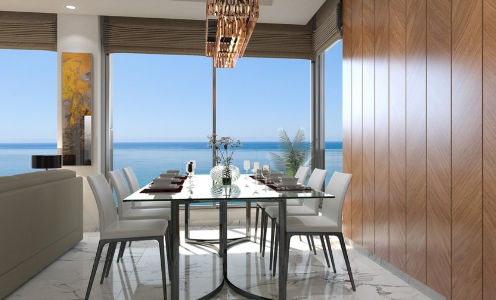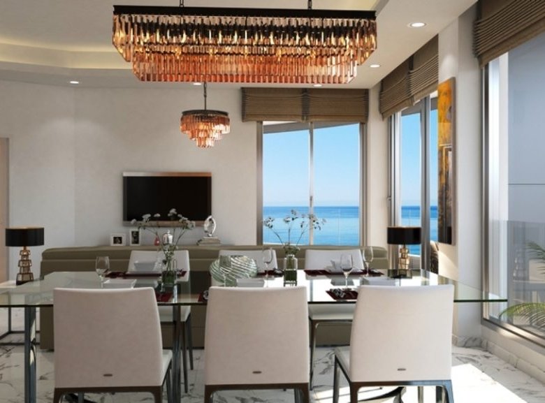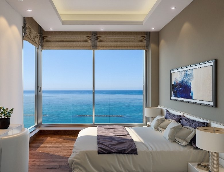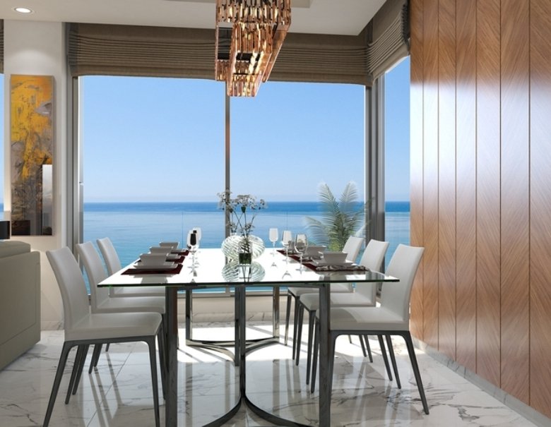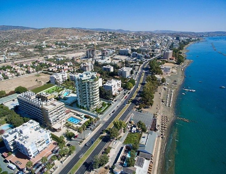 The modern high-rise apartment building is fully covered in marble, sitting opposite Limassol’s highly acclaimed blue flag beach.