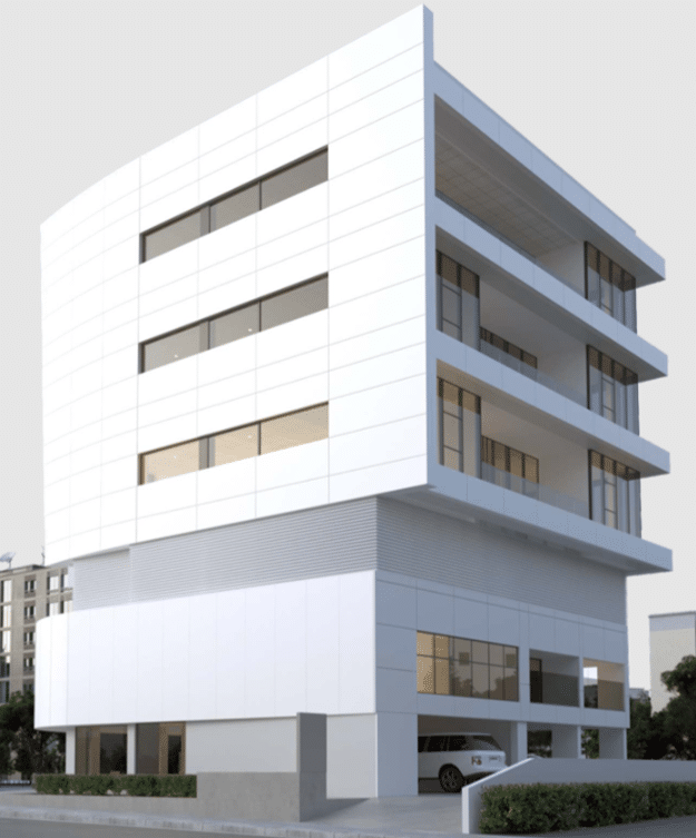 The building features a well-designed modern façade with generally top quality and high standard materials that consist of high quality alucobond profiles. The building entrance at ground floor and basement parking place
