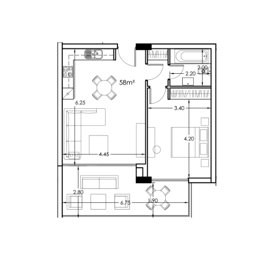 The apartment is situated on the 1st floor and features 1 bedroom, 1 bathroom, and a covered veranda.