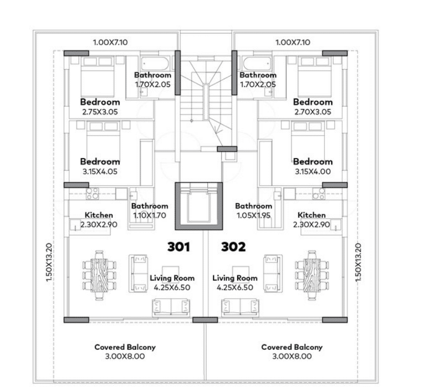 The building features six two-bedroom apartments across the first, second, and third floors, as well as an opulent three-bedroom penthouse with a roof garden on the fourth and fifth floors. Each apartment boasts spacious interiors and large balconies. Additionally, every unit includes a covered parking space and a private storage room on the ground floor. The building’s main entrance is secure and equipped with surveillance cameras.