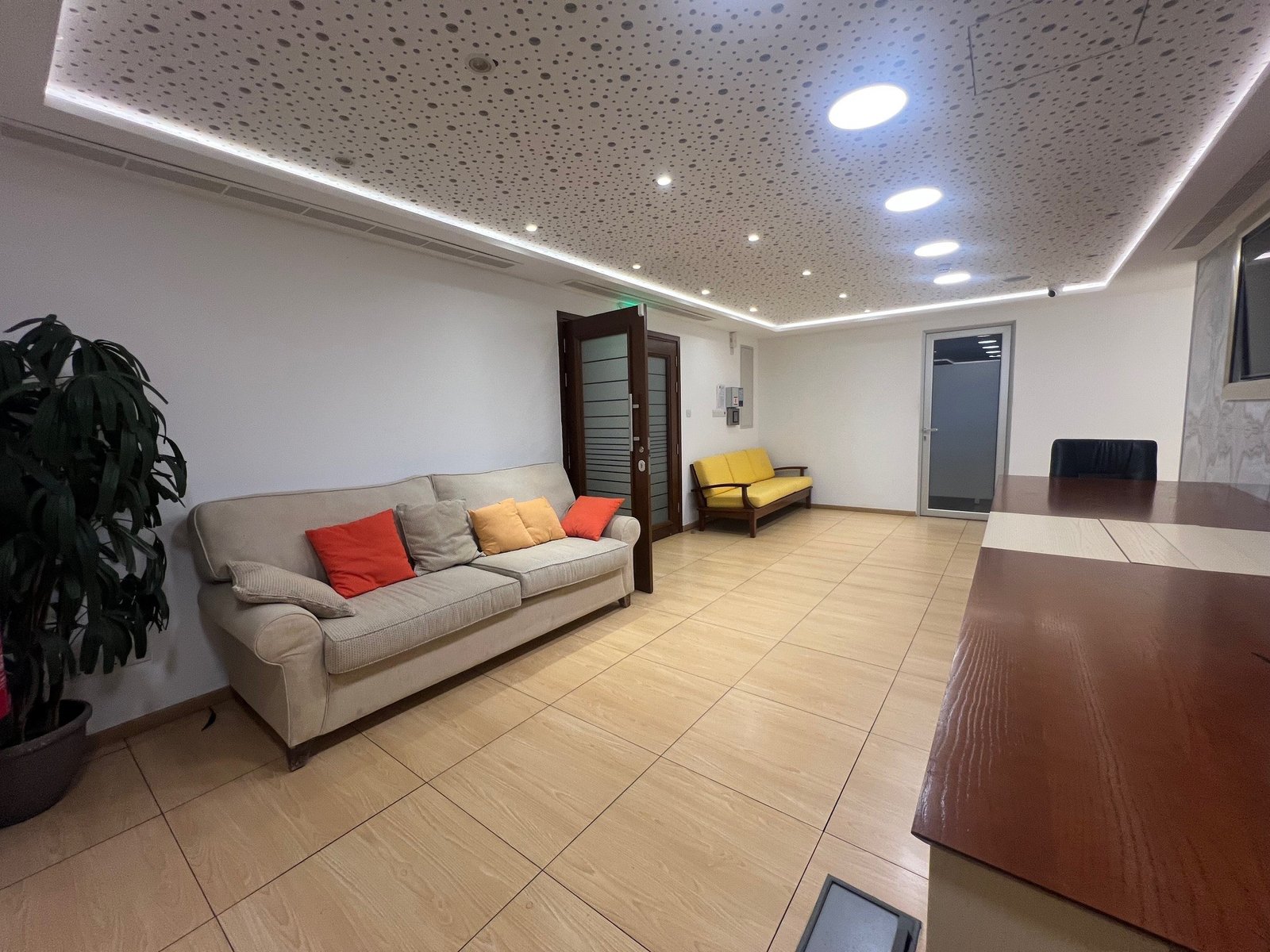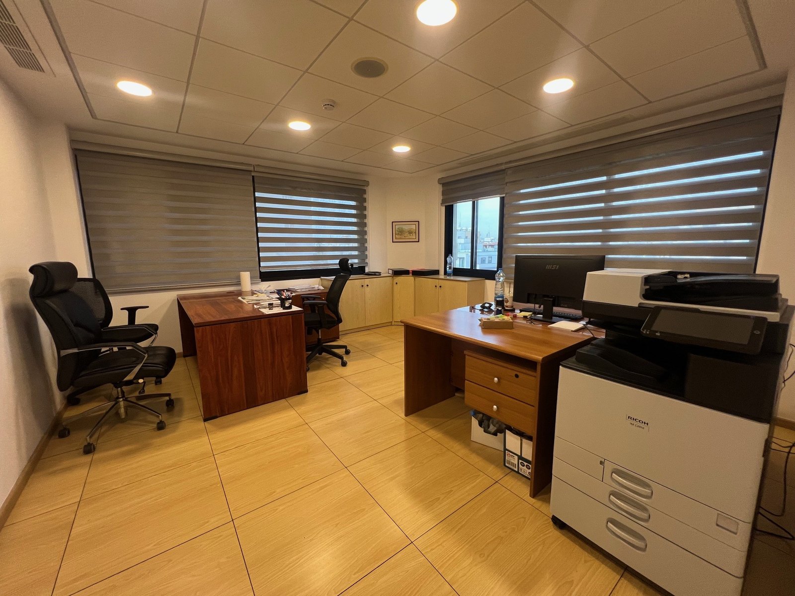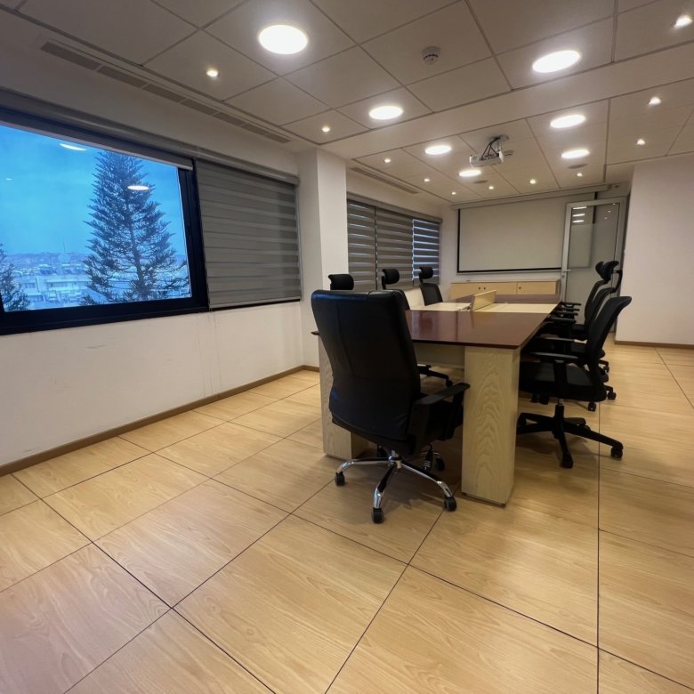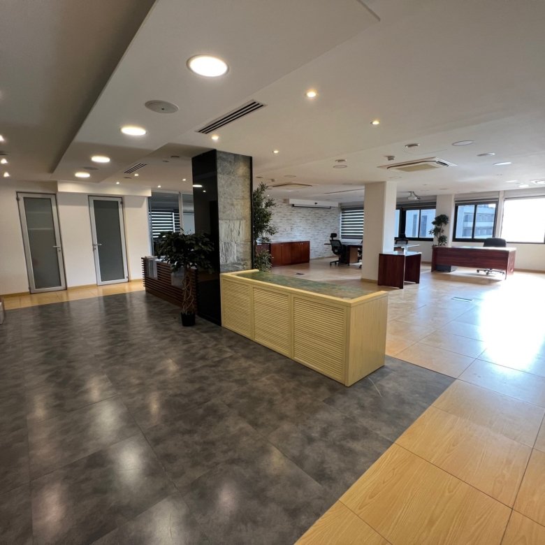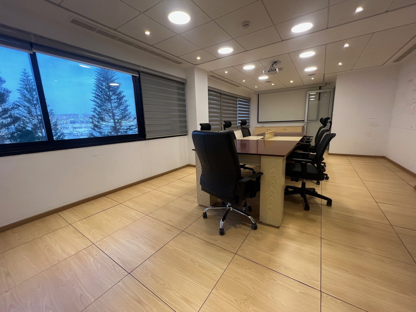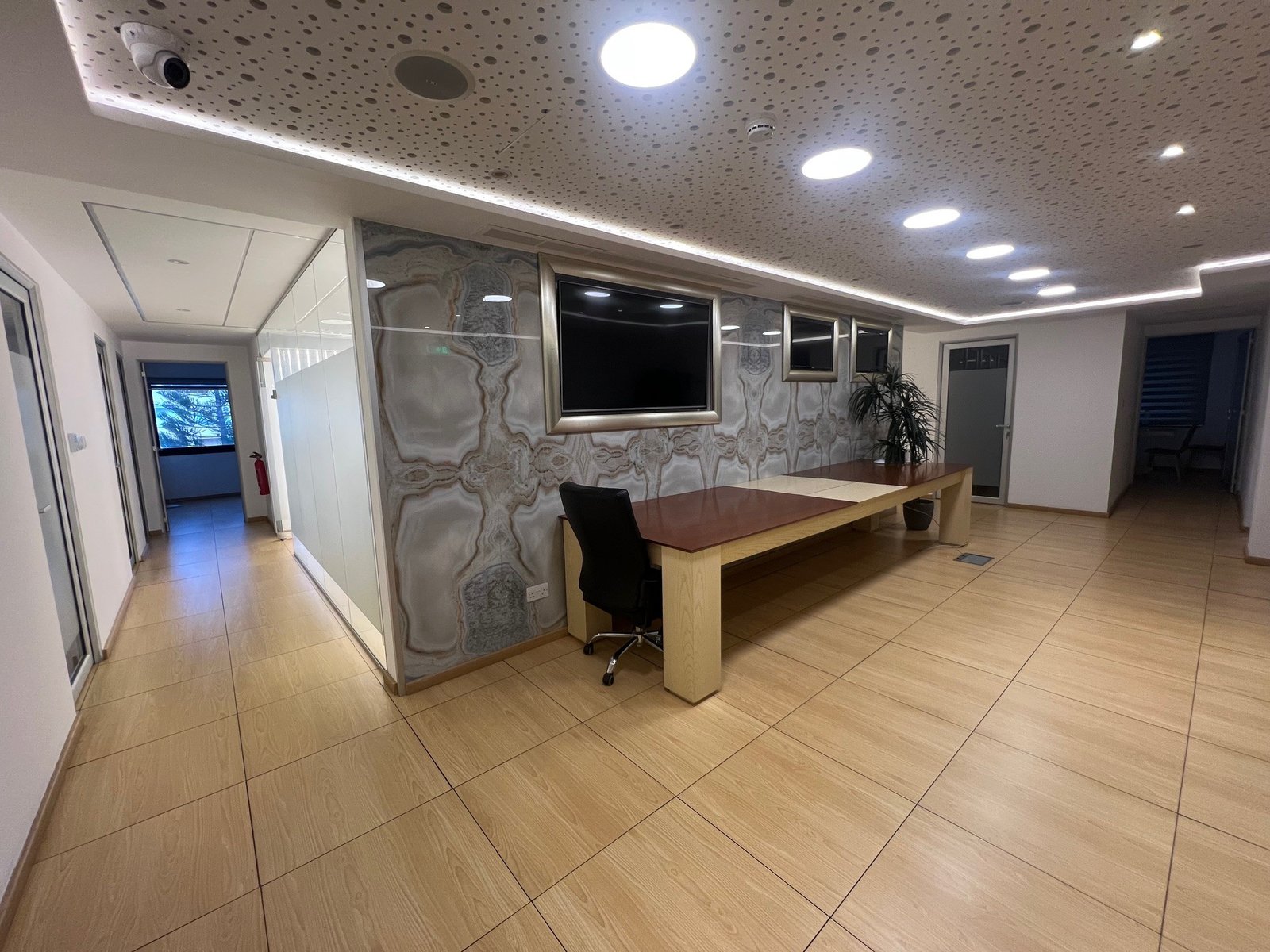 This spacious office space is located in a modern business center in the Neapolis area of Limassol, offering sea, city, and mountain views. The total floor area is 527 m², consisting of two offices. The first office includes a reception area, a large conference room, a smaller meeting room, six separate offices, a server room, storage space, a kitchen with a dining area, and two WCs. The second office features a large open-plan workspace, four separate offices, an executive office with an en-suite WC and shower, a kitchenette, storage space, a server room, and two WCs. Both offices are offered unfurnished and are equipped with central air conditioning with climate control, raised floors, double-glazed thermal windows, LED lighting, high-speed internet with structured cabling, a video intercom system, access control, and security and fire alarm systems. The building includes a main entrance lobby and five allocated parking spaces.