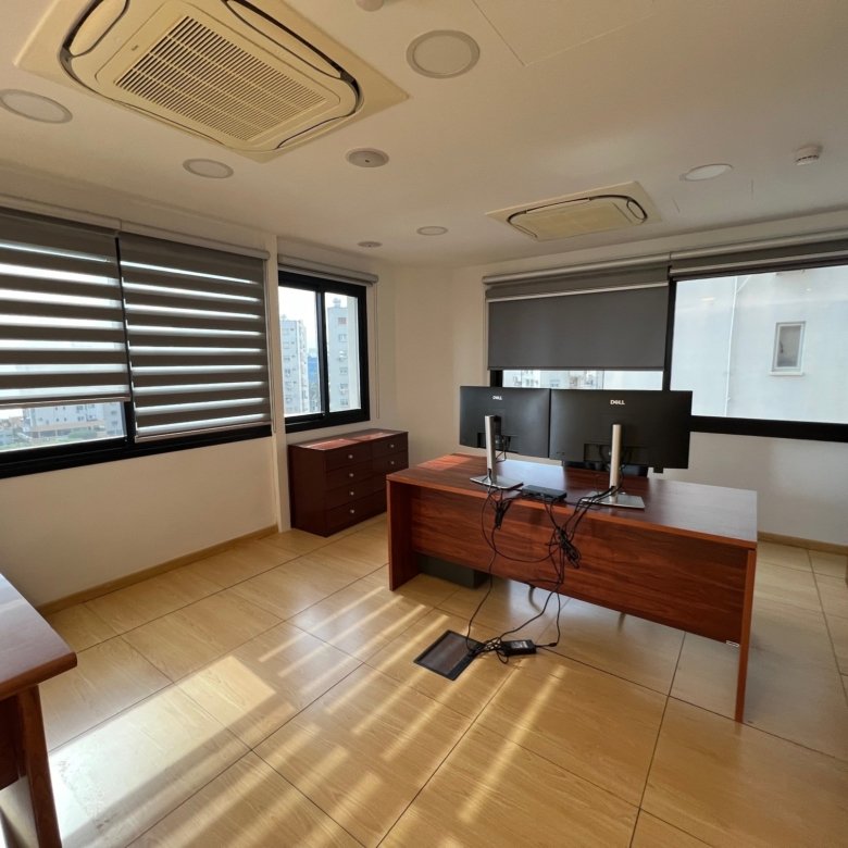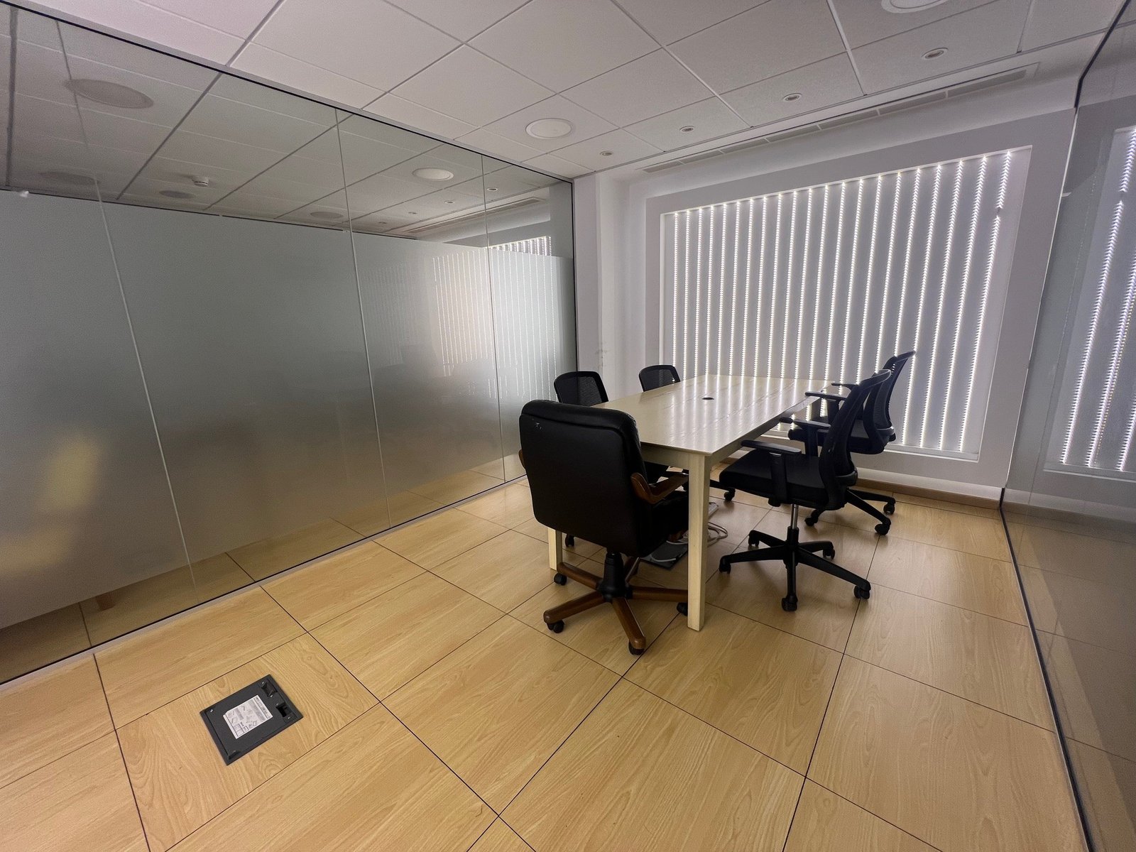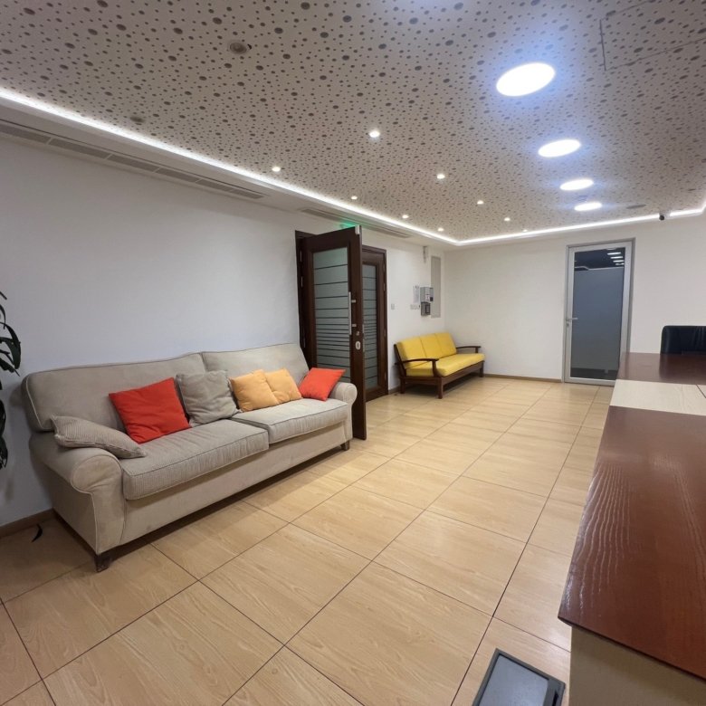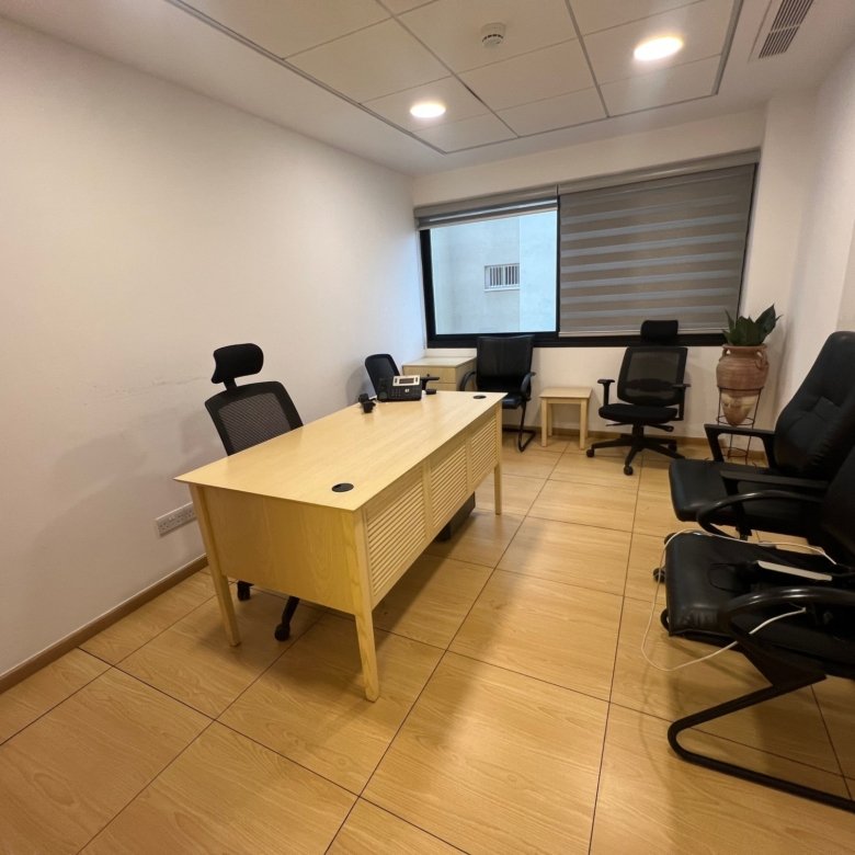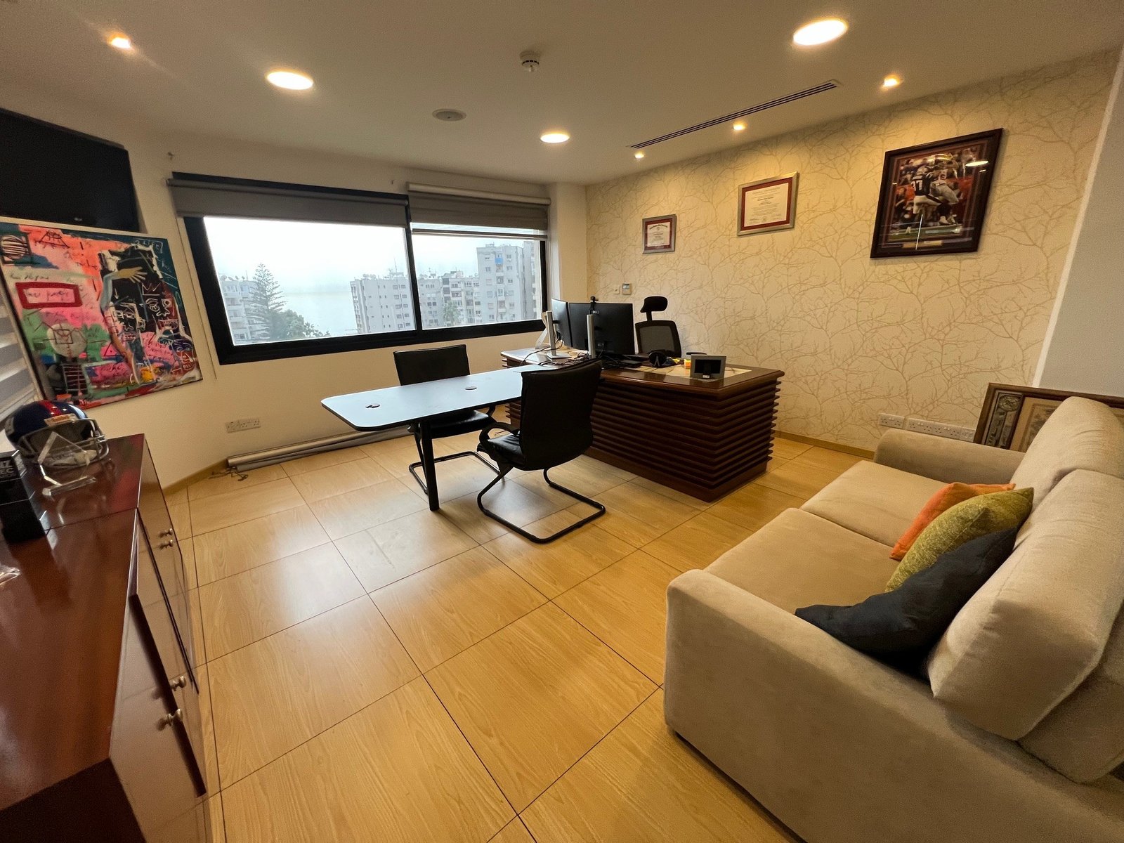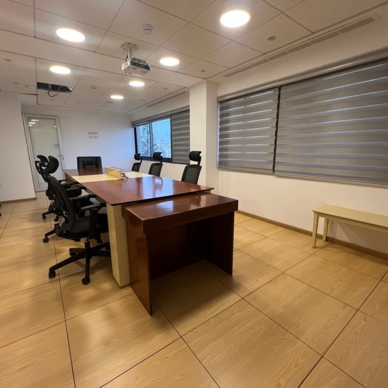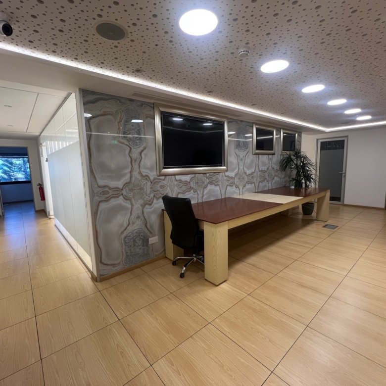 This spacious office space is located in a modern business center in the Neapolis area of Limassol, offering sea, city, and mountain views. The total floor area is 527 m², consisting of two offices. The first office includes a reception area, a large conference room, a smaller meeting room, six separate offices, a server room, storage space, a kitchen with a dining area, and two WCs. The second office features a large open-plan workspace, four separate offices, an executive office with an en-suite WC and shower, a kitchenette, storage space, a server room, and two WCs. Both offices are offered unfurnished and are equipped with central air conditioning with climate control, raised floors, double-glazed thermal windows, LED lighting, high-speed internet with structured cabling, a video intercom system, access control, and security and fire alarm systems. The building includes a main entrance lobby and five allocated parking spaces.