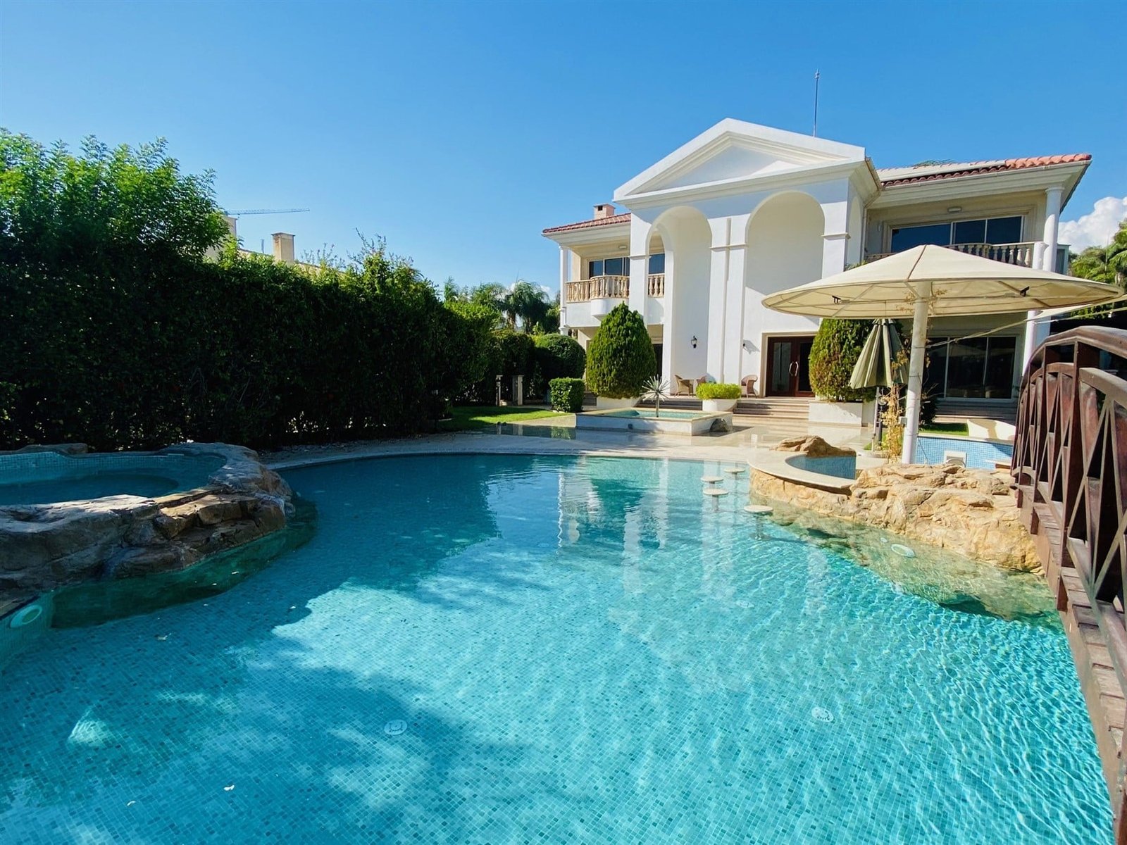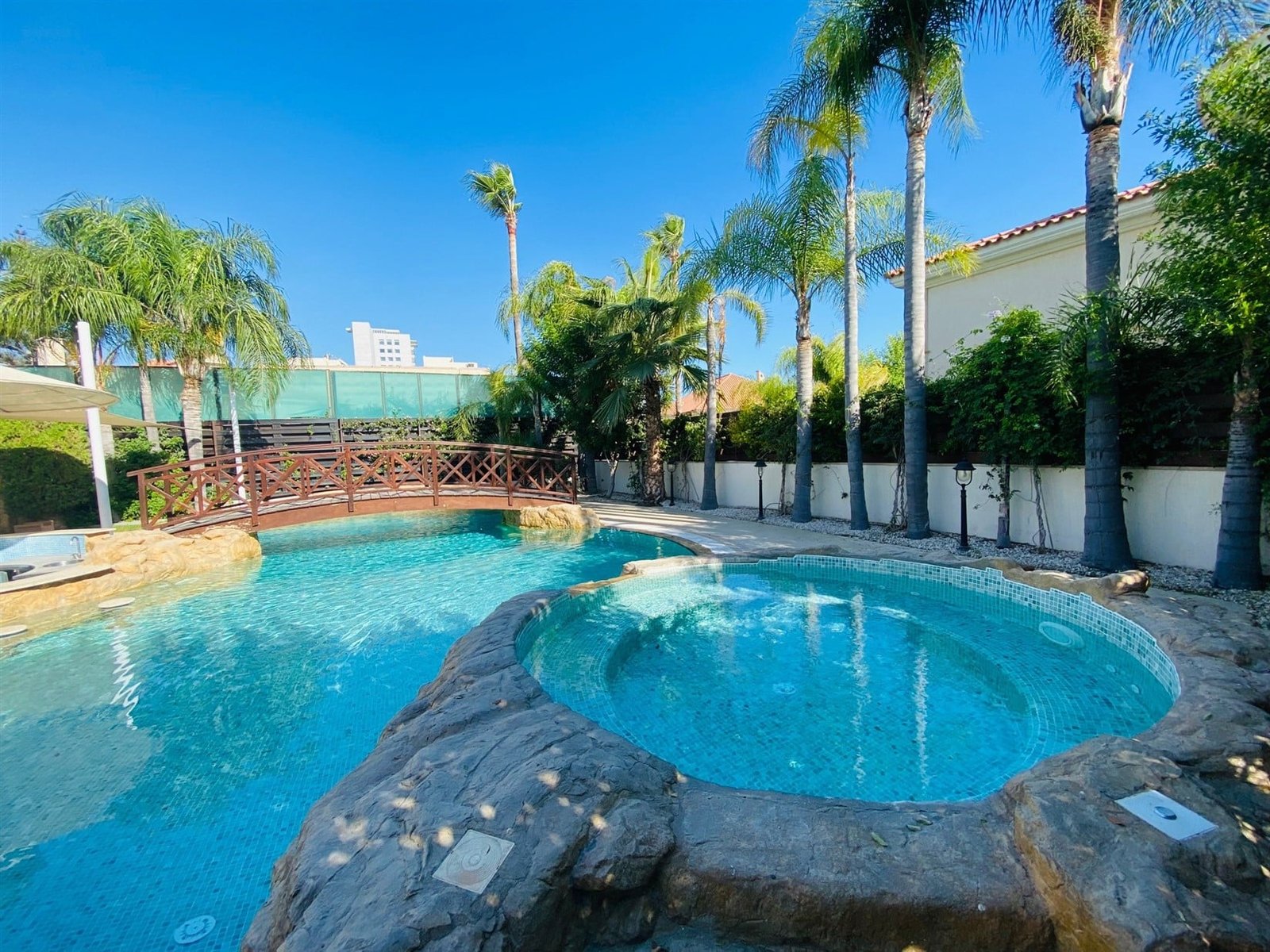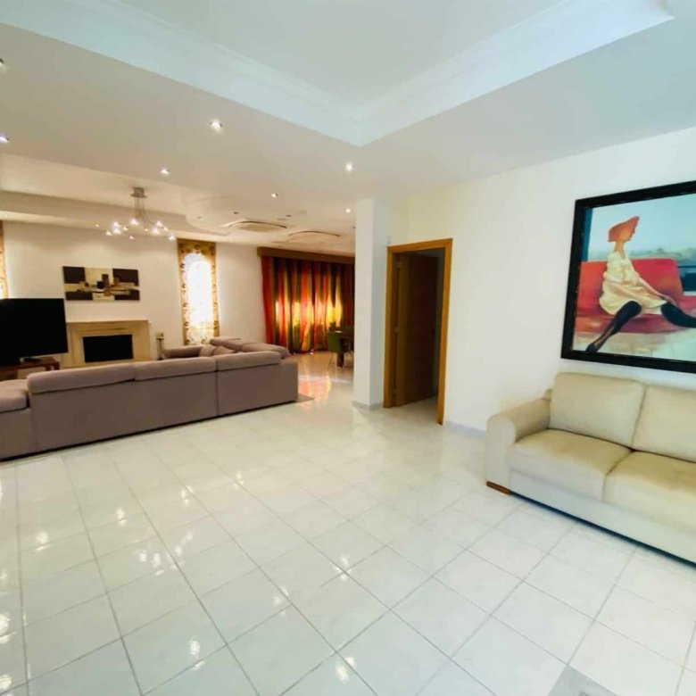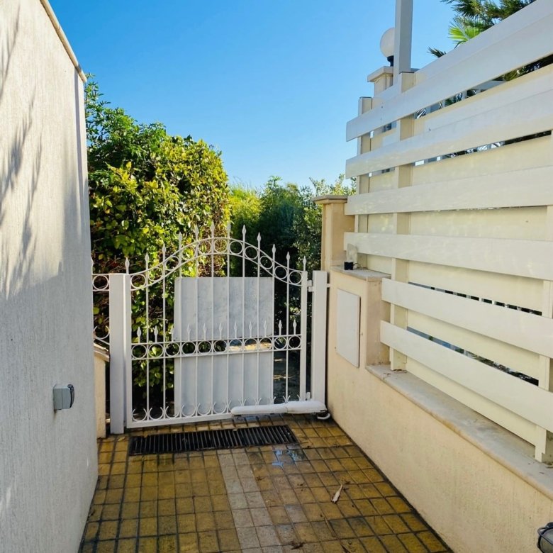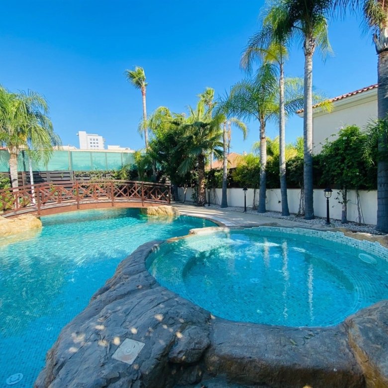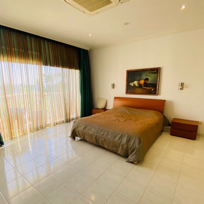 The villa is fully furnished and equipped, with a central air conditioning system (Daikin), underfloor heating (water), double-glazed windows, expensive Versace tiles, solar panels for hot water and electricity, an alarm system, an intercom, and water pressure system. Outside of the villa, there is a private swimming pool with a jacuzzi, pool bar, decorative fountain, beautiful mature garden with fruit trees, covered sitting area with BBQ, uncovered parking, private direct passage to the beach, and electric gates with remote control.