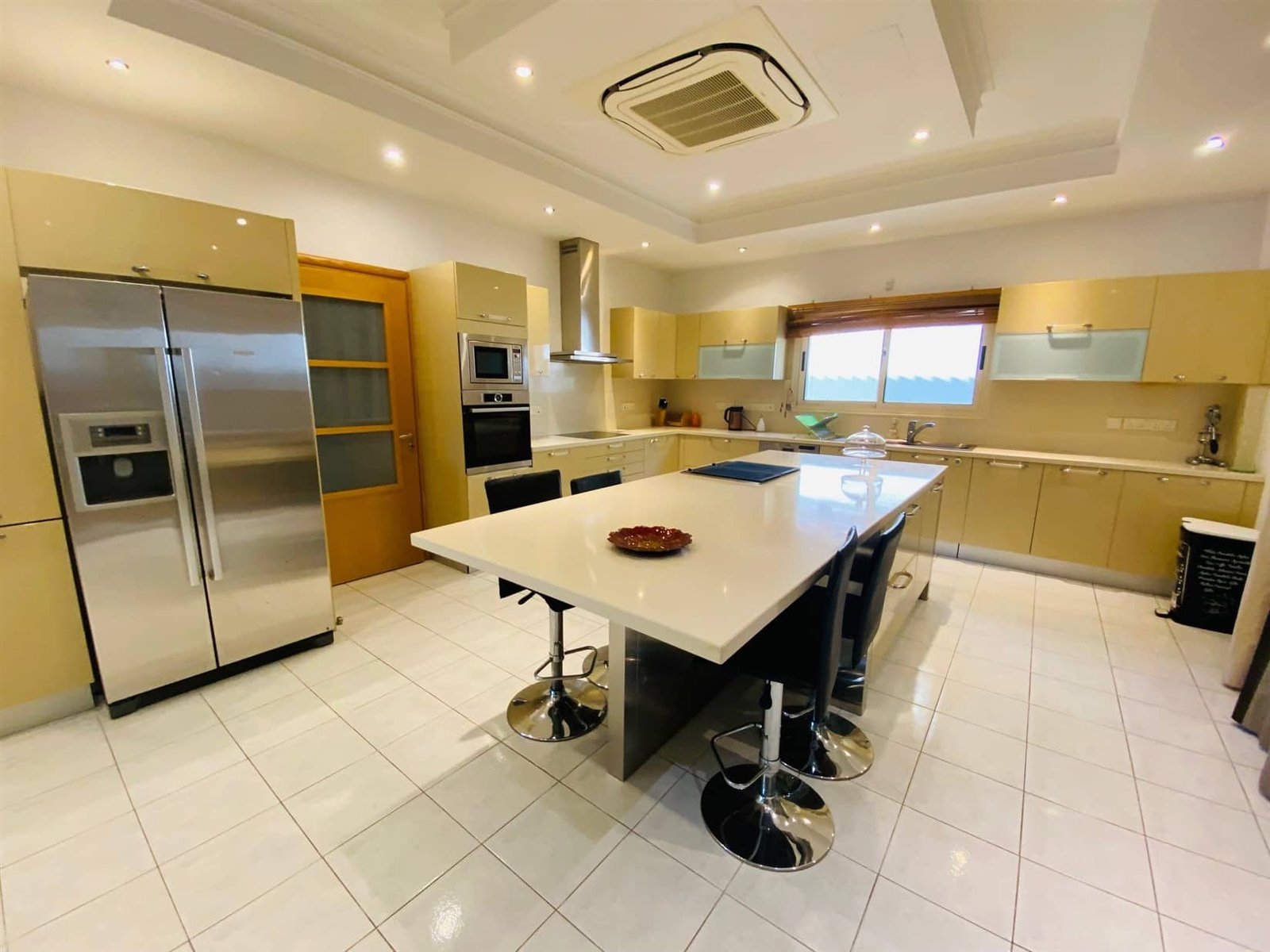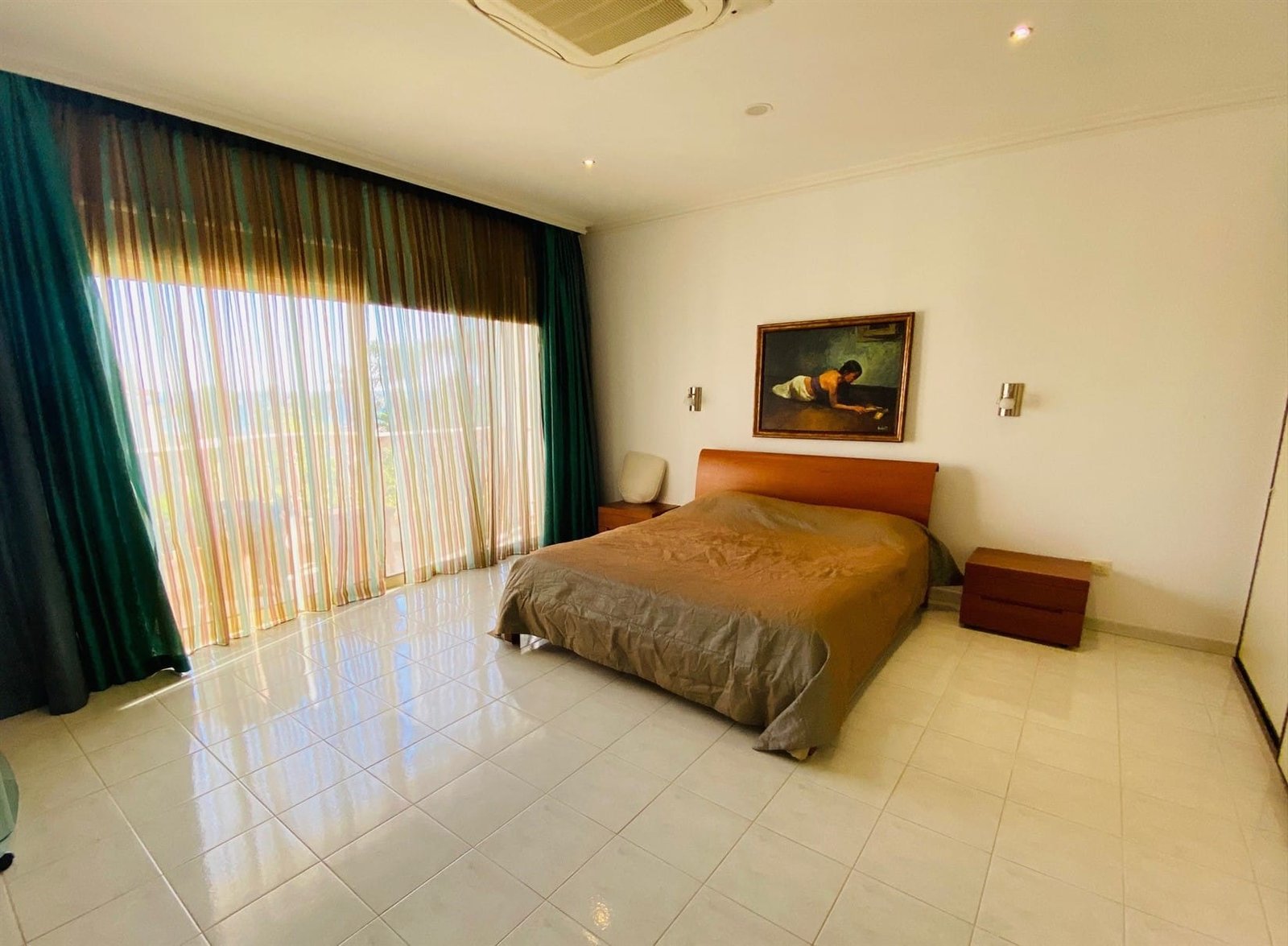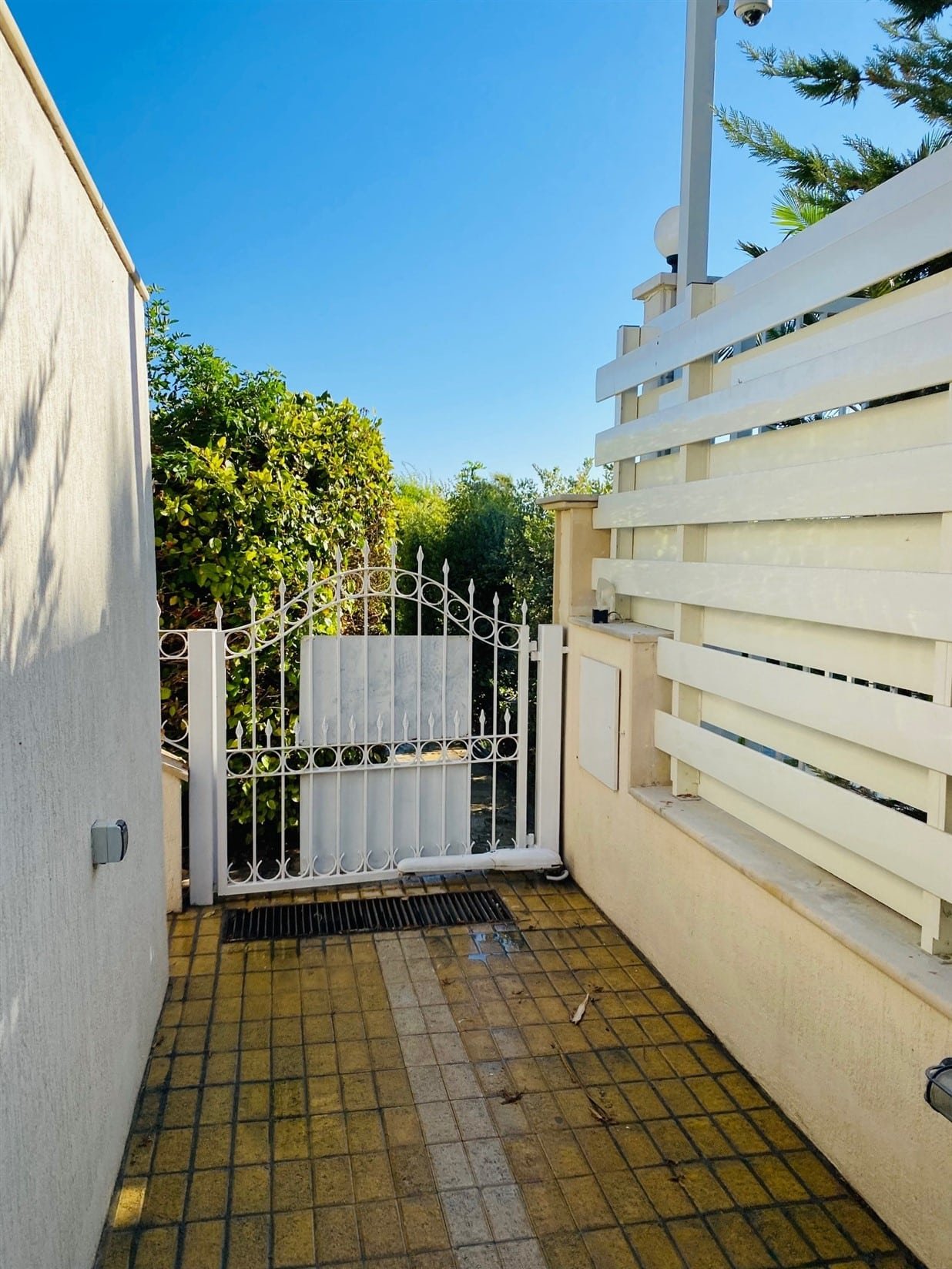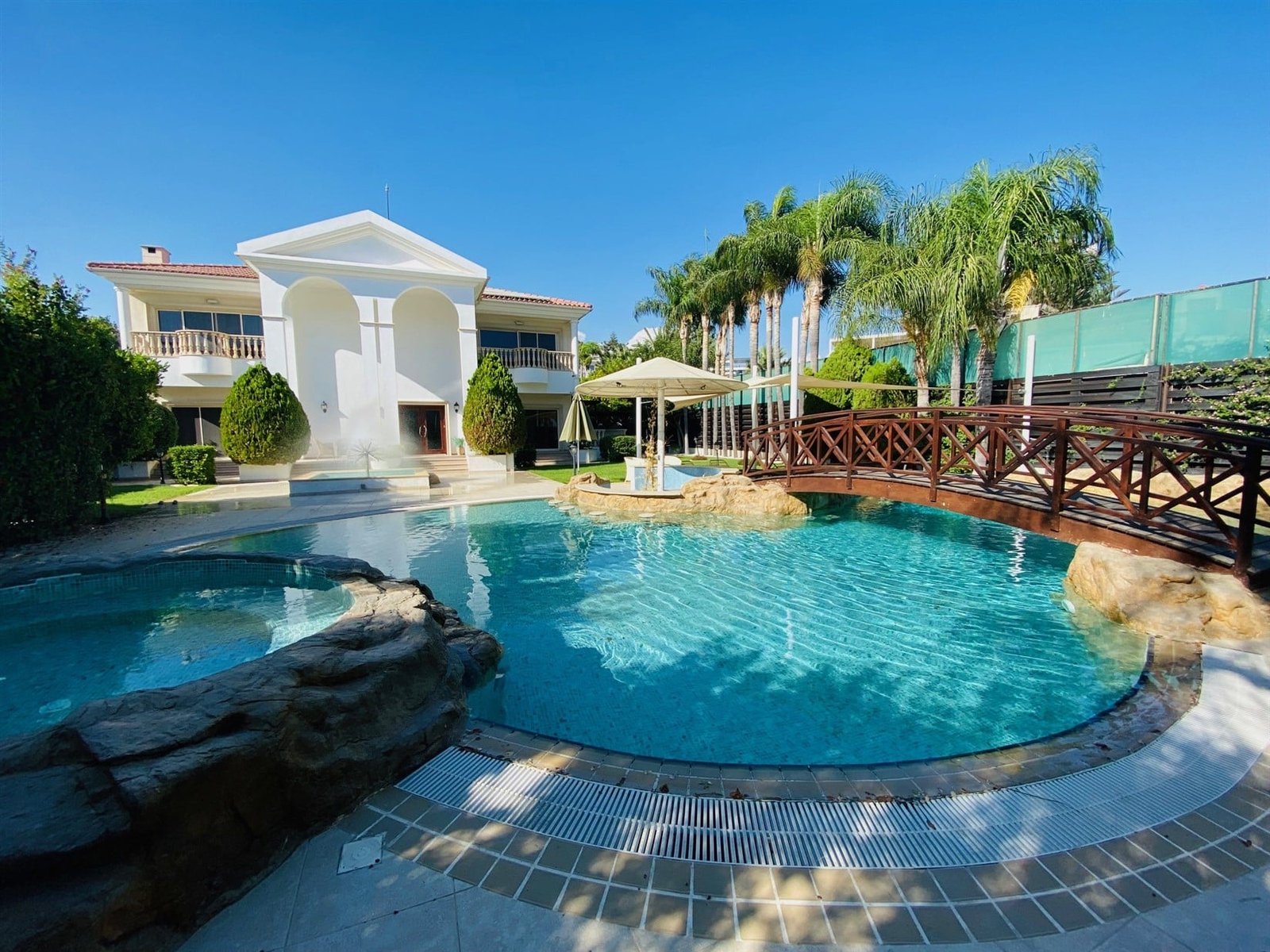 The villa is fully furnished and equipped, with a central air conditioning system (Daikin), underfloor heating (water), double-glazed windows, expensive Versace tiles, solar panels for hot water and electricity, an alarm system, an intercom, and water pressure system. Outside of the villa, there is a private swimming pool with a jacuzzi, pool bar, decorative fountain, beautiful mature garden with fruit trees, covered sitting area with BBQ, uncovered parking, private direct passage to the beach, and electric gates with remote control.