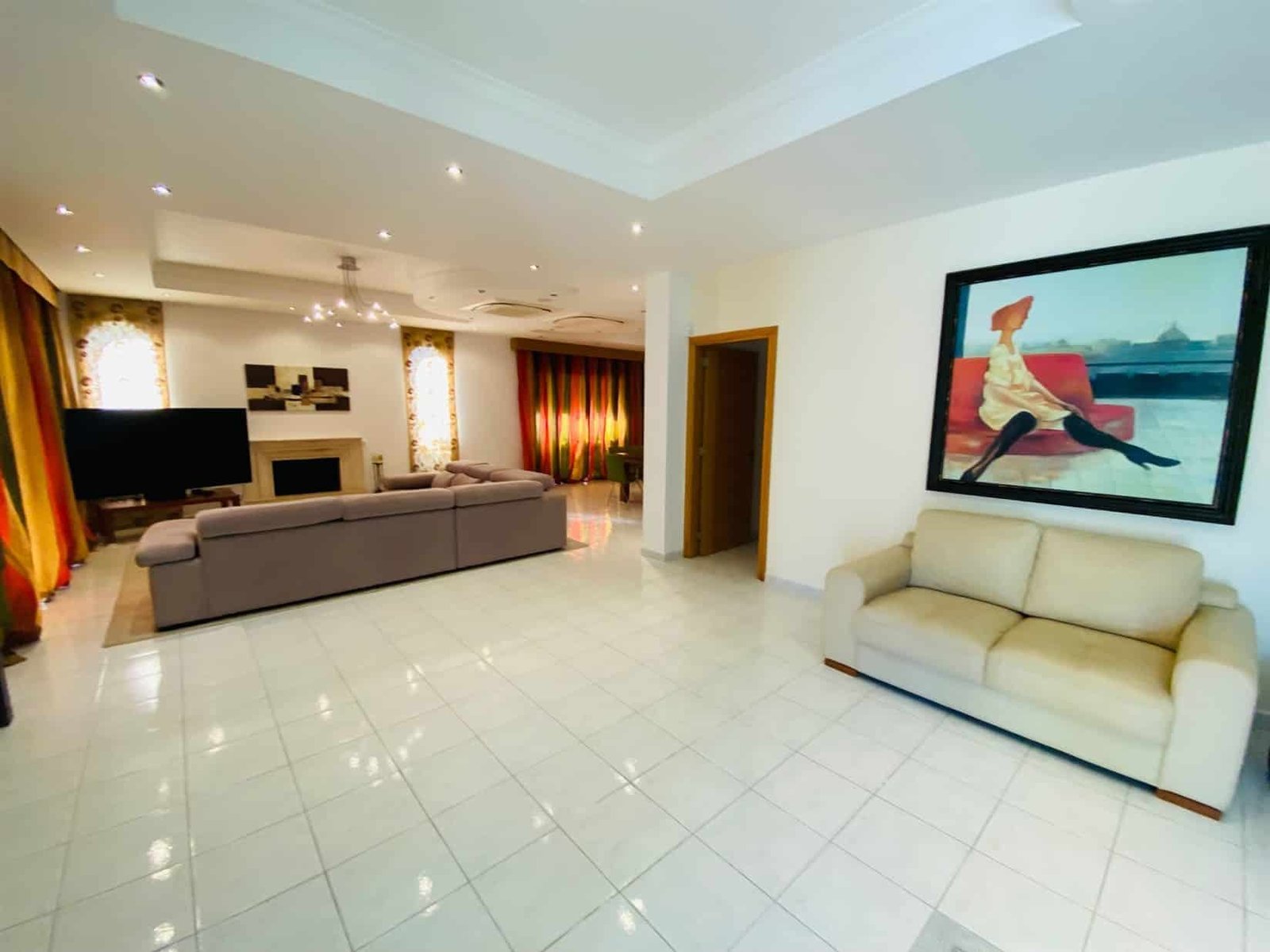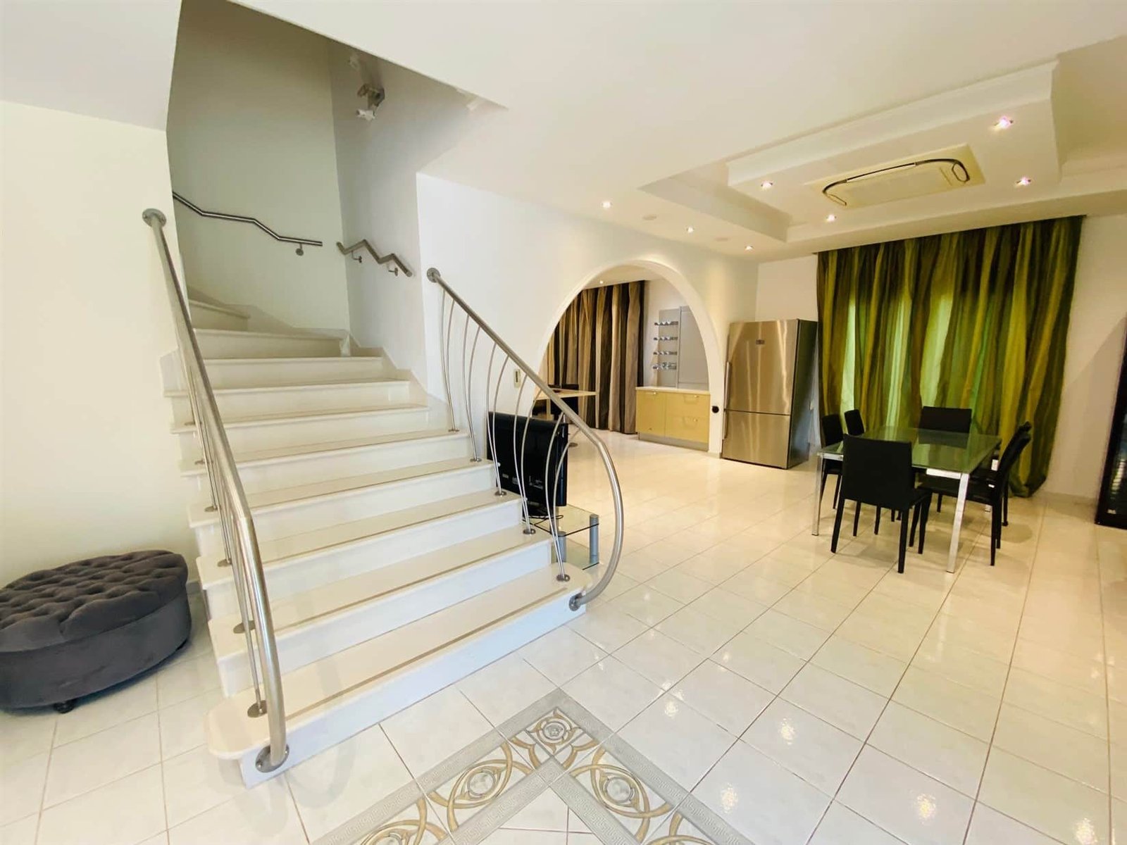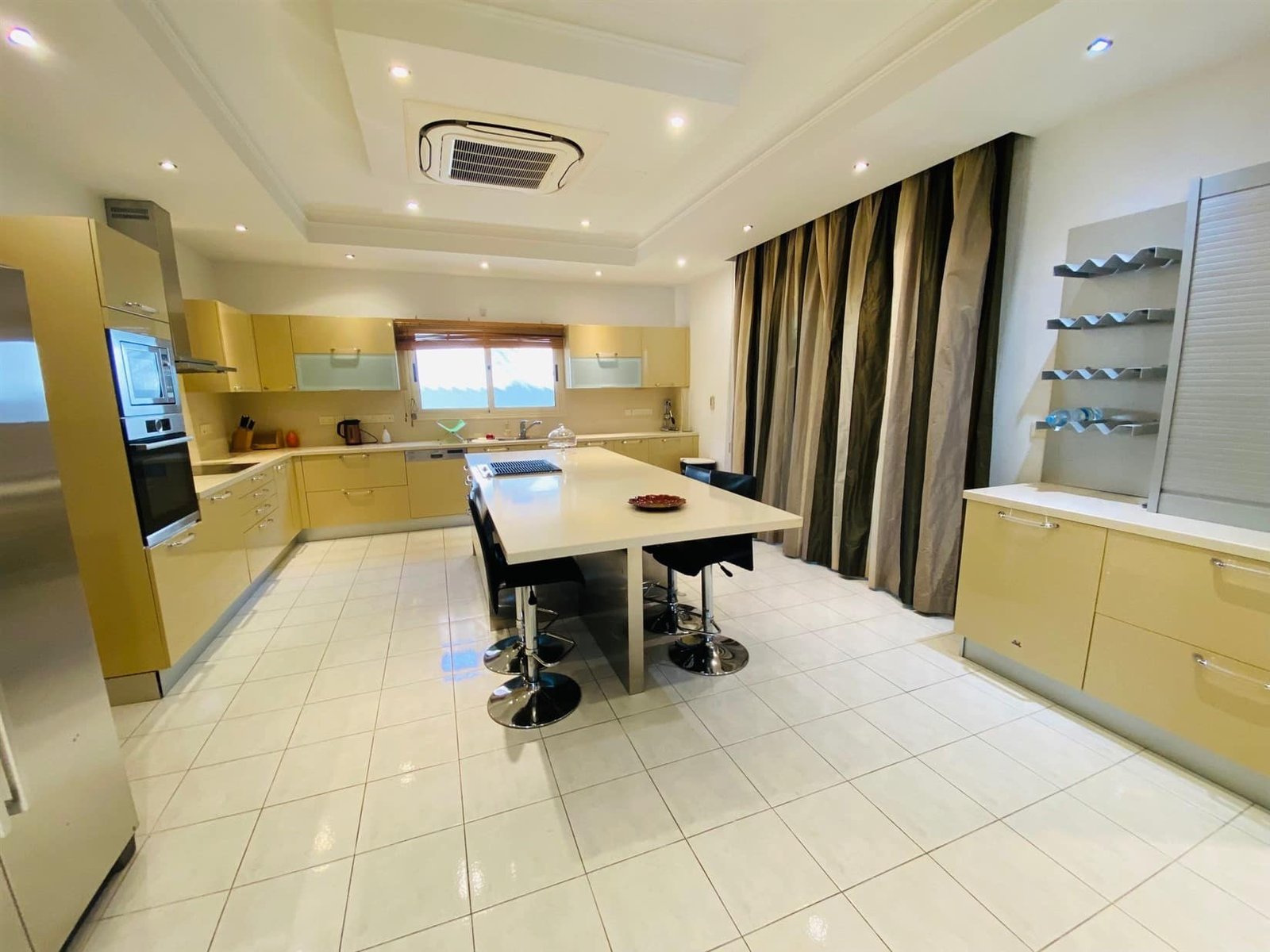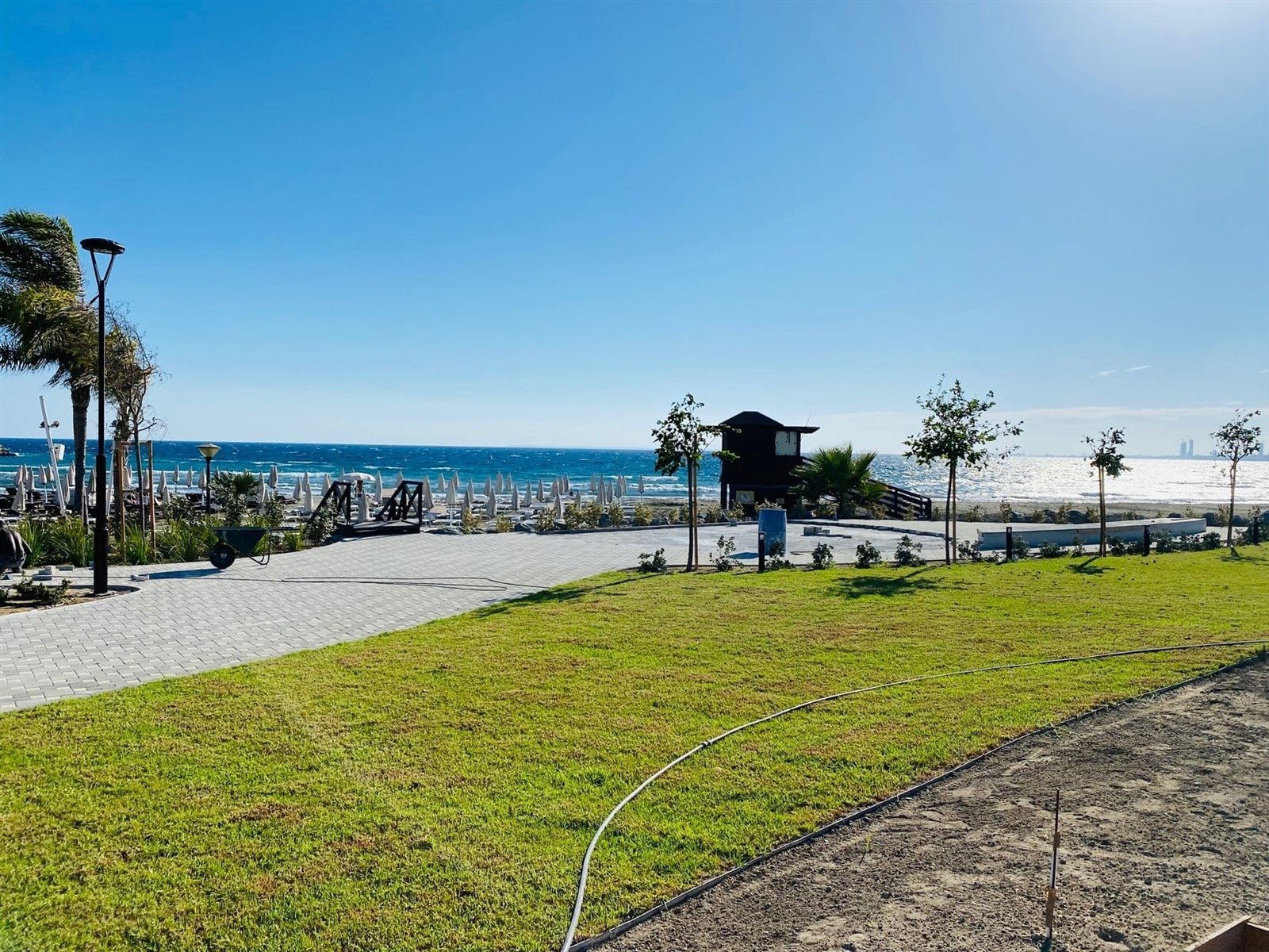 The villa is fully furnished and equipped, with a central air conditioning system (Daikin), underfloor heating (water), double-glazed windows, expensive Versace tiles, solar panels for hot water and electricity, an alarm system, an intercom, and water pressure system. Outside of the villa, there is a private swimming pool with a jacuzzi, pool bar, decorative fountain, beautiful mature garden with fruit trees, covered sitting area with BBQ, uncovered parking, private direct passage to the beach, and electric gates with remote control.