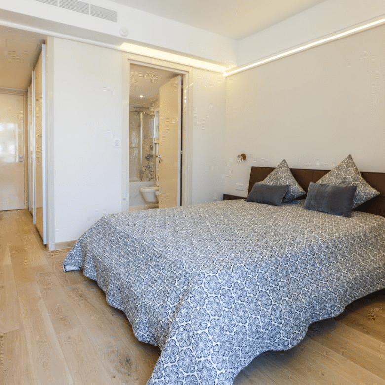The design of the apartments is concise, simple and ideal, where the interior itself becomes functional. The open plan combines a bright and cozy living room with a spacious dining room and kitchen. The dining area with the panoramic windows is easily transformed into an open terrace surrounded by eucalyptus trees.