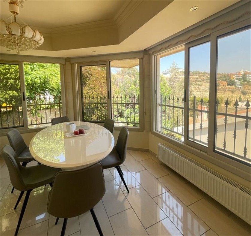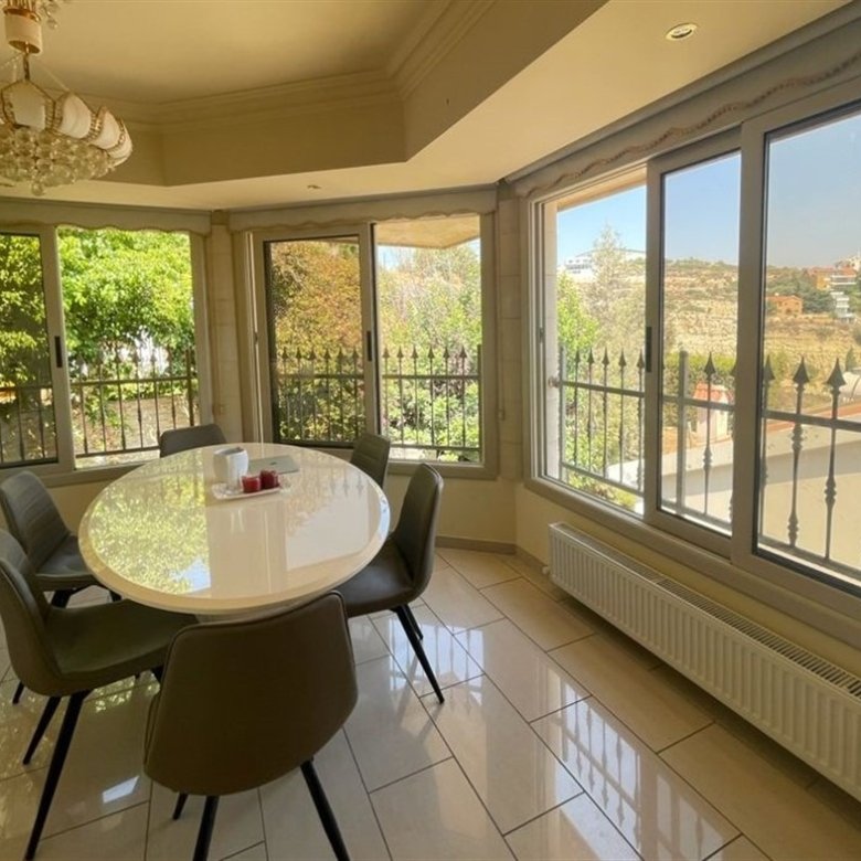 On the ground floor, there is a huge living room and a beautiful dining room with wonderful furniture, a separate kitchen, a study, and a bedroom en-suite.