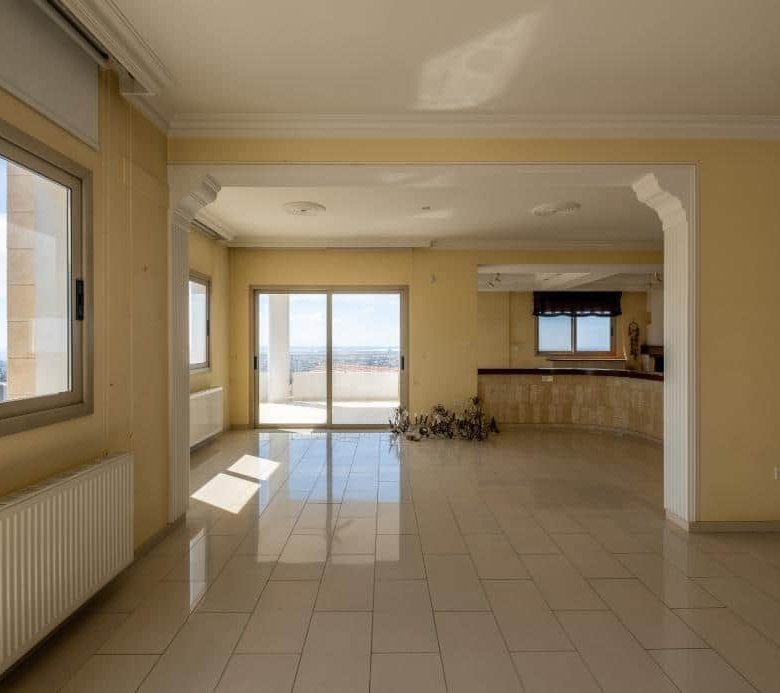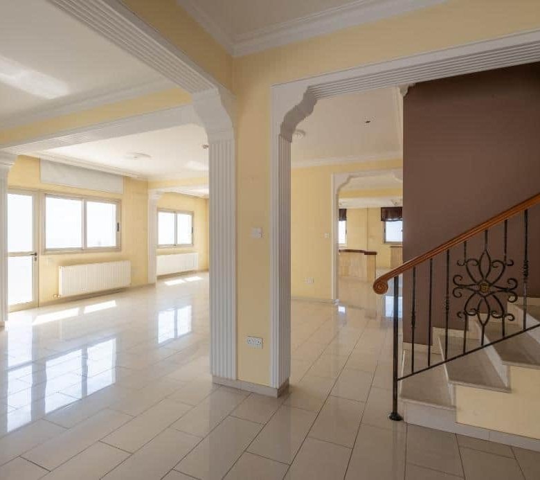 This four-story house with a swimming pool is located in Agia Fyla, Limassol just 1.5km from Agia Fylaxi’s Lyceum. The ground floor spans 124 m2 and includes an entrance hall, living room with a fireplace, dining area, kitchen, guest toilet, and covered verandas. The first floor, covering 114 m2, features four bedrooms (including an en-suite master bedroom), a bathroom with a toilet, and covered verandas.