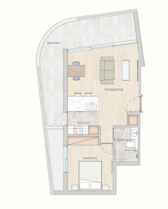 This unique project is located in the Katholiki area of Limassol, close to all amenities including shops, supermarkets, restaurants, and cafes. The complex offers a gated community with a children’s playground, communal swimming pool, landscaped gardens, outdoor sports facilities, gym, and sauna. The apartment features an open-plan living area, 1 bedroom, 1 bathroom, and a covered veranda.