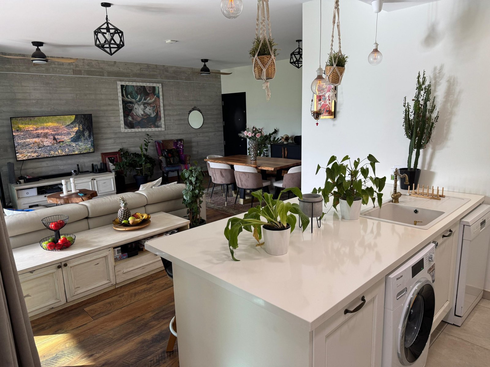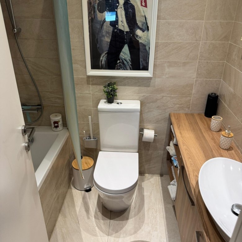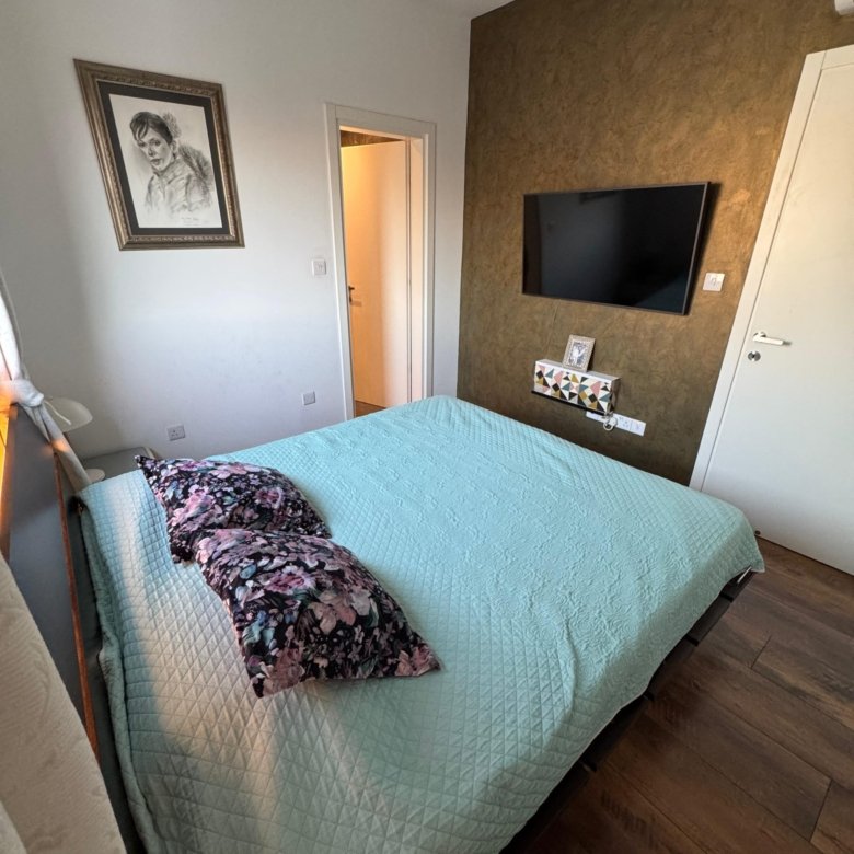 The layout includes a spacious master bedroom with a private shower, a shared bathroom with a bathtub, and a separate guest toilet. Equipped with smart home technology, the apartment offers remote control for lighting, water heating, and door access. Air conditioning and solar panels further enhance energy efficiency.