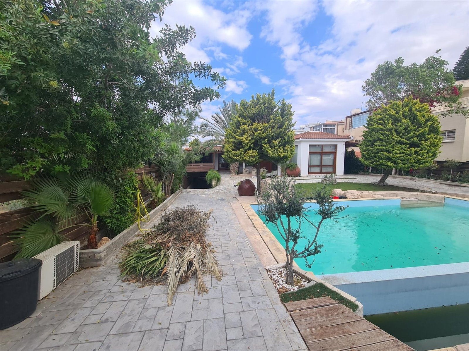 The house is located on a large size plot with a maturely landscaped garden and a swimming pool. It comprises an open-plan kitchen, a spacious living and dining area, and five bedrooms all with en-suite bathrooms.